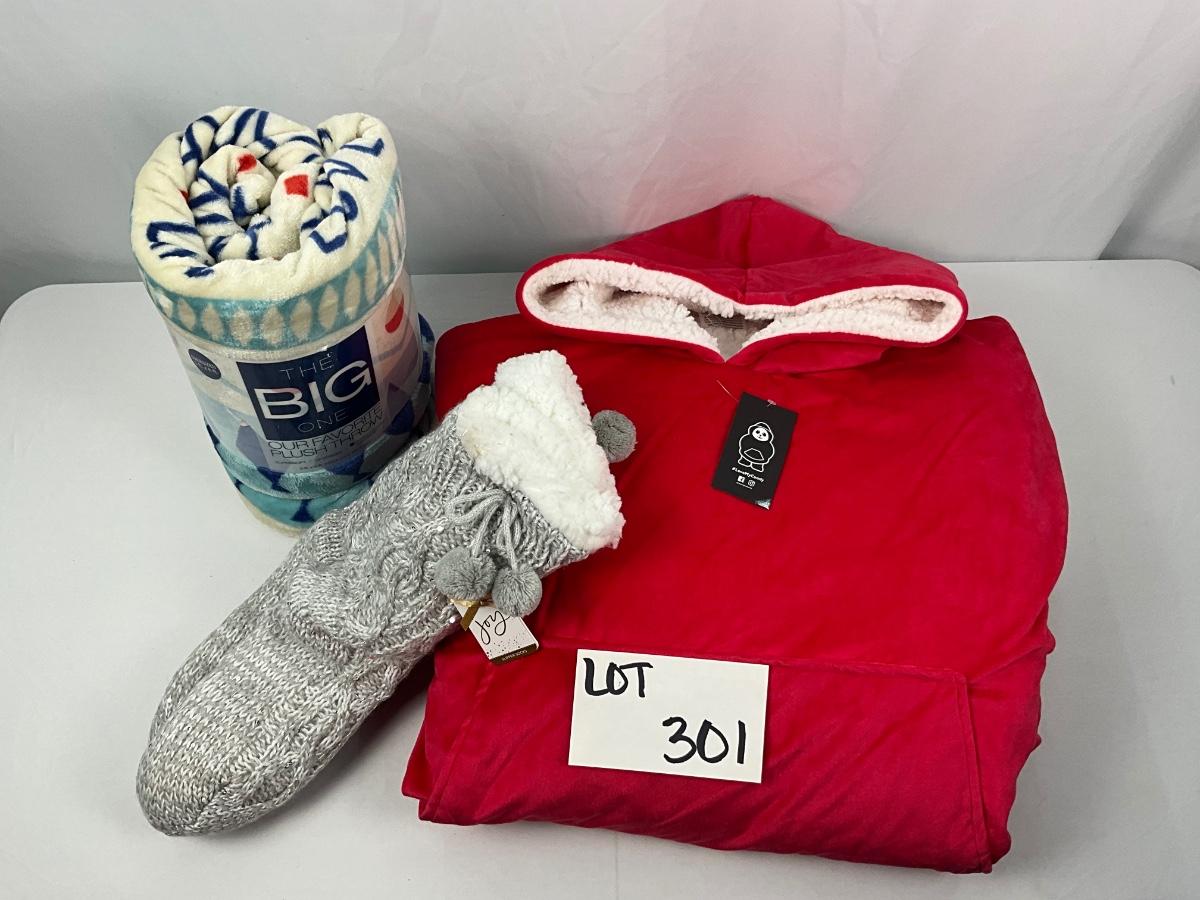 Lot H 301 NWT The Comfy Original Blanket Sweatshirt Slipper Socks and Throw Blanket