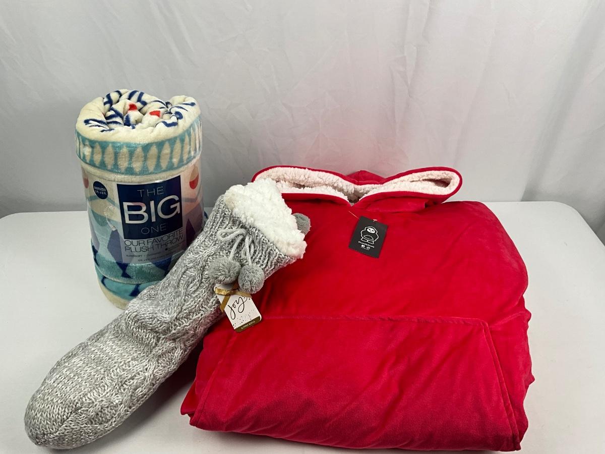 New With Tags The Comfy Original Sweatshirt Blanket. Pair of New slipper socks. New in package throw blanket.