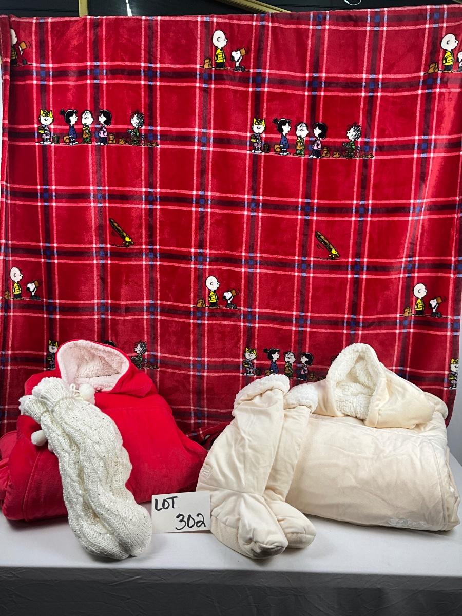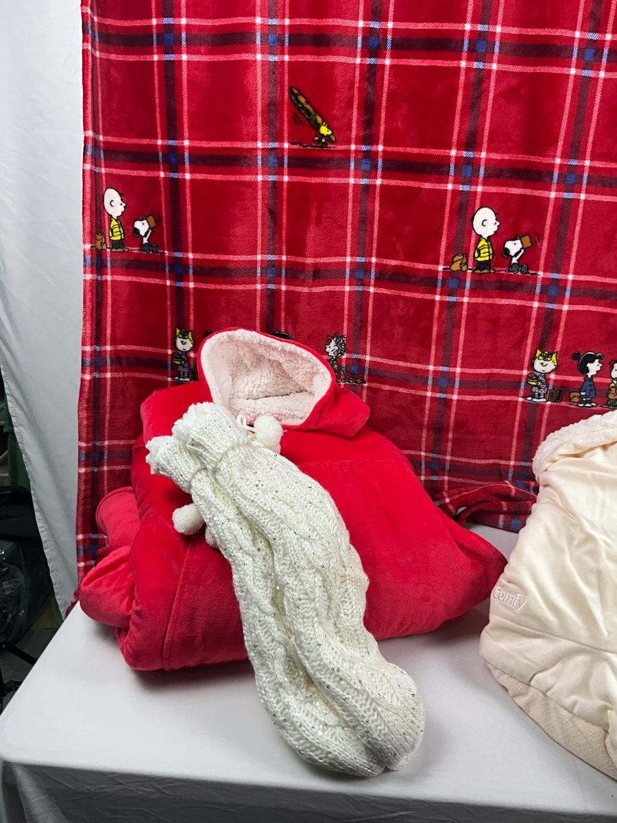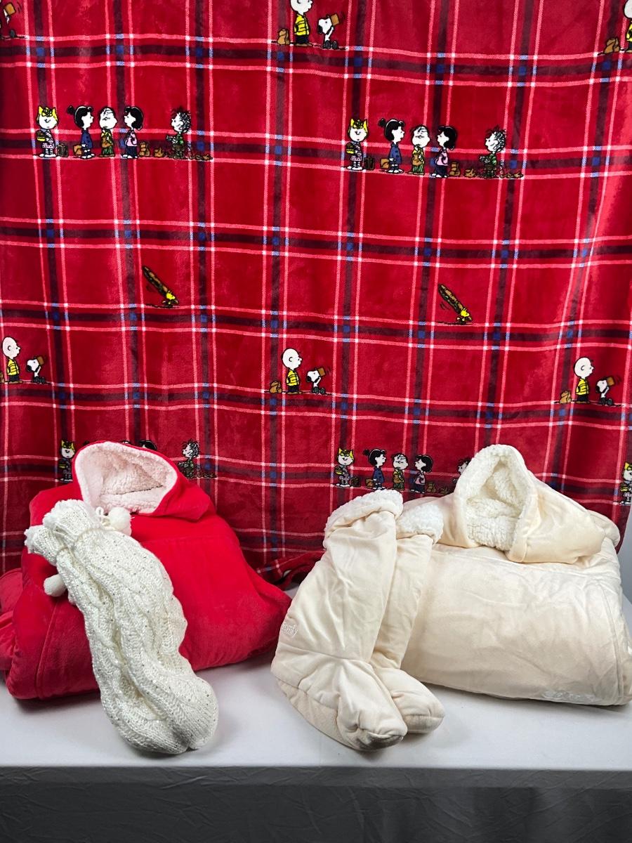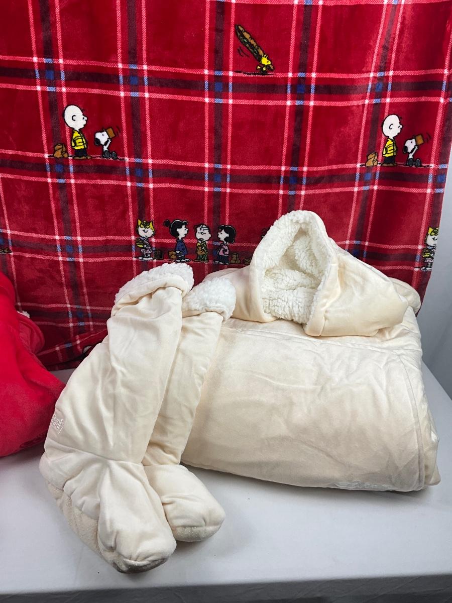 Two The Comfy Original blanket sweatshirts. Pair of The Comfy Original slipper socks. Peanuts throw blanket. Cream colored throw blanket.