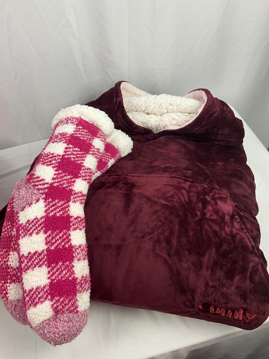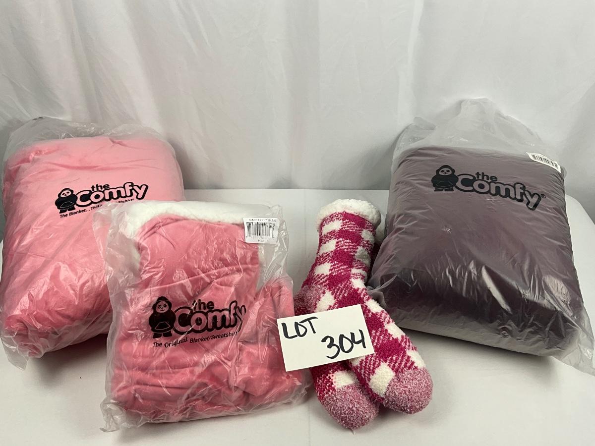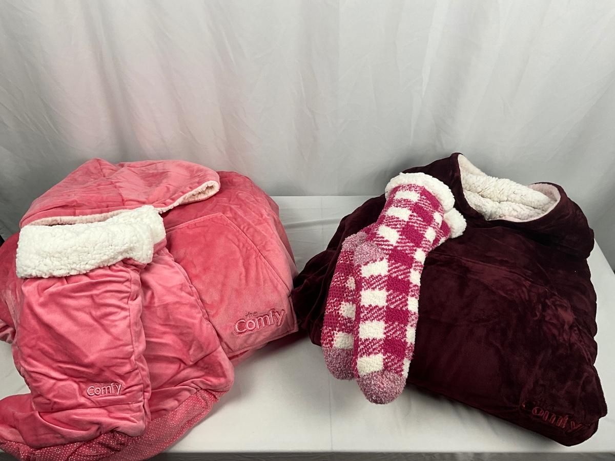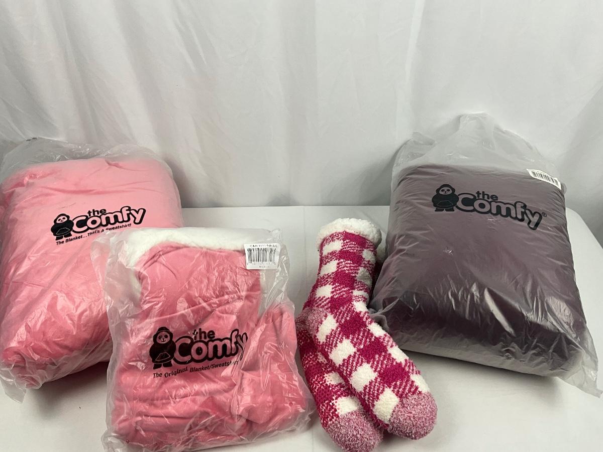 New in package Two The Comfy Original Blanket Sweatshirts. New in package The Comfy Original slipper socks. Pair of new slipper socks.