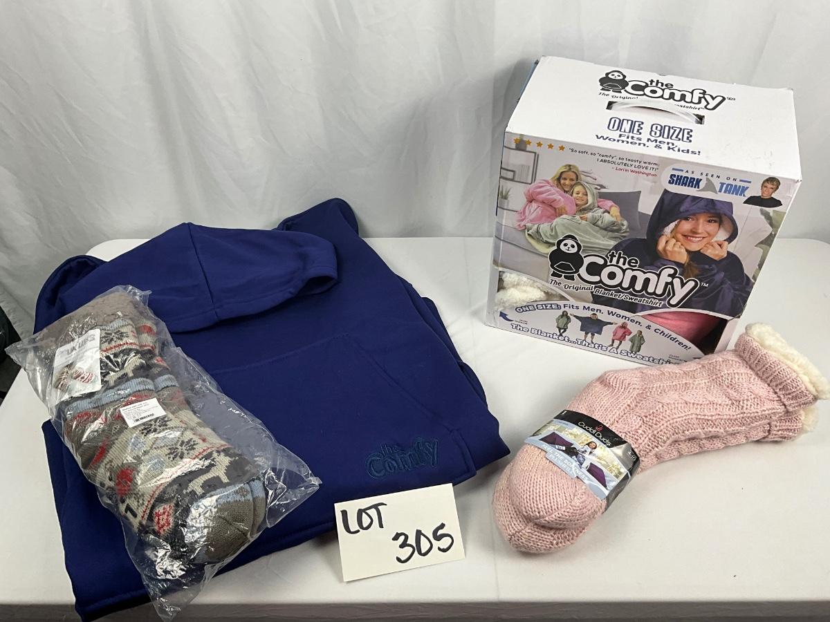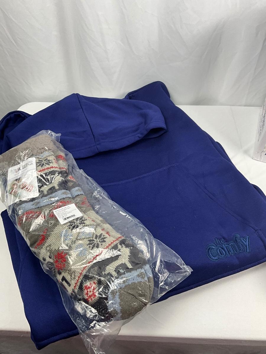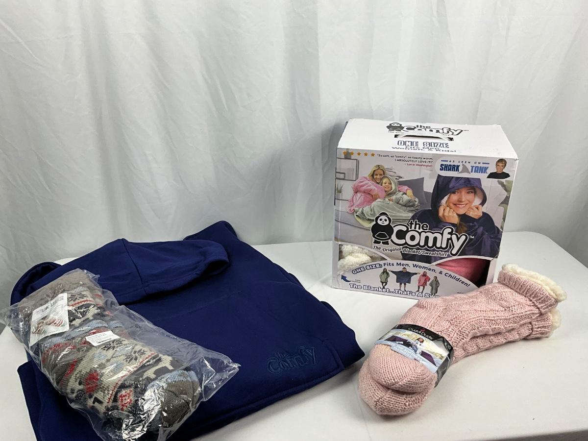 New in Box The Comfy Original fleece lined blanket sweatshirt. The Comfy Blanket sweatshirt (not fleece lined), pair of Cuddleduds slipper socks and pair of slipper socks.