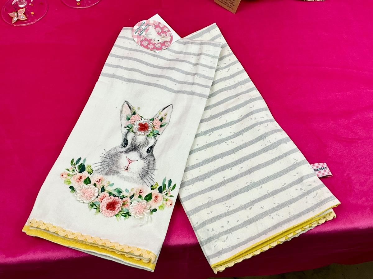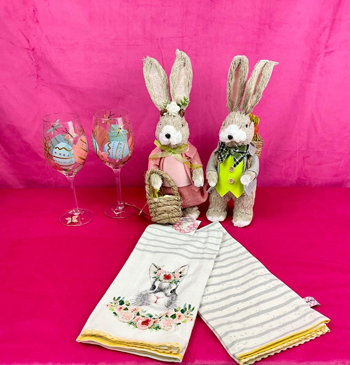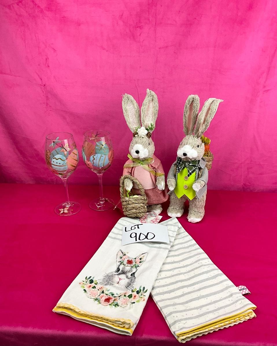 The lot contains 2 handcrafted bunnies that are 14” tall, 2 hand painted stemmed glassware with eggs, 2 new tea towels.
