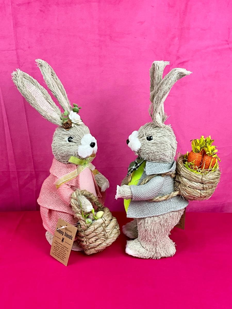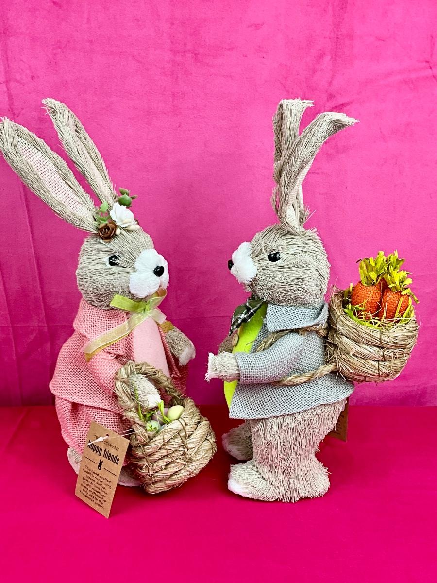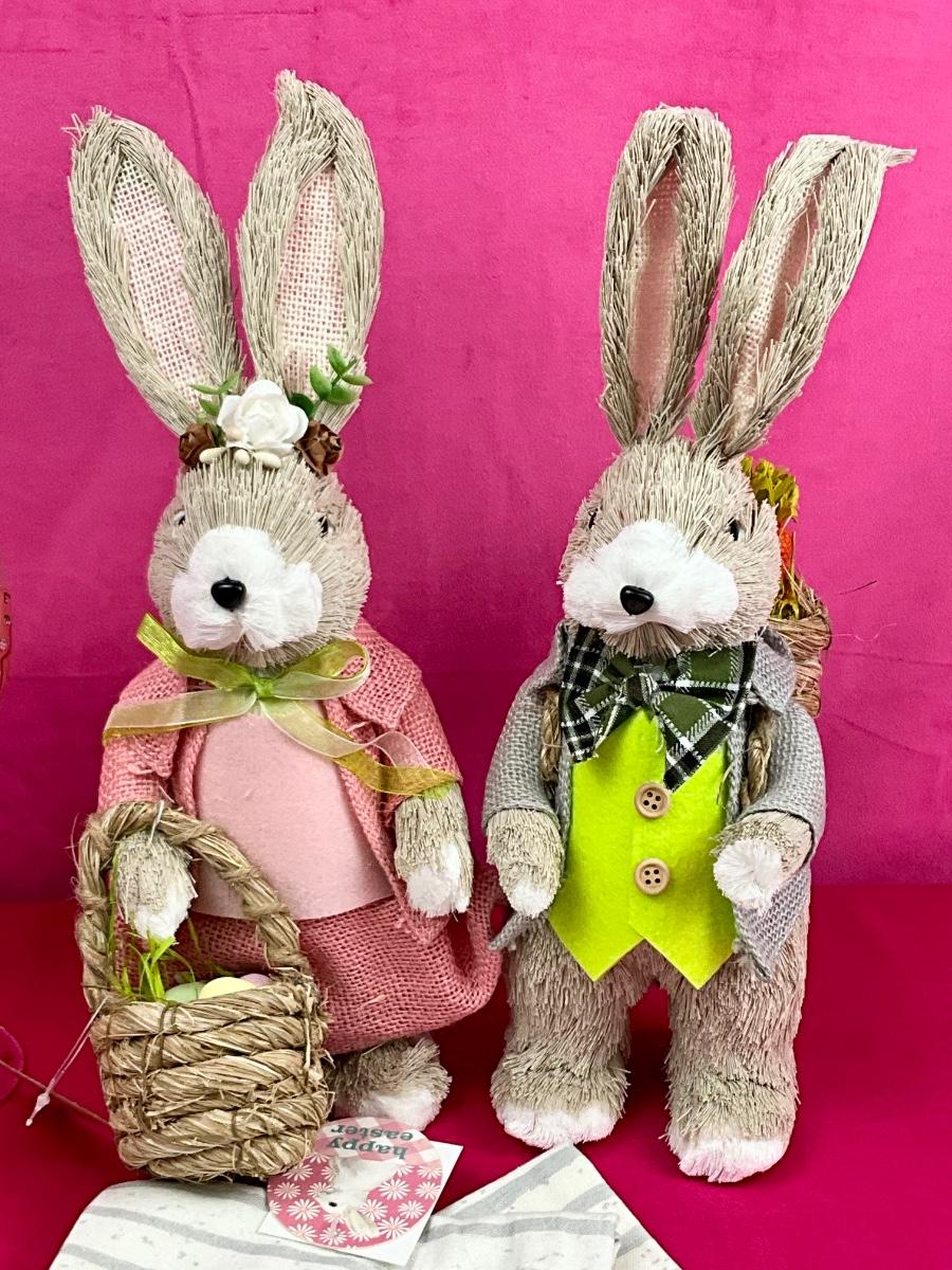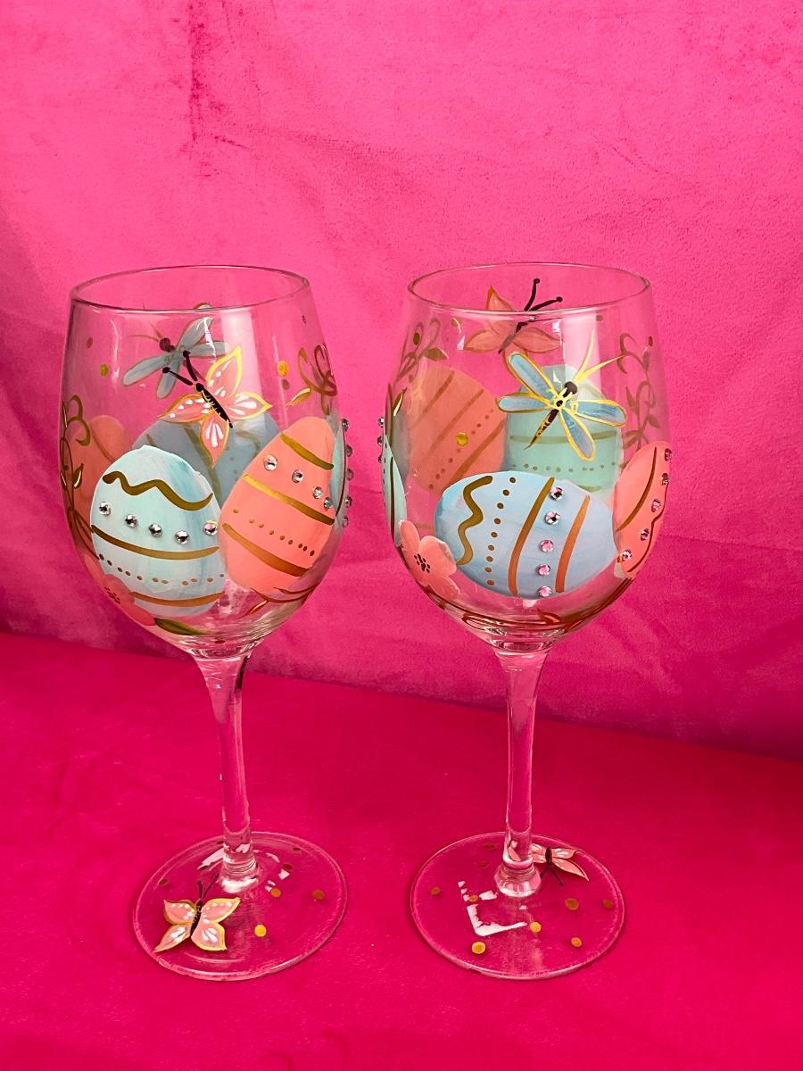 The lot contains 2 handcrafted bunnies that are 14” tall, 2 hand painted stemmed glassware with eggs, 2 new tea towels.