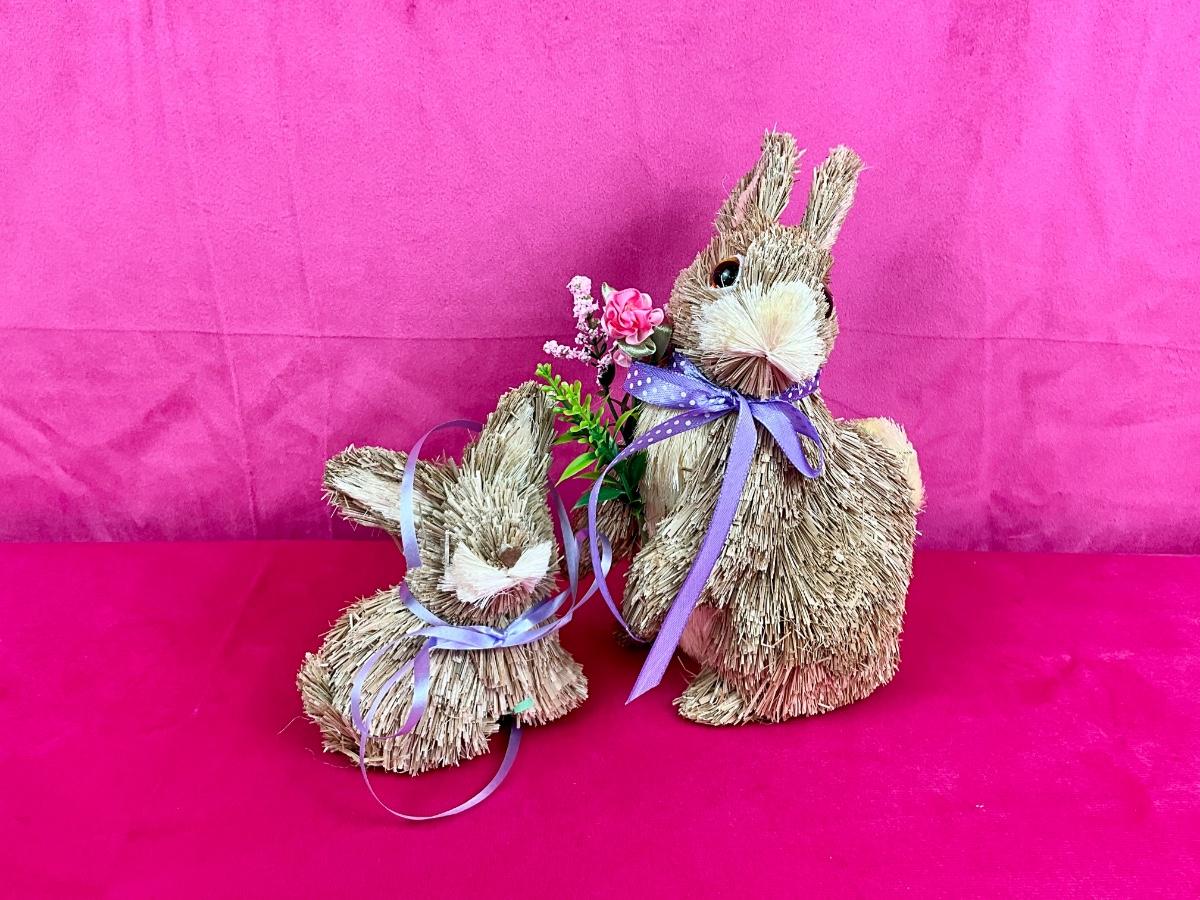The wreath is from Pier One, the bunnies are made of straw. The larger bunny is 8” high and the smaller bunny is 4.5” high.