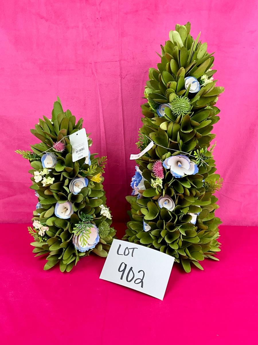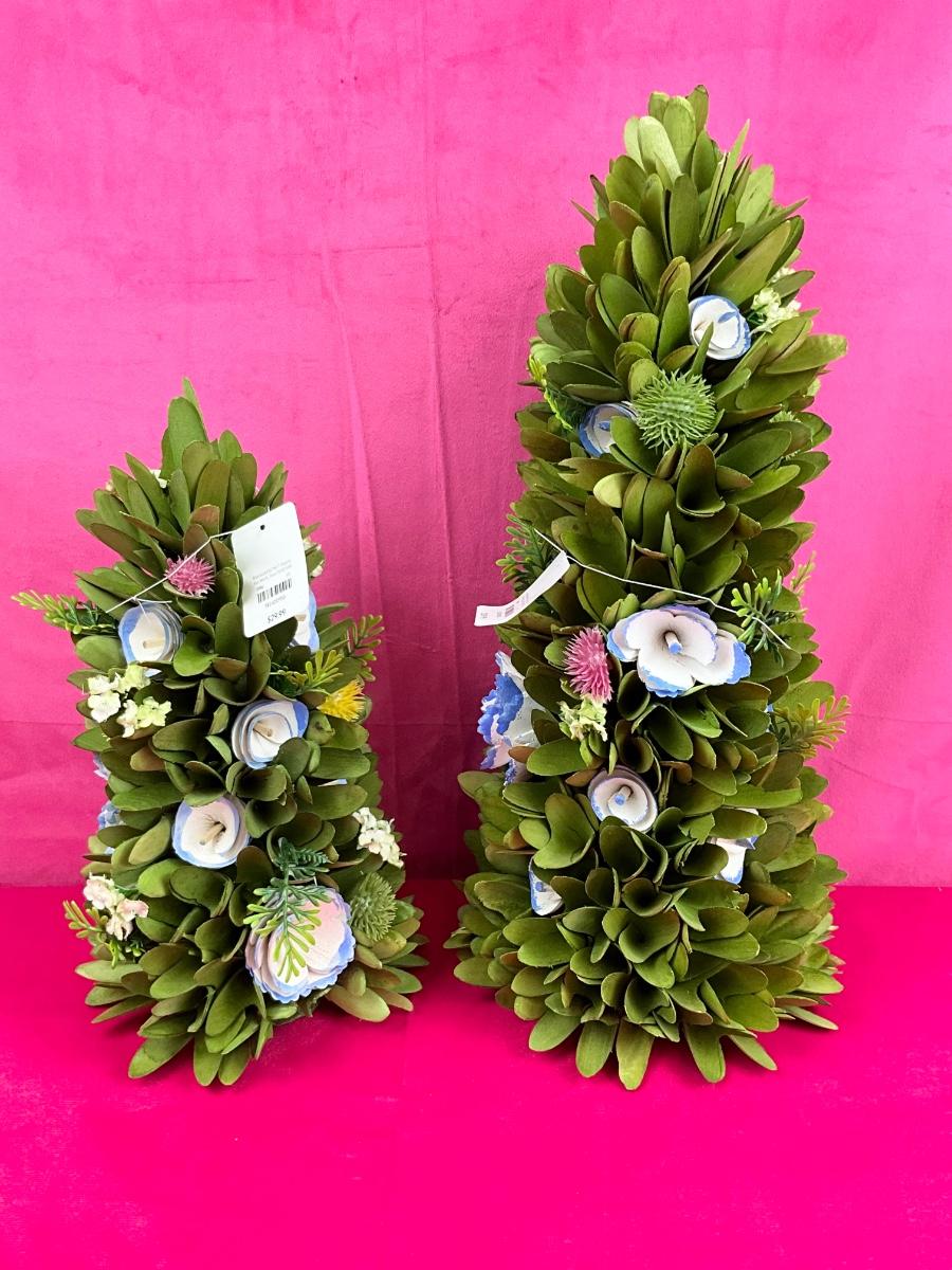 The wooden trees are brand new with tags. The taller tree is 17” high and the smaller tree is 13” high. Bright colors of green, blue, yellow and pink.