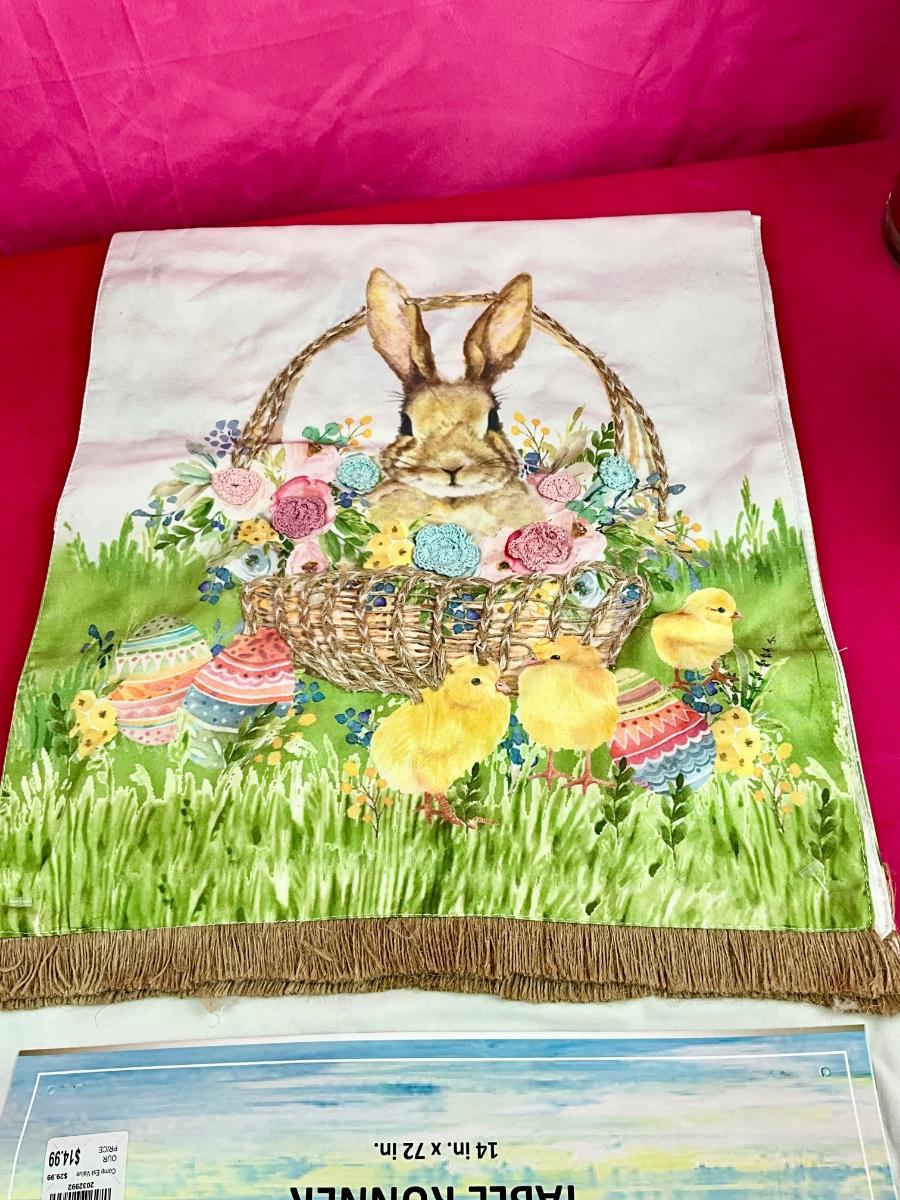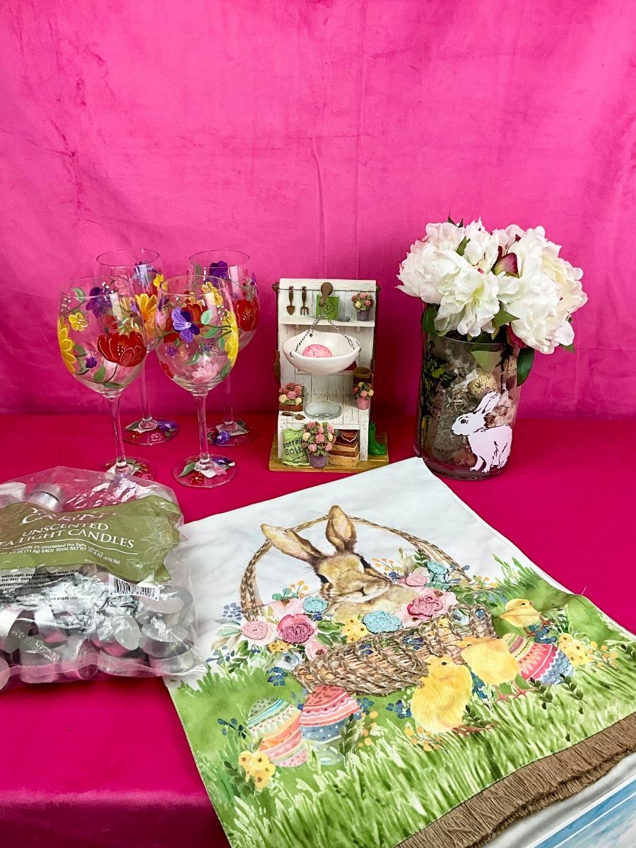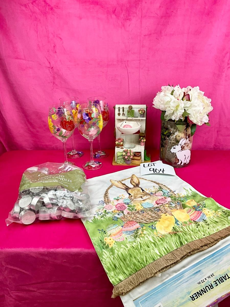 Lot contains new table runner, faux floral arrangement, bag of tea lites and Yankee Candle Garden votive holder. There are 4 handcrafted bunnies painted brand new Pier 1 goblets.