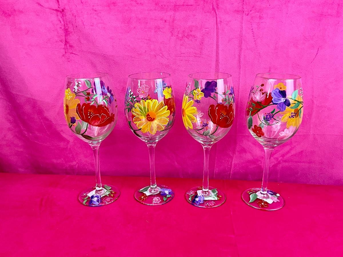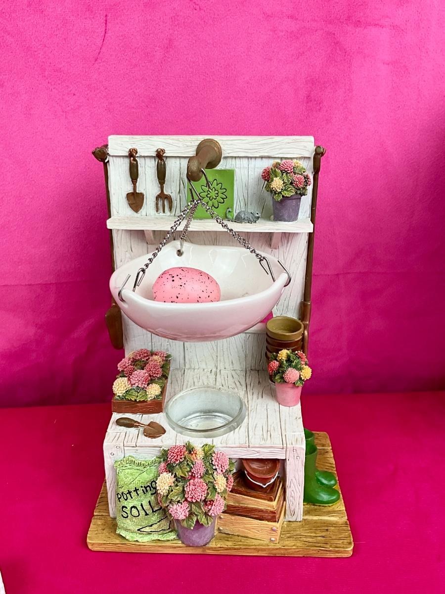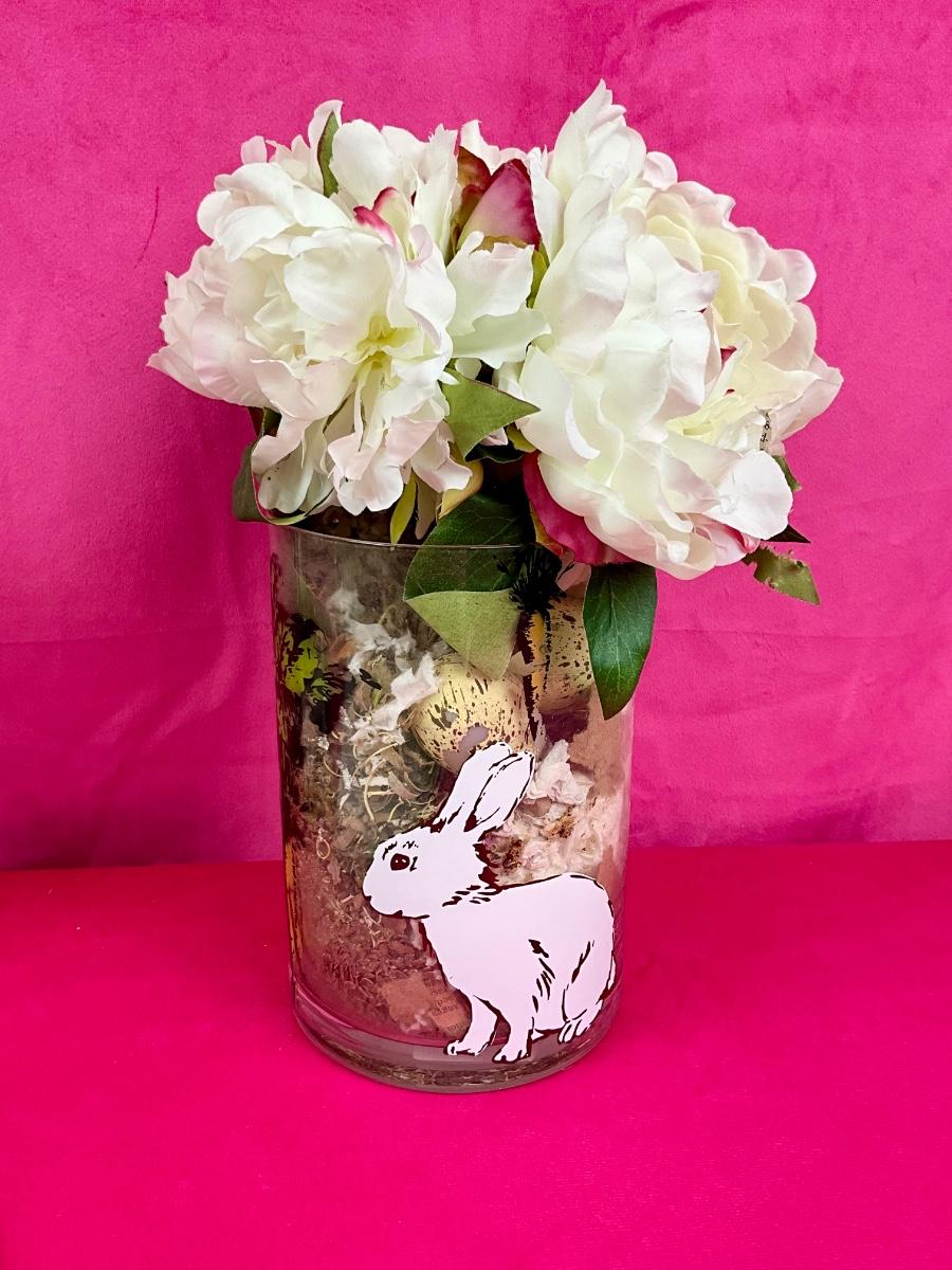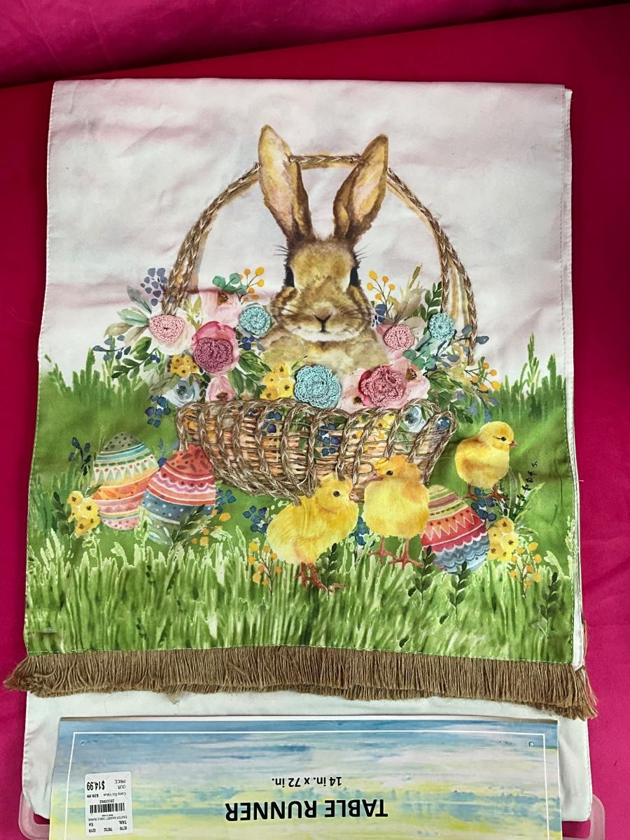 Lot contains new table runner, faux floral arrangement, bag of tea lites and Yankee Candle Garden votive holder. There are 4 handcrafted bunnies painted brand new Pier 1 goblets.