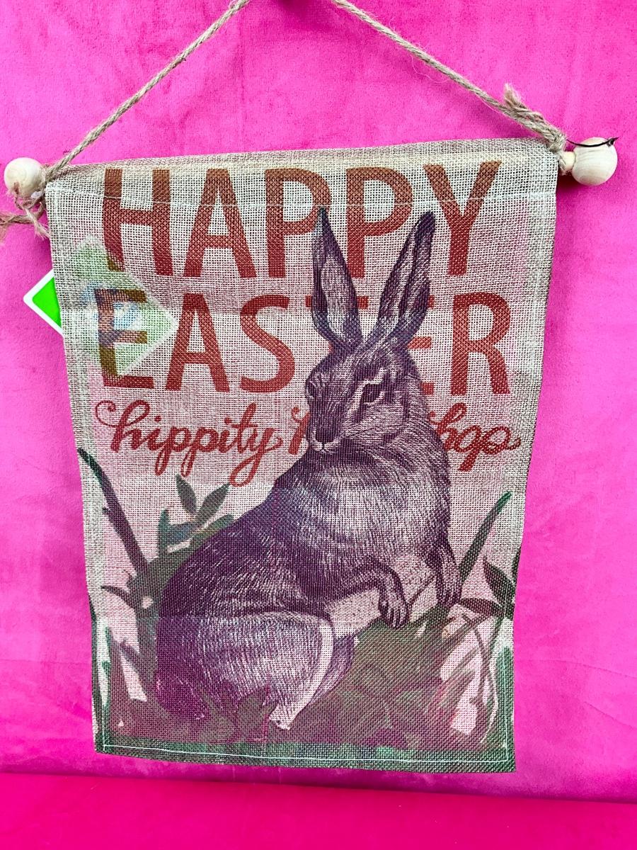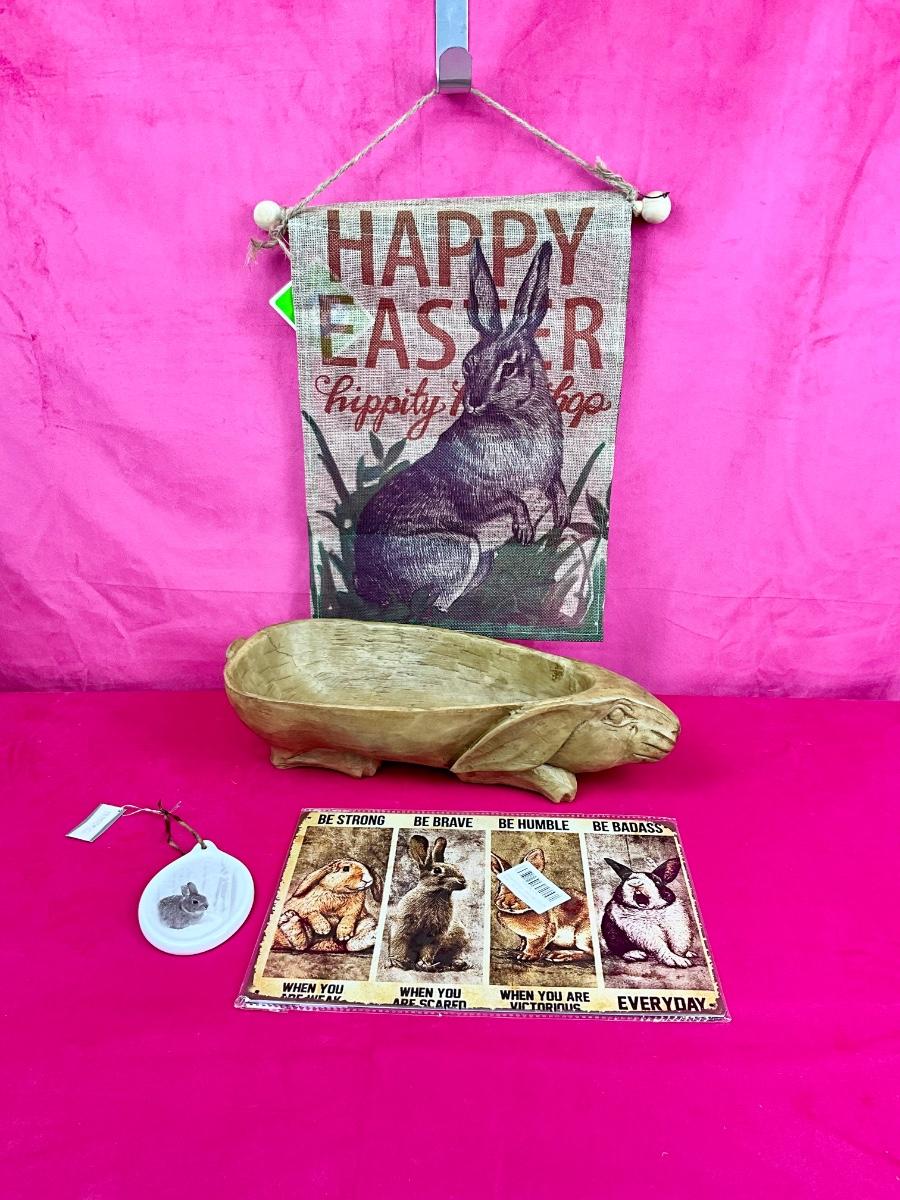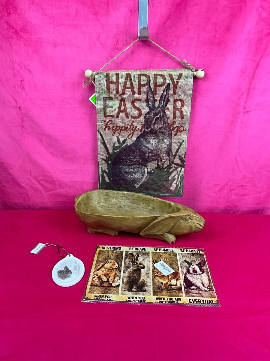 The lot contains Happy Easter hanging flag, bunny porcelain ornament, metal sign and wooden carved bunny bowl.