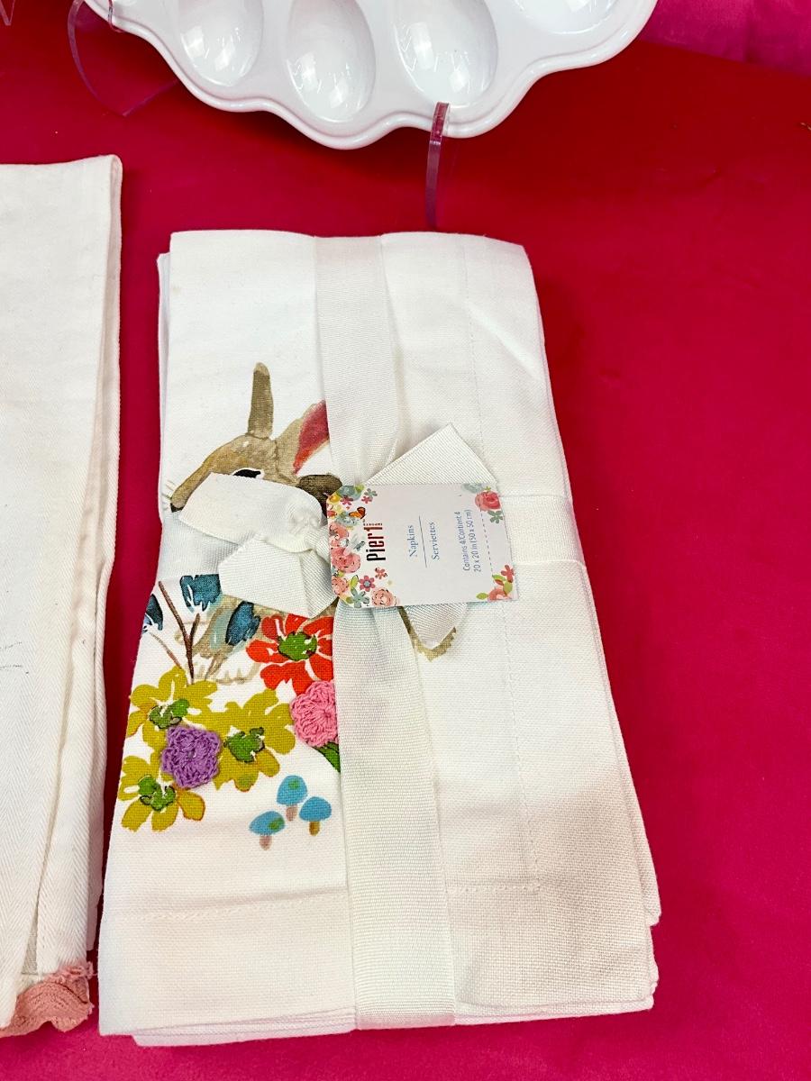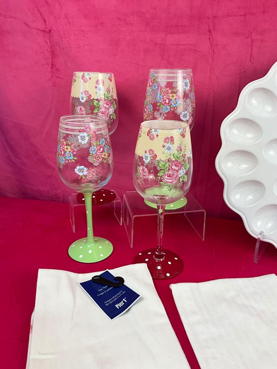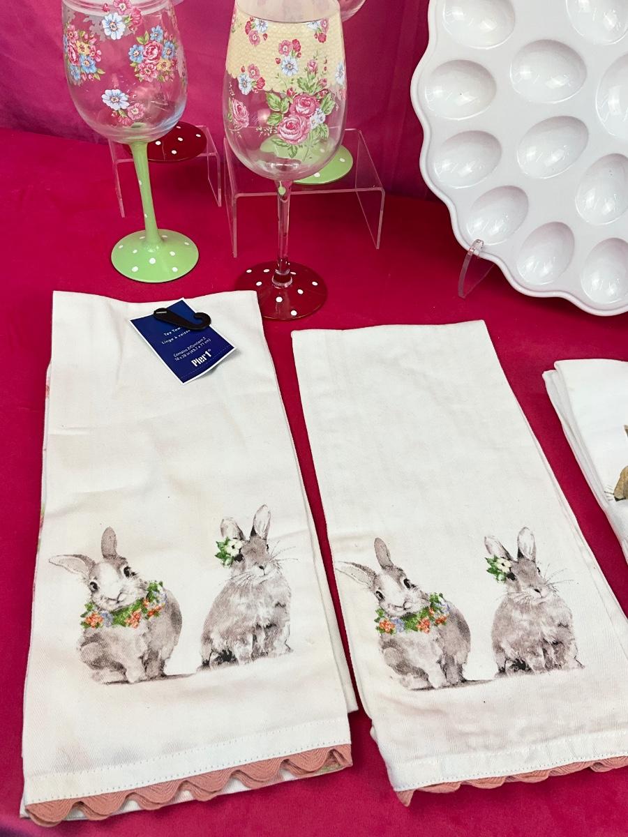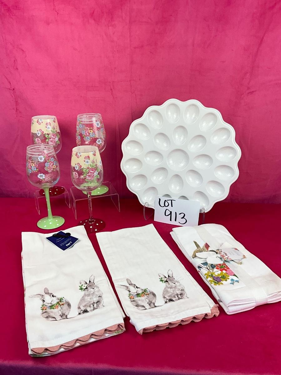 There are several brand new bunny tea towels from Pier 1. There is 4 hand painted glasses from Pier 1 and also a large deviled egg platter for 2 dozen eggs. All items are brand new.