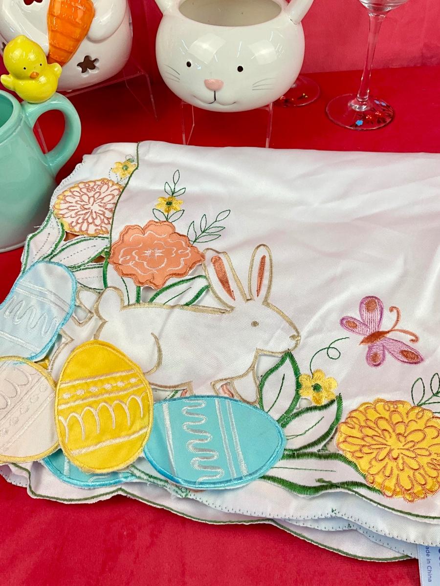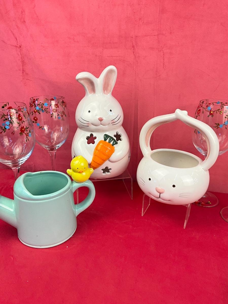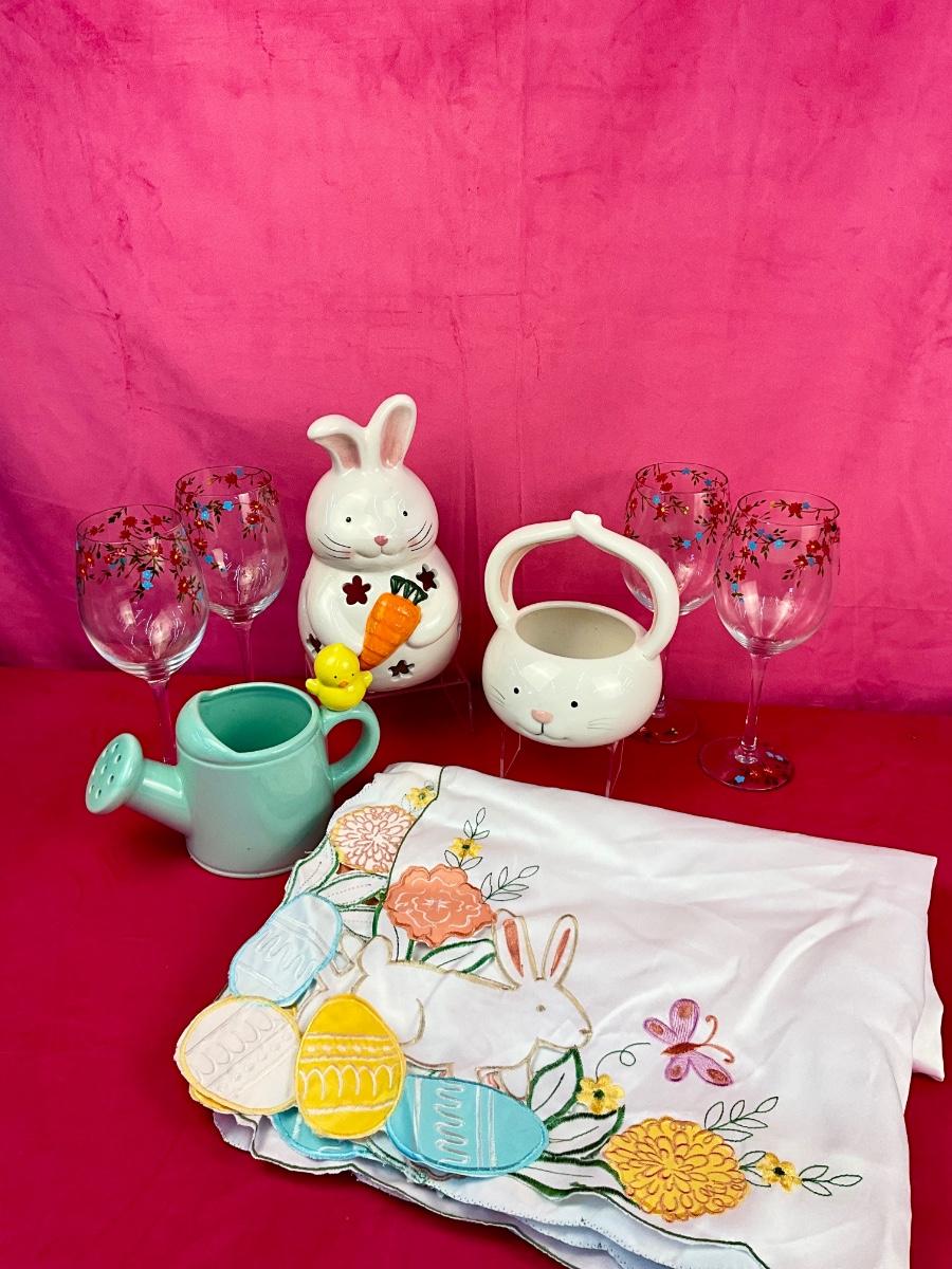 The lot contains a porcelain bunny votive candle holder, watering can and bunny bowl. There are 4 hand painted stemware glasses and a Kohl’s bunny appliqué rectangular table cloth.