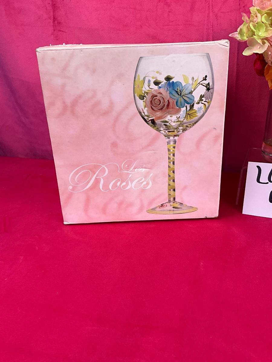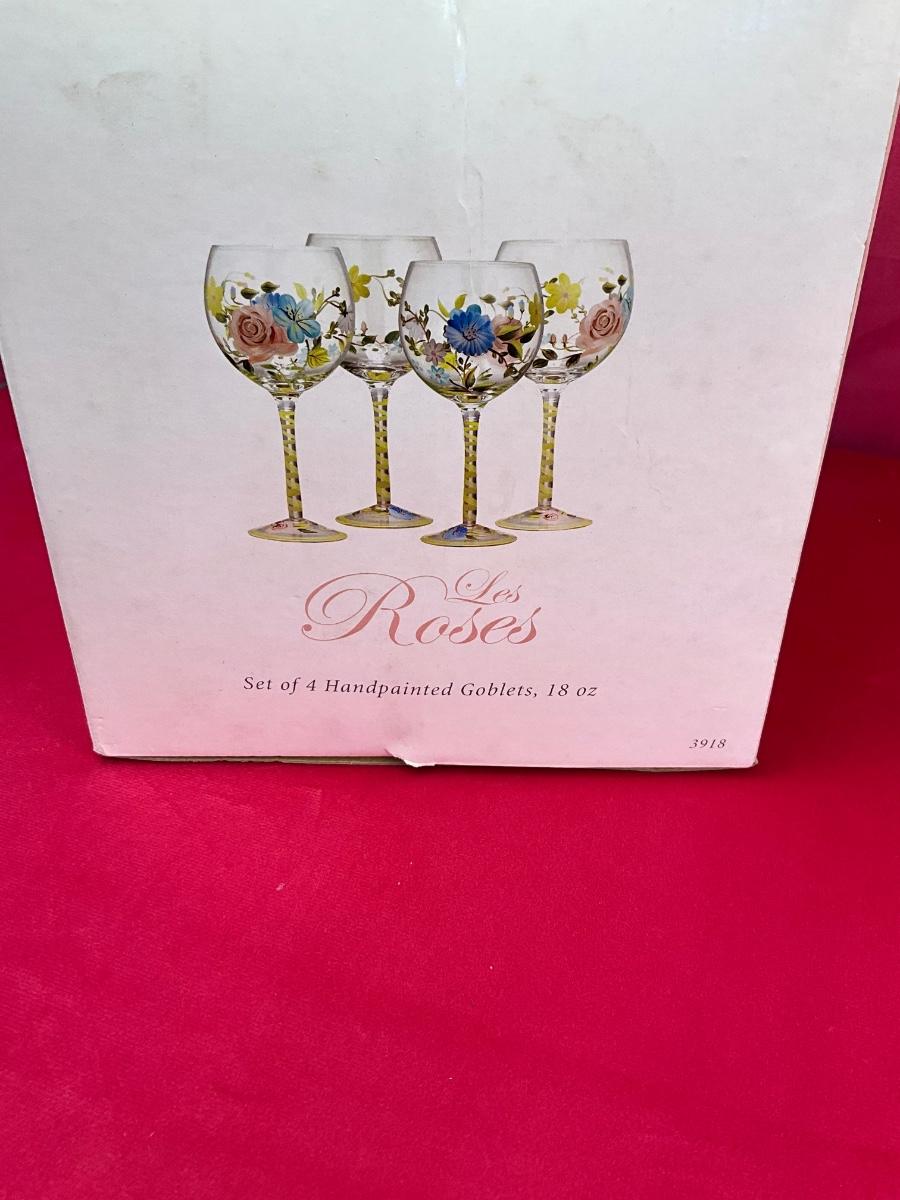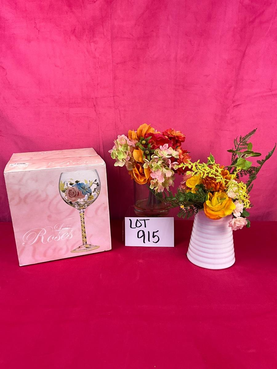 The lot contains 2 Pier 1 floral arrangements in vases, and new box of Les Roses 18 oz. Hand painted goblets.