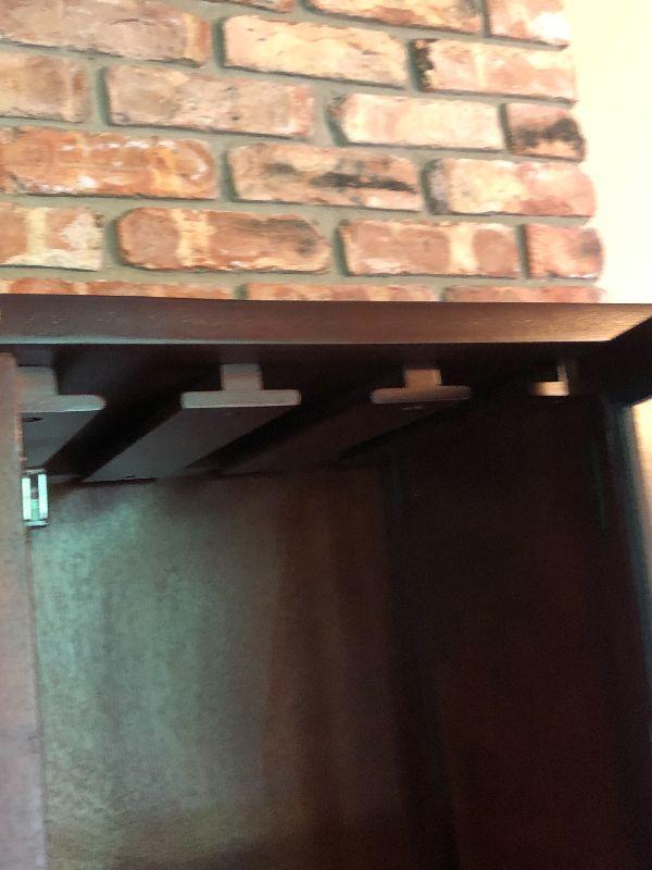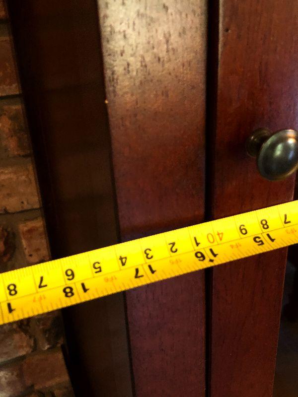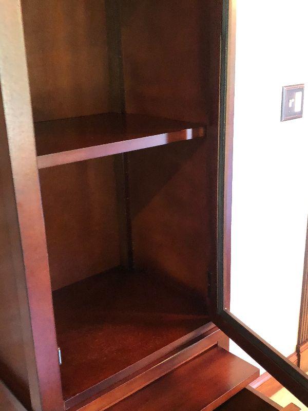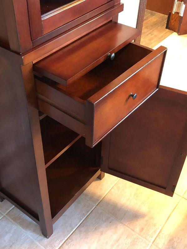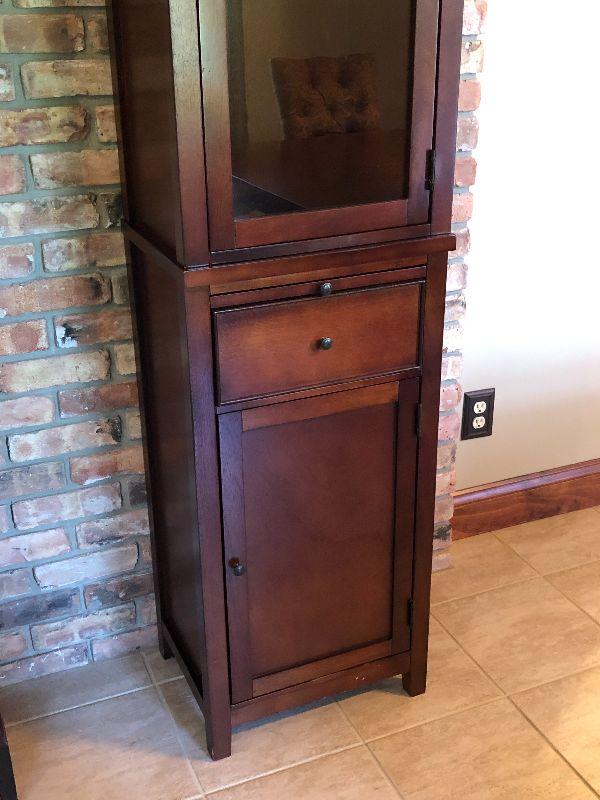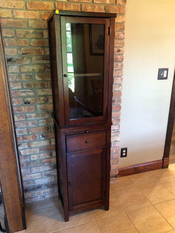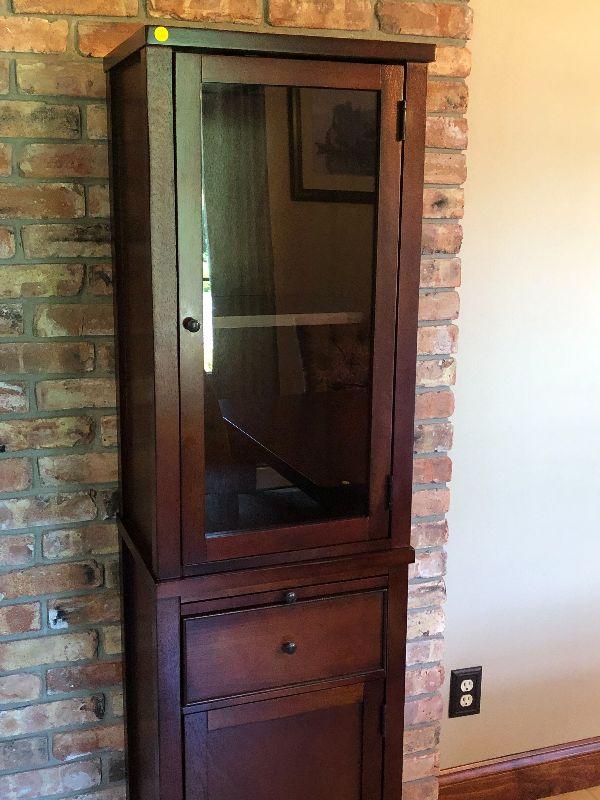Glass door on top with one shelf inside. A drawer and cabinet space on bottom. Bring help to move