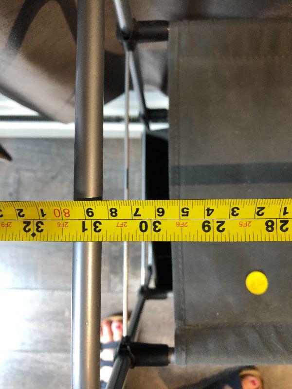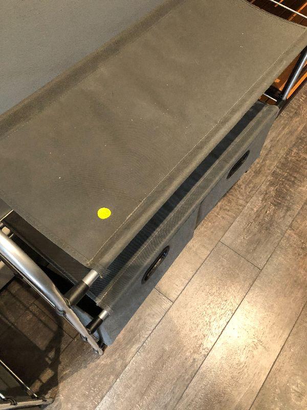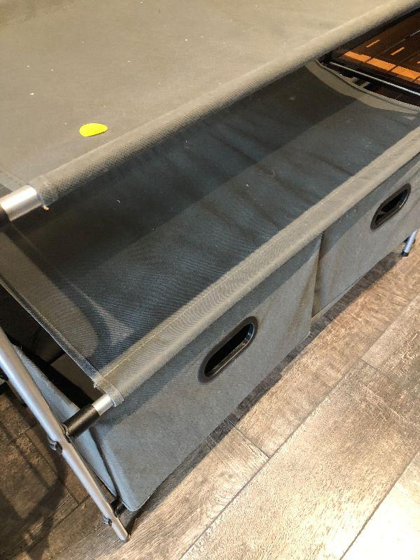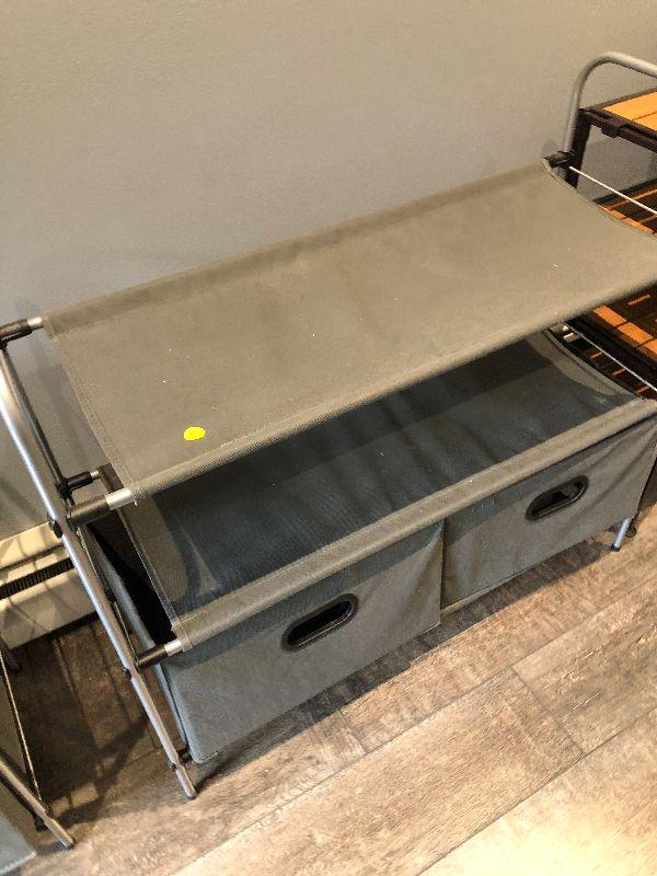 Muliti purpose, canvas type bins and shelfs on a metal rack. Possibilities are endless.