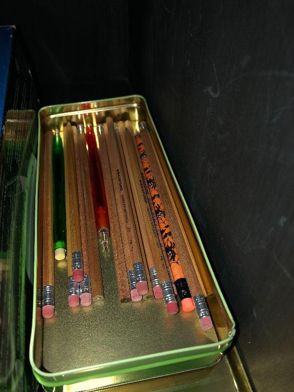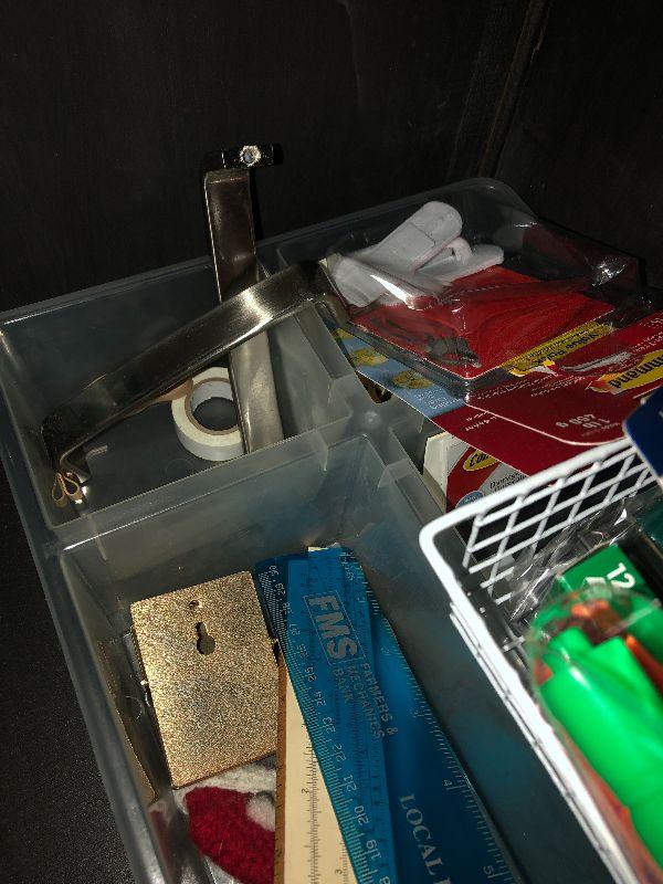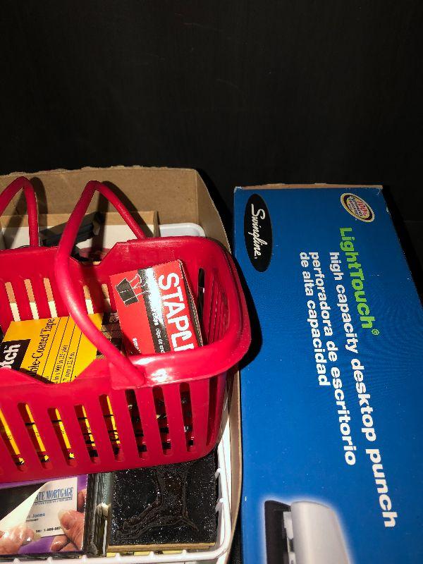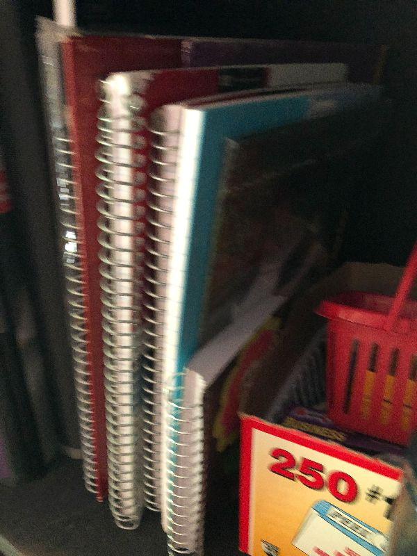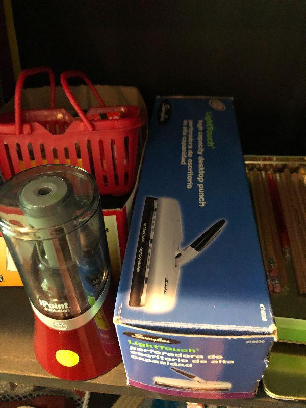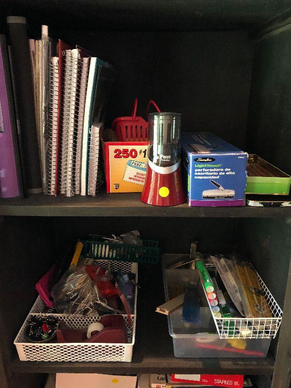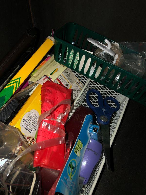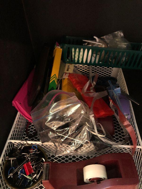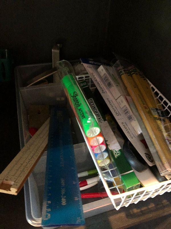 Note books, envelopes, pencils, markers, and more. Bring container to move.