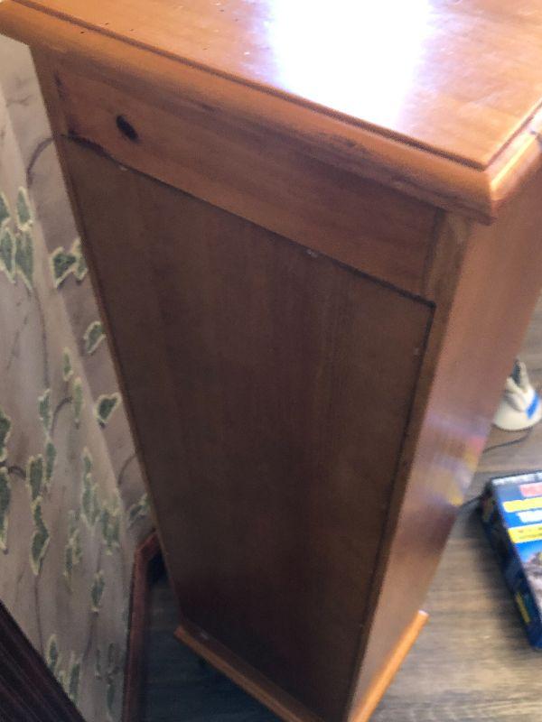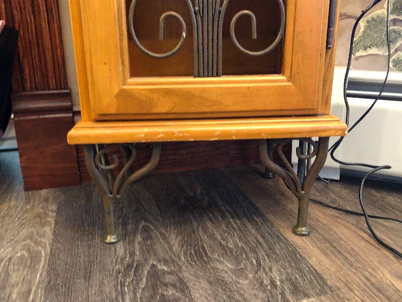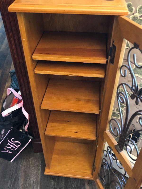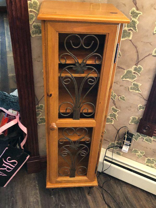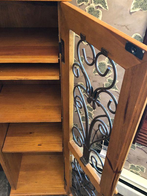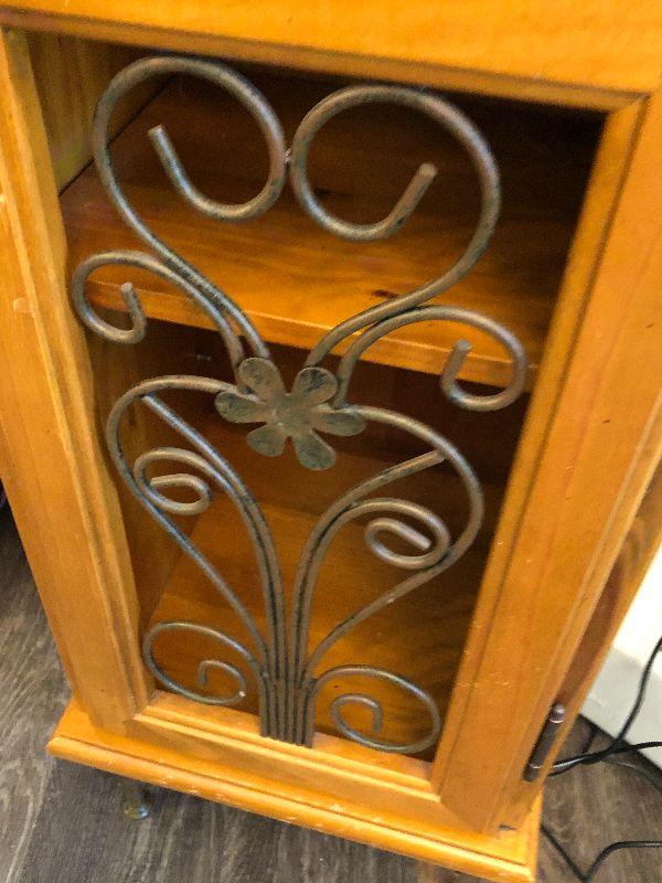 Wooden cabinet with metal scroll on doors. CD/DVD storage tower or anything else you can think of.