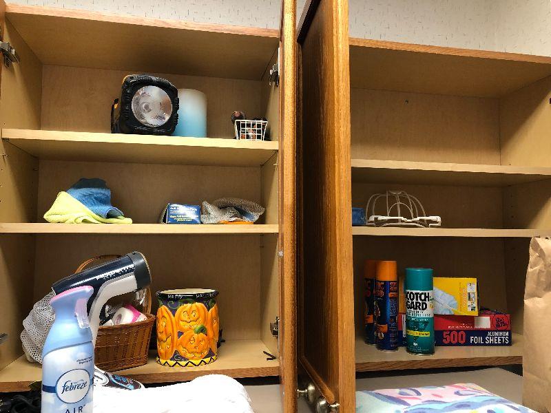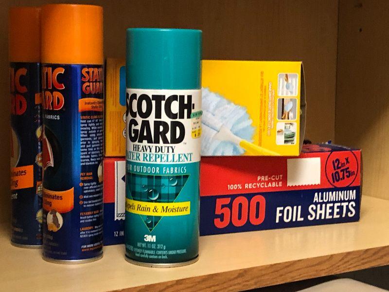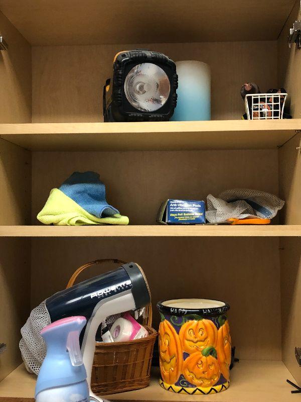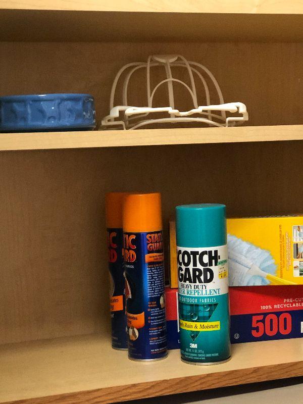 Scotchgard, Static gard, swifter cleaners, flashlight, untested, Halloween canister and more. Bring box for removing.
