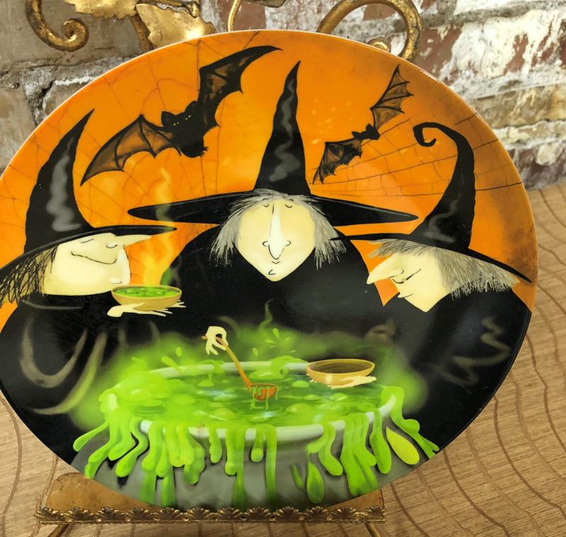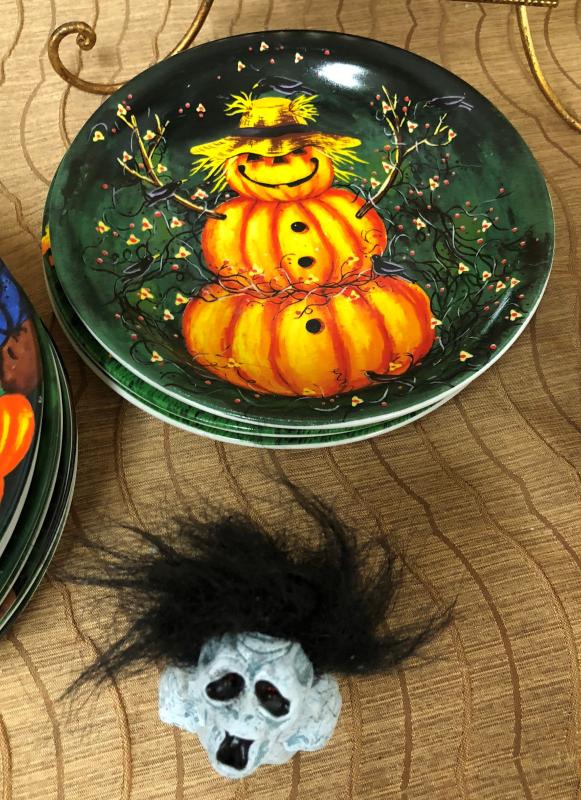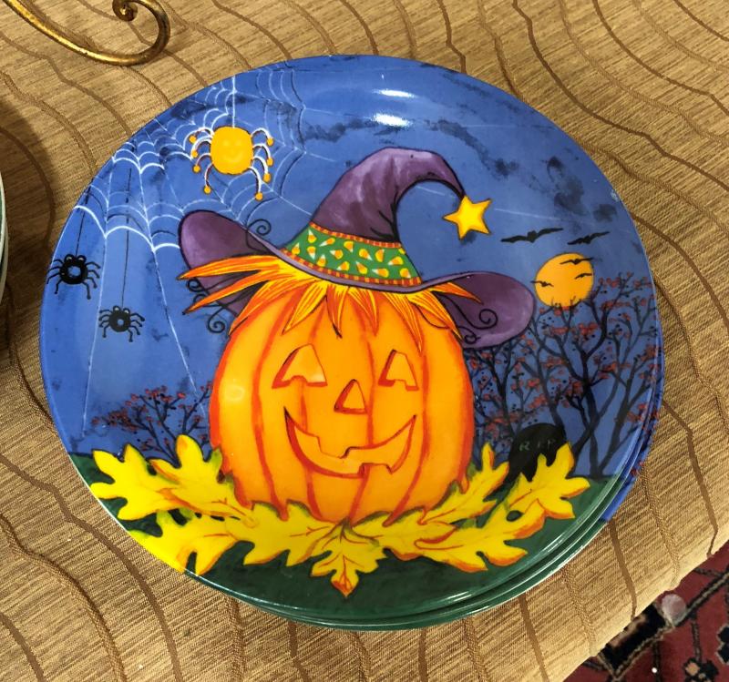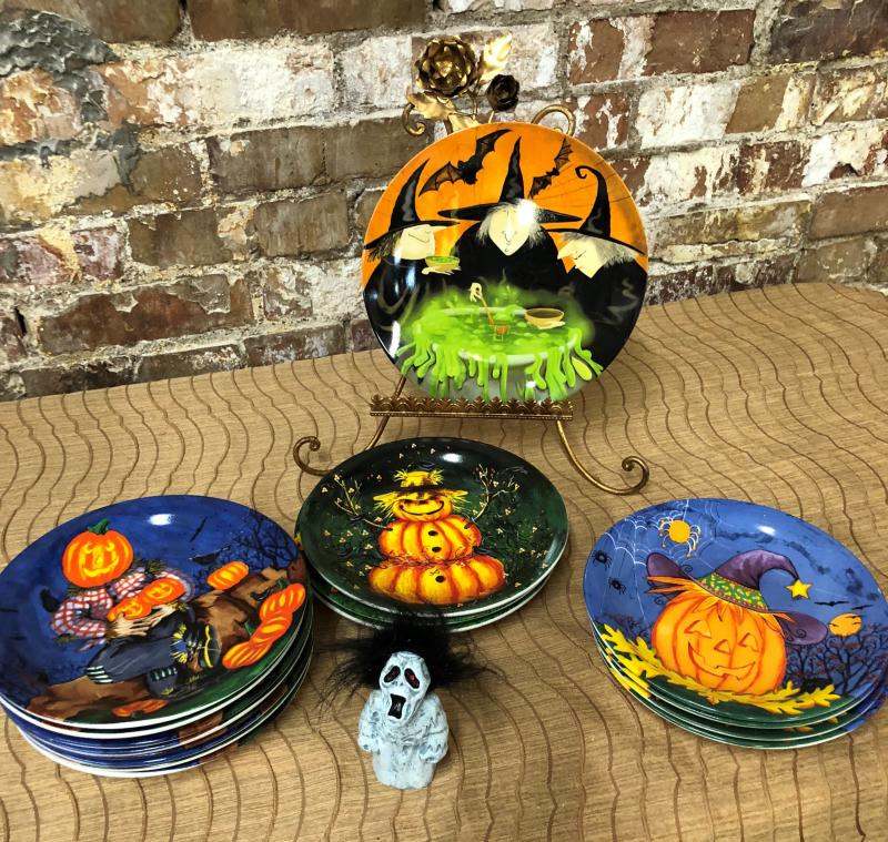 Here are some 16 melmac dessert plates designed with Halloween in mind..Excellent condition...some are by Studio 33....*(display stand not included)...also offered is the small animated ghoulish figure...fun holiday dinnerware...