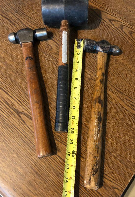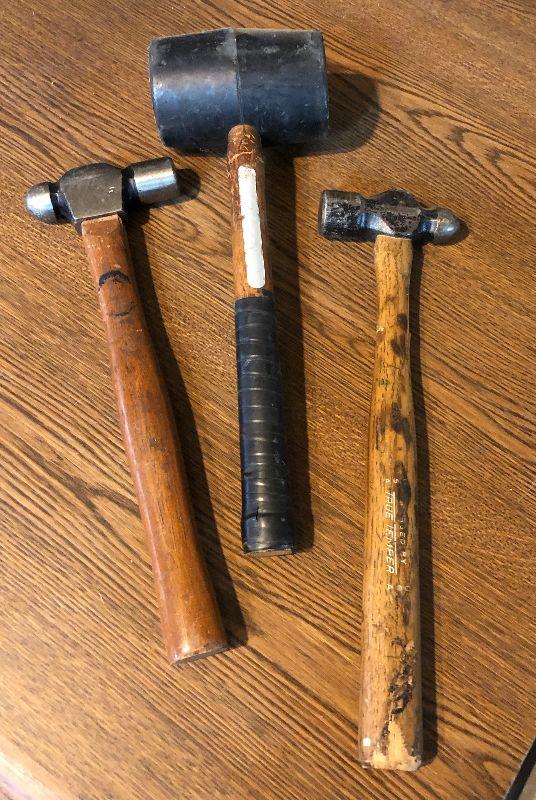 Good used condition on a pair of ballpeen hammers and a rubber mallet...