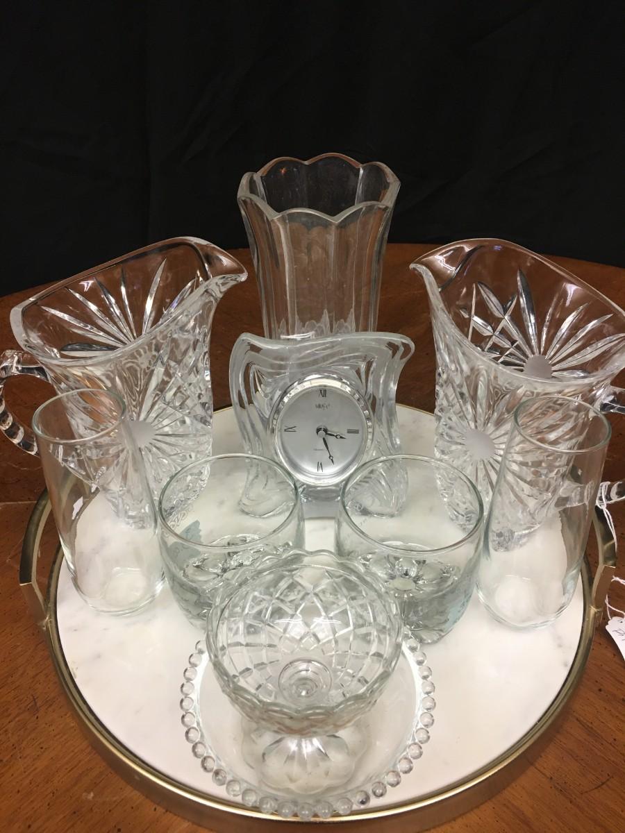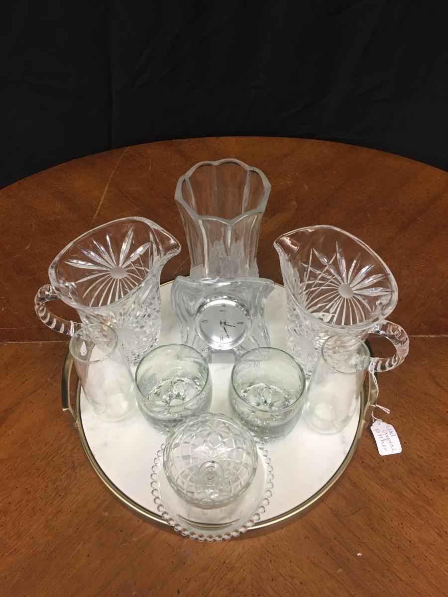 glass / crystal:lot heavy round marble tray, 2 water pitchers, vase, clock, 2 rocks glasses, 1 bowl with raised dotted edge, 2 juice glasses, 1 footed sherbet dish;