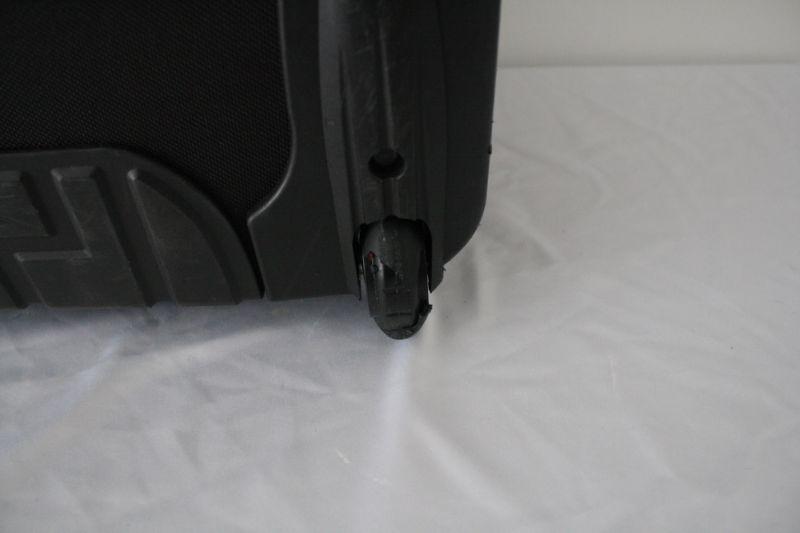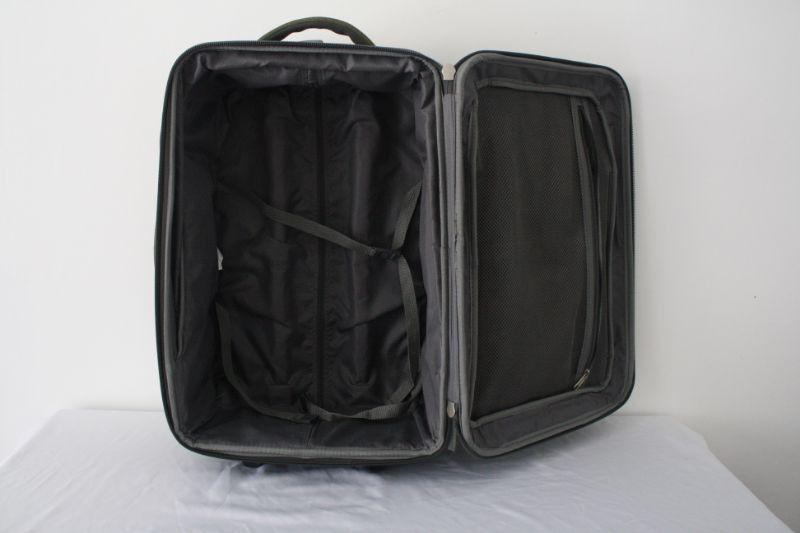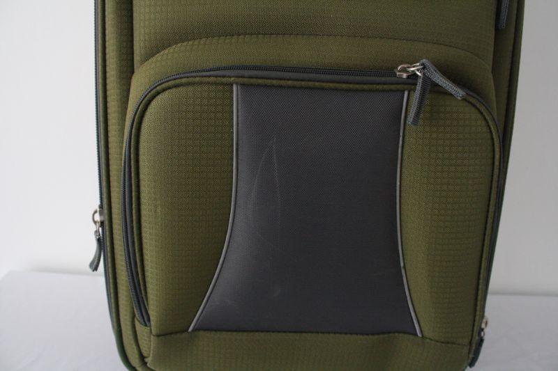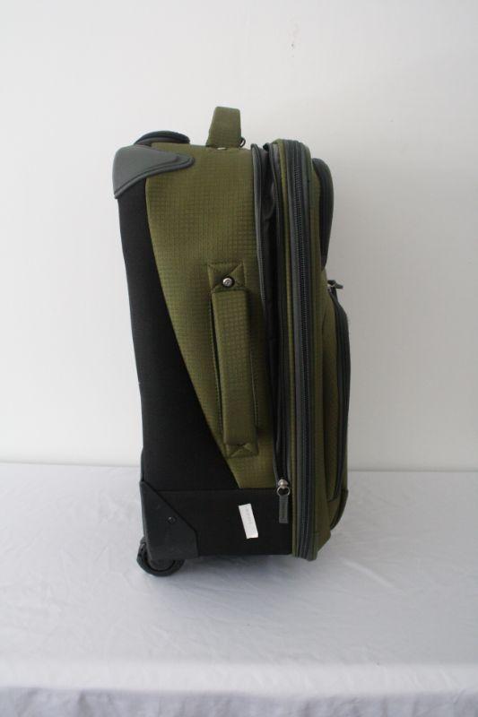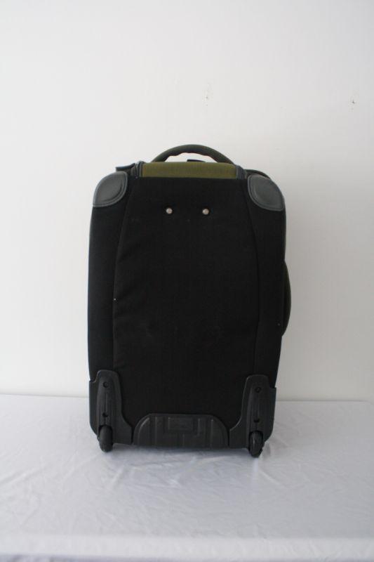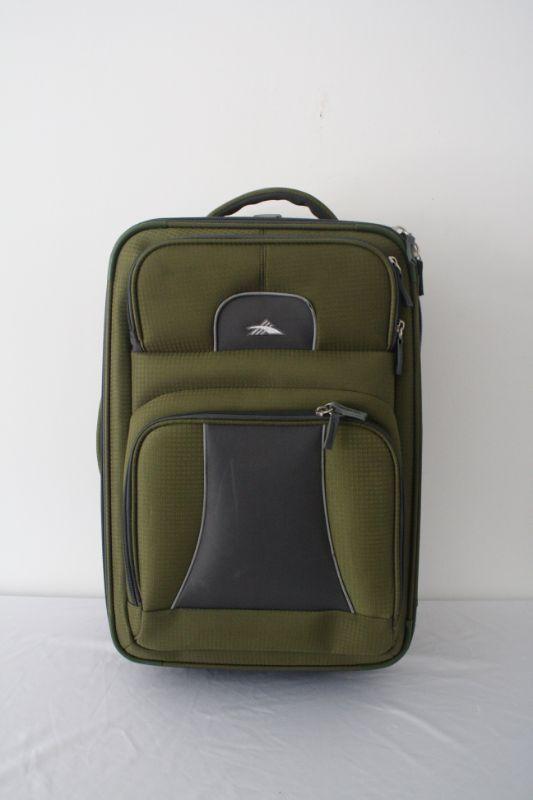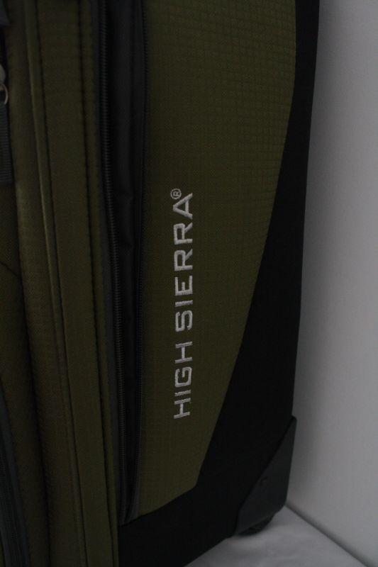 High Sierra Upright Suitcase Rolling Luggage - Rolling suitcase made by High Sierra in forrest green color. Has three zip up pockets and netted zip up storage panel on the inside. Used condition, has a scratch on the black front panel and the outer wheel shell is cracked on one side. Still functions. Measures 15" (width) 8" (depth) and 22.5" (height).