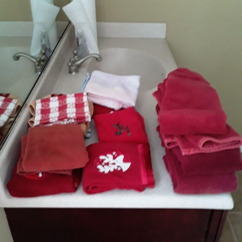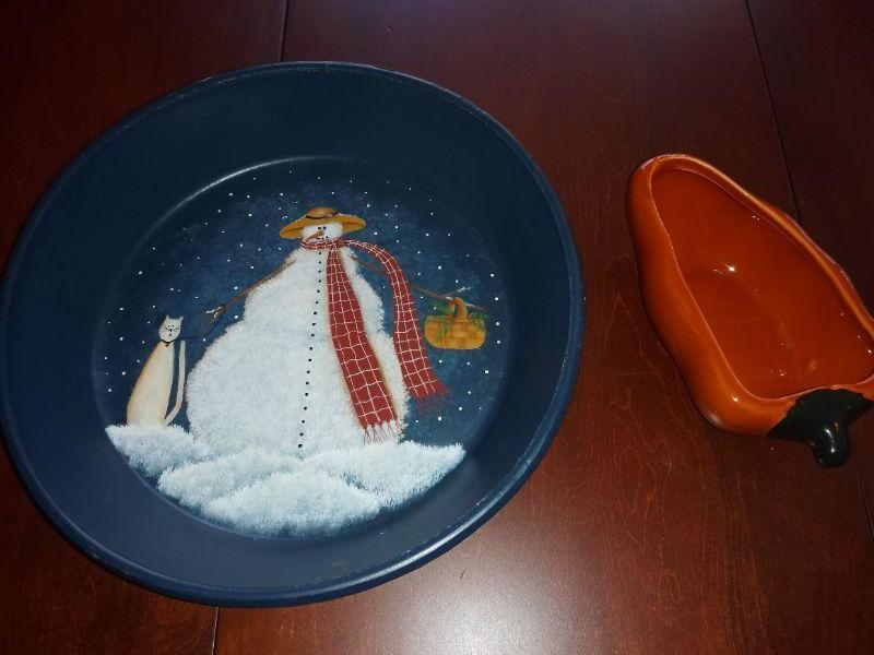 Holiday decorative dishes, linens and wreath