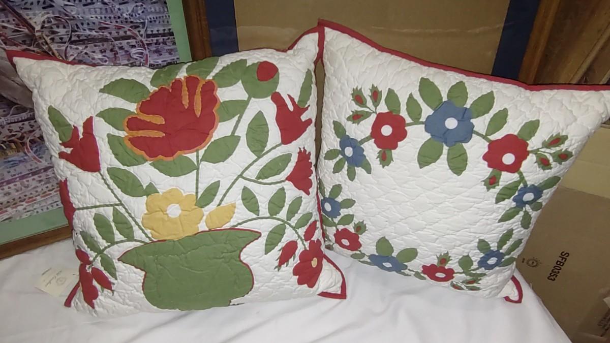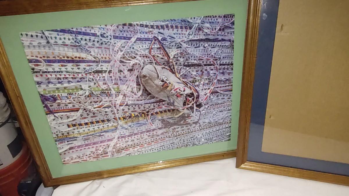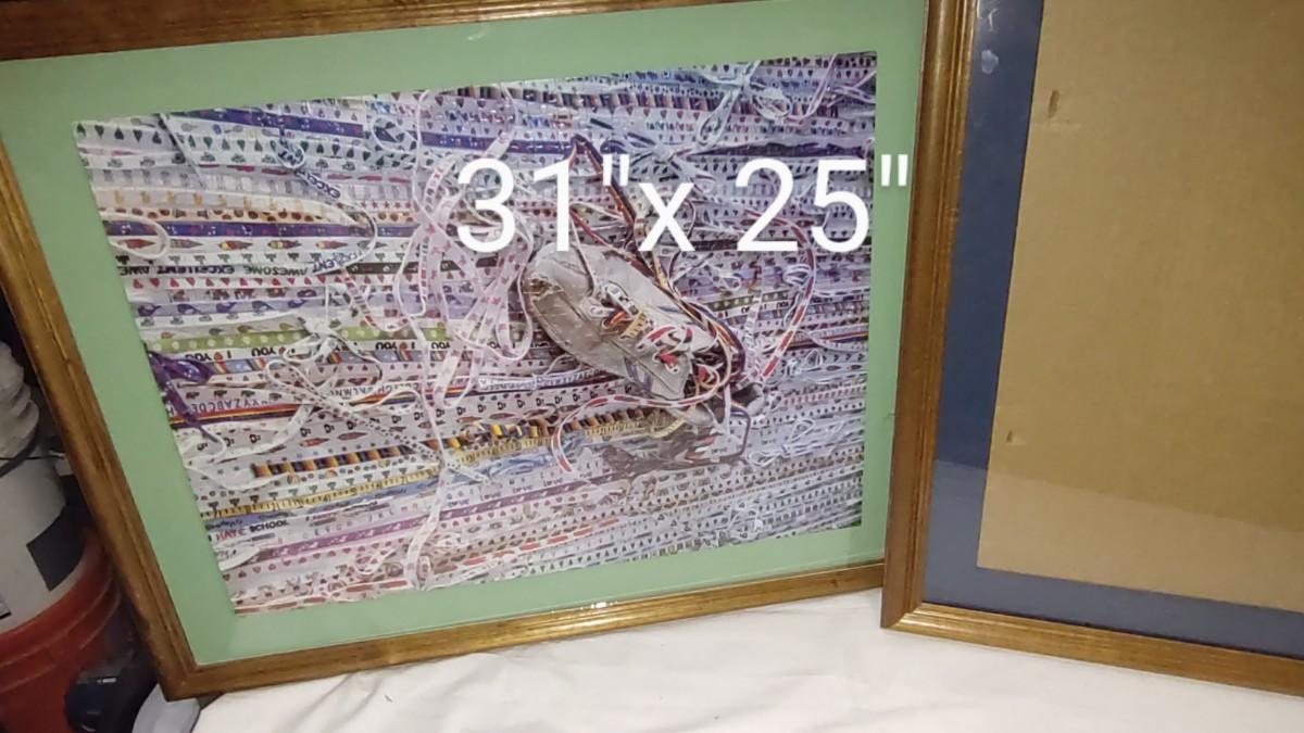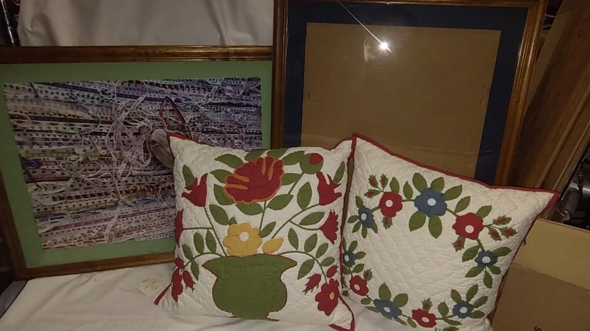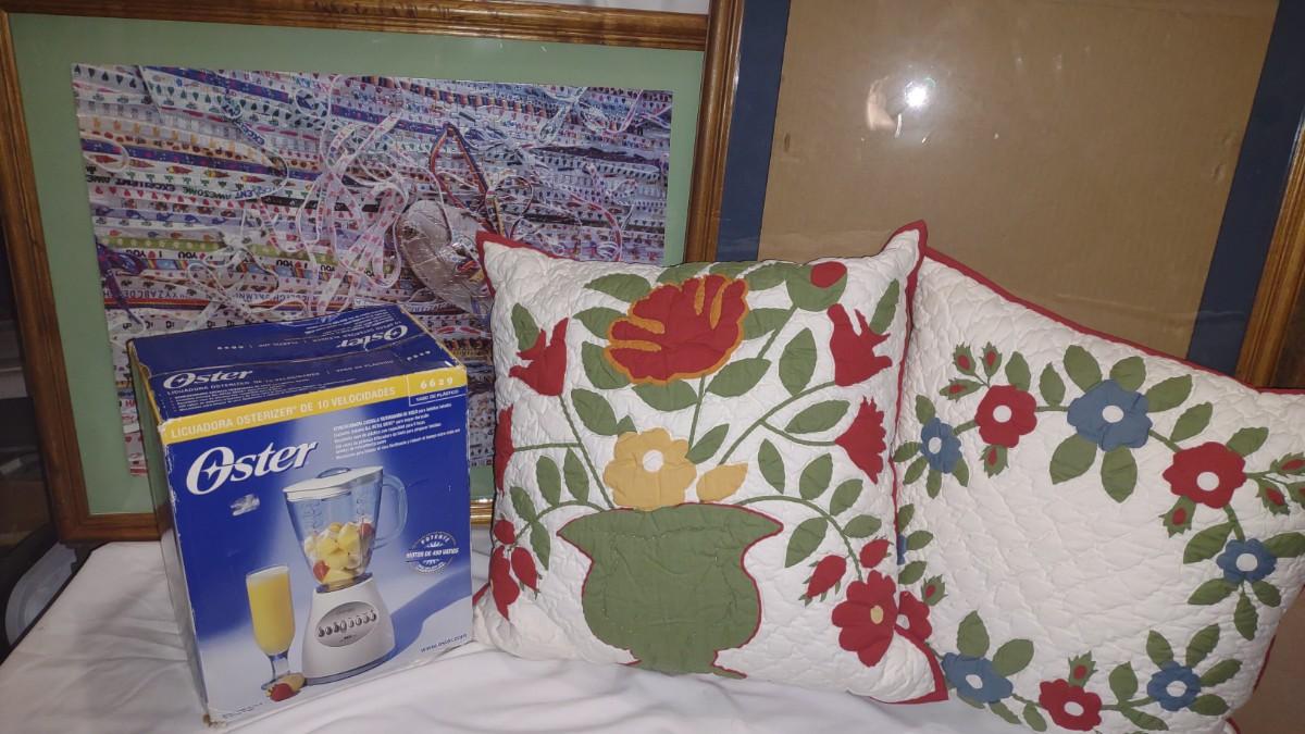 2 LARGE PICTURE FRAMES 31" x 25" ONE FRAME HAS A FINISHED PUZZLE. TWO LARGE THROW PILLOWS AND A NEW BLENDER.