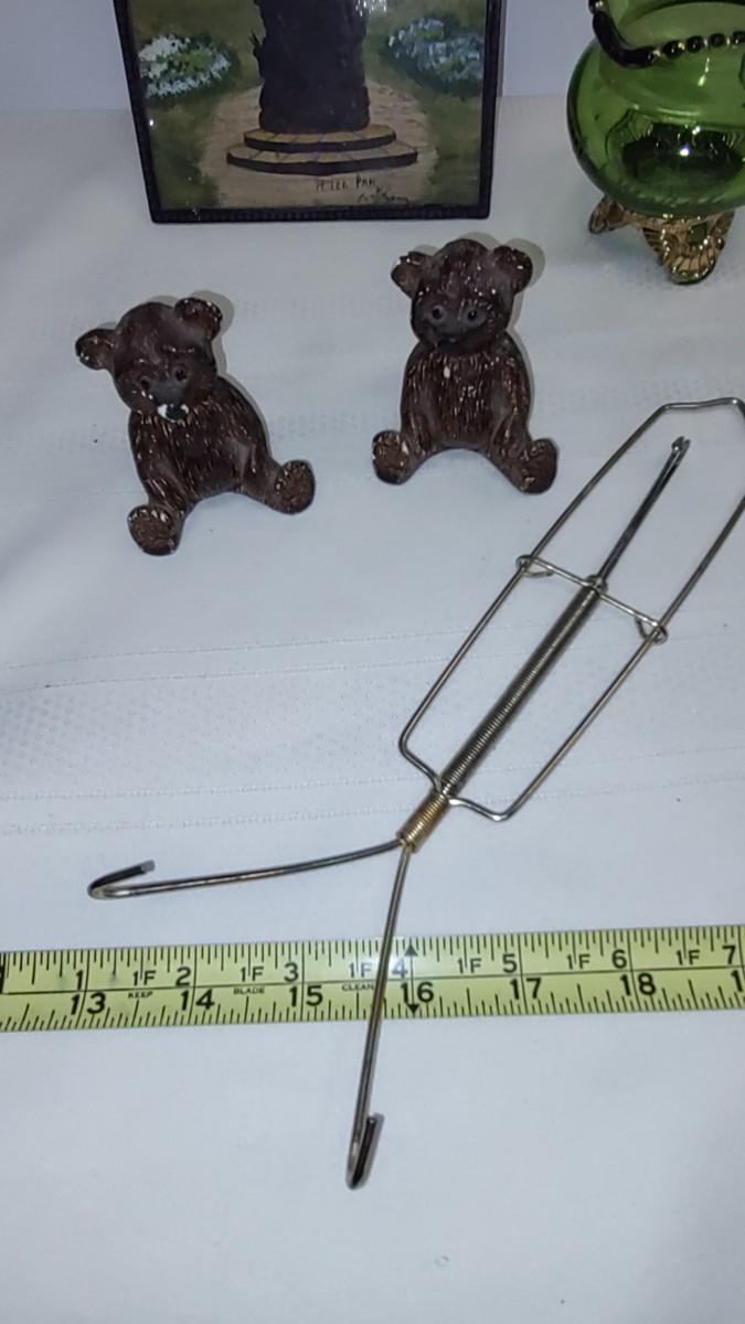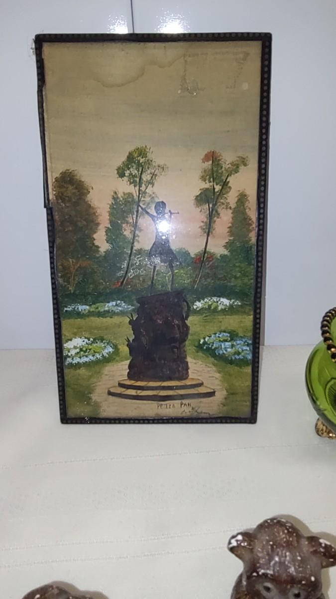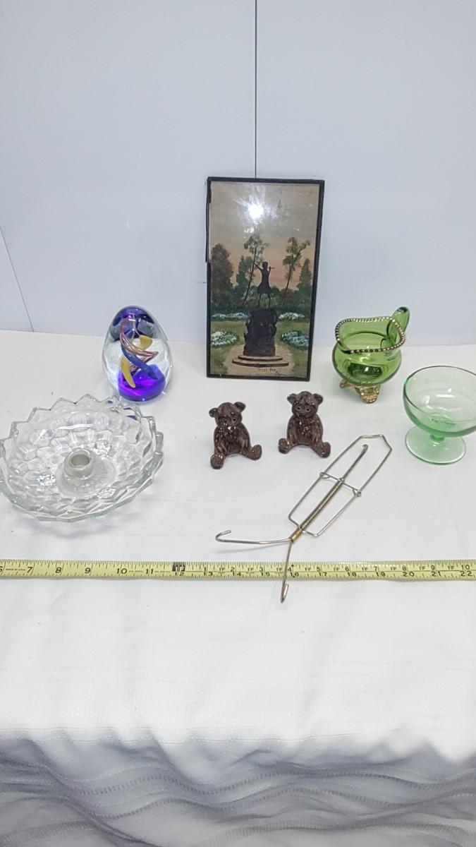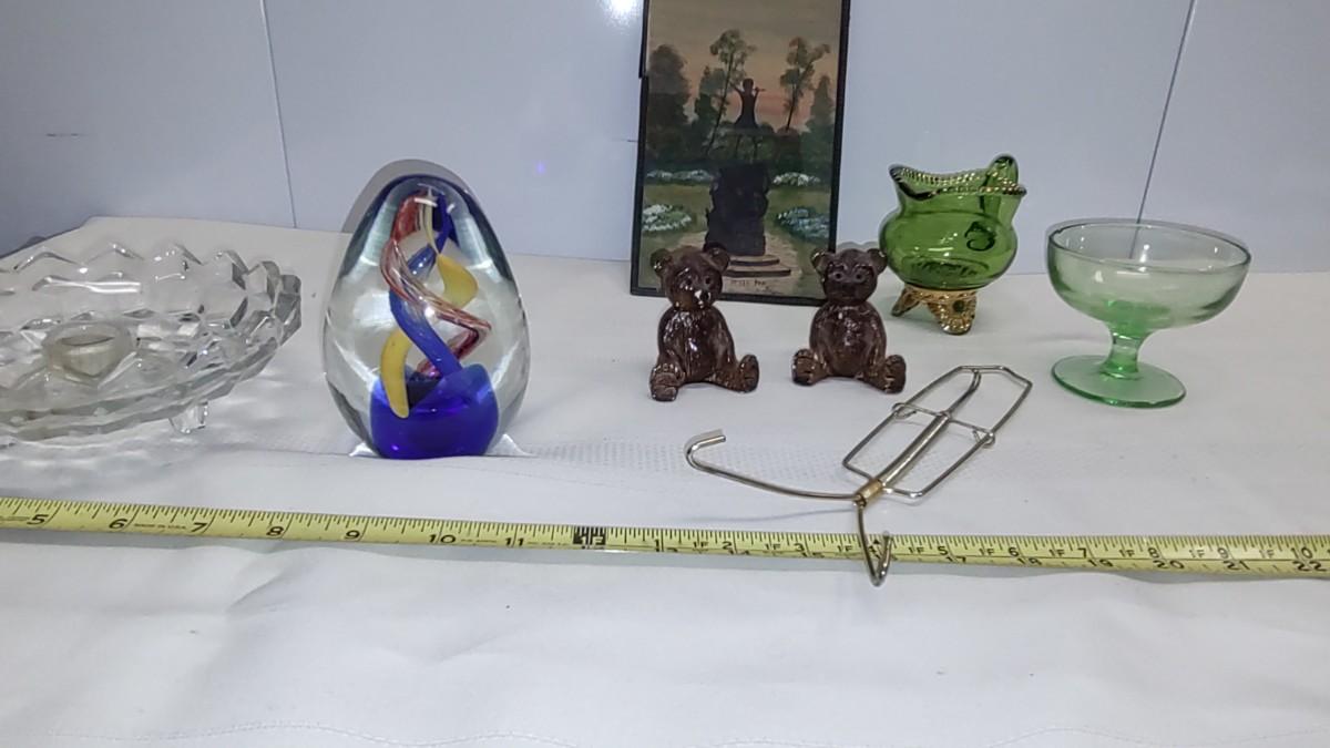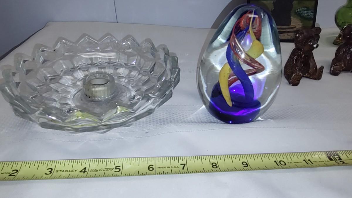 A PAPERWEIGHT WITH A SWIRL OF COLOR INSIDE. A PICTURE OF PETER PAN STATUE, TWO SMALL WOODEN BEARS, AND OTHER GLASS WARE