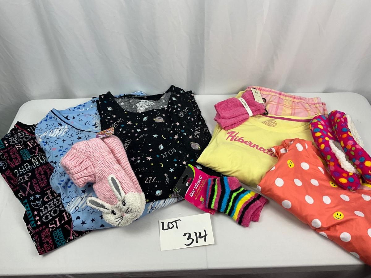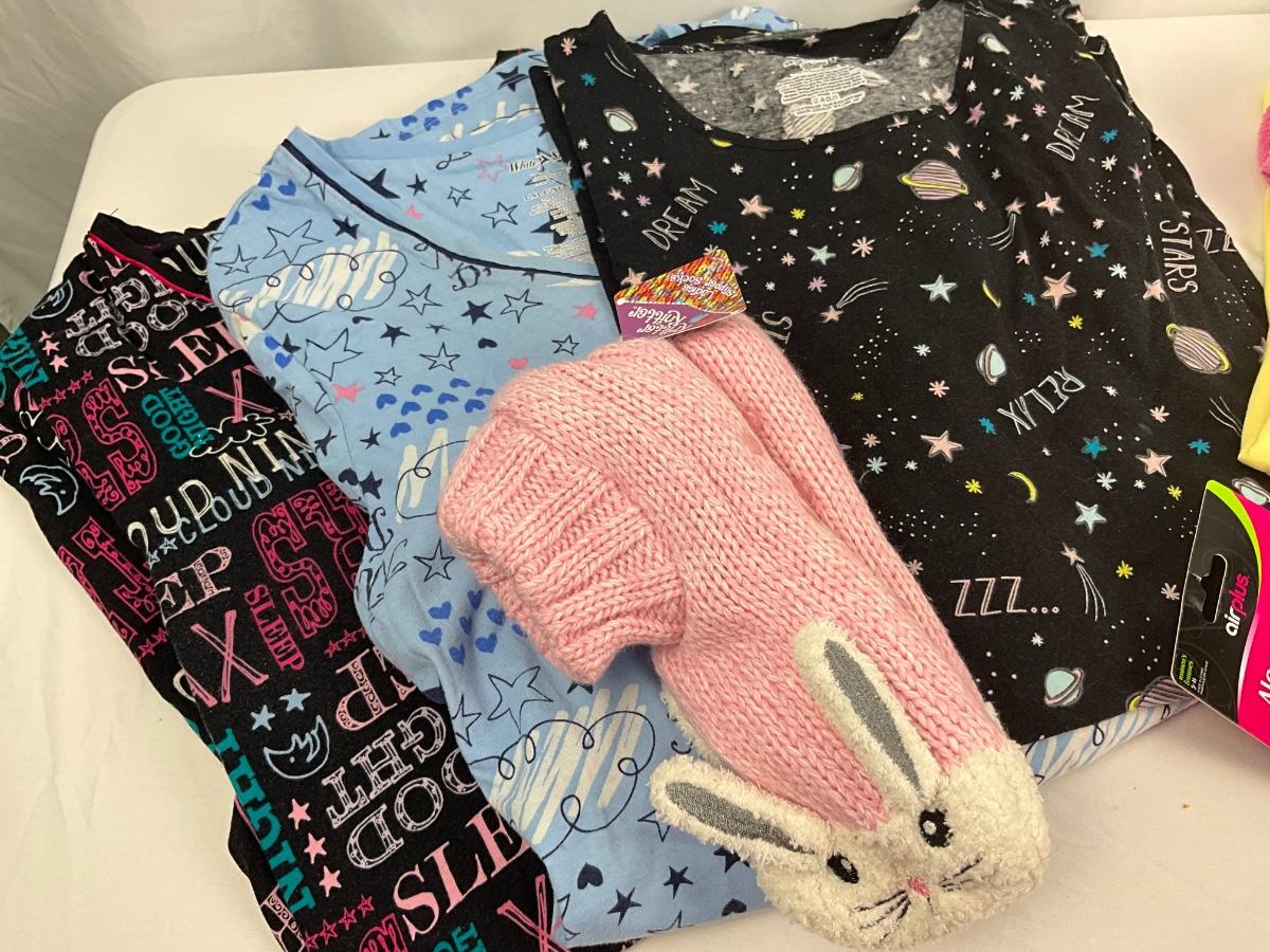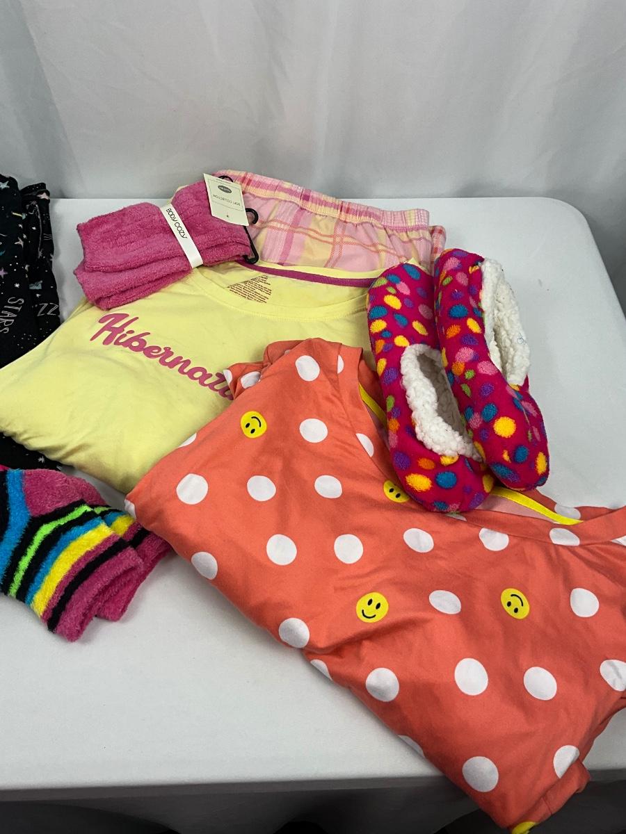 Four nightgowns, 1 pajama set, two pairs of socks and two pairs of slippers.