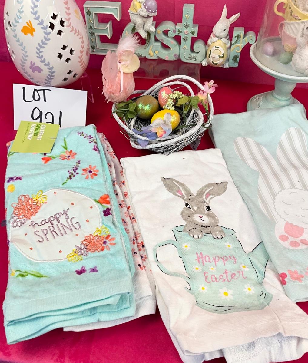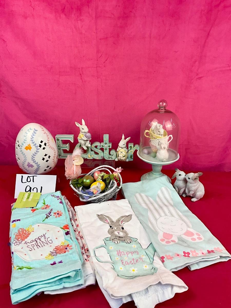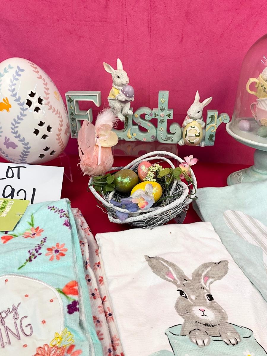 The lot contains ceramic Easter egg that lights up, Easter sign, several brand new Easter theme tea towels, bunny figures and a cloche with bunnies in tea cups.