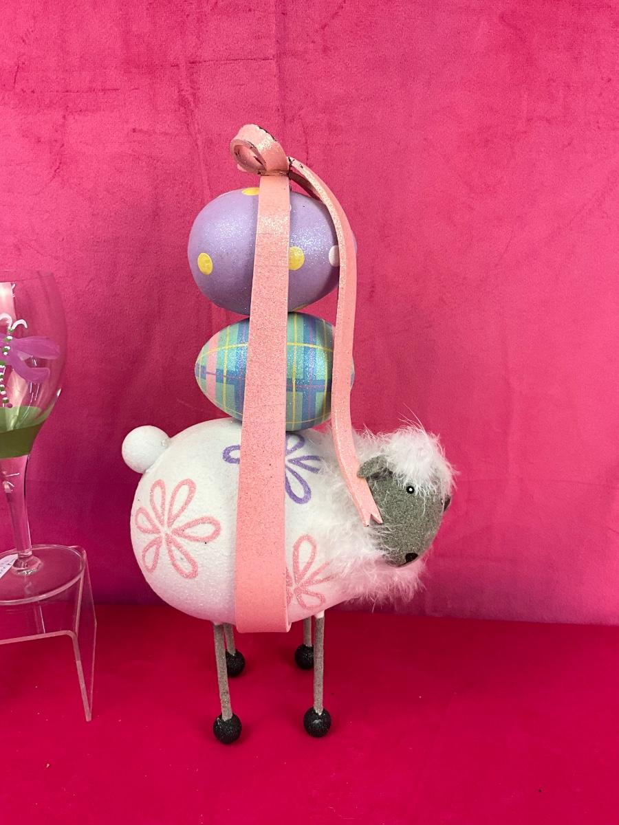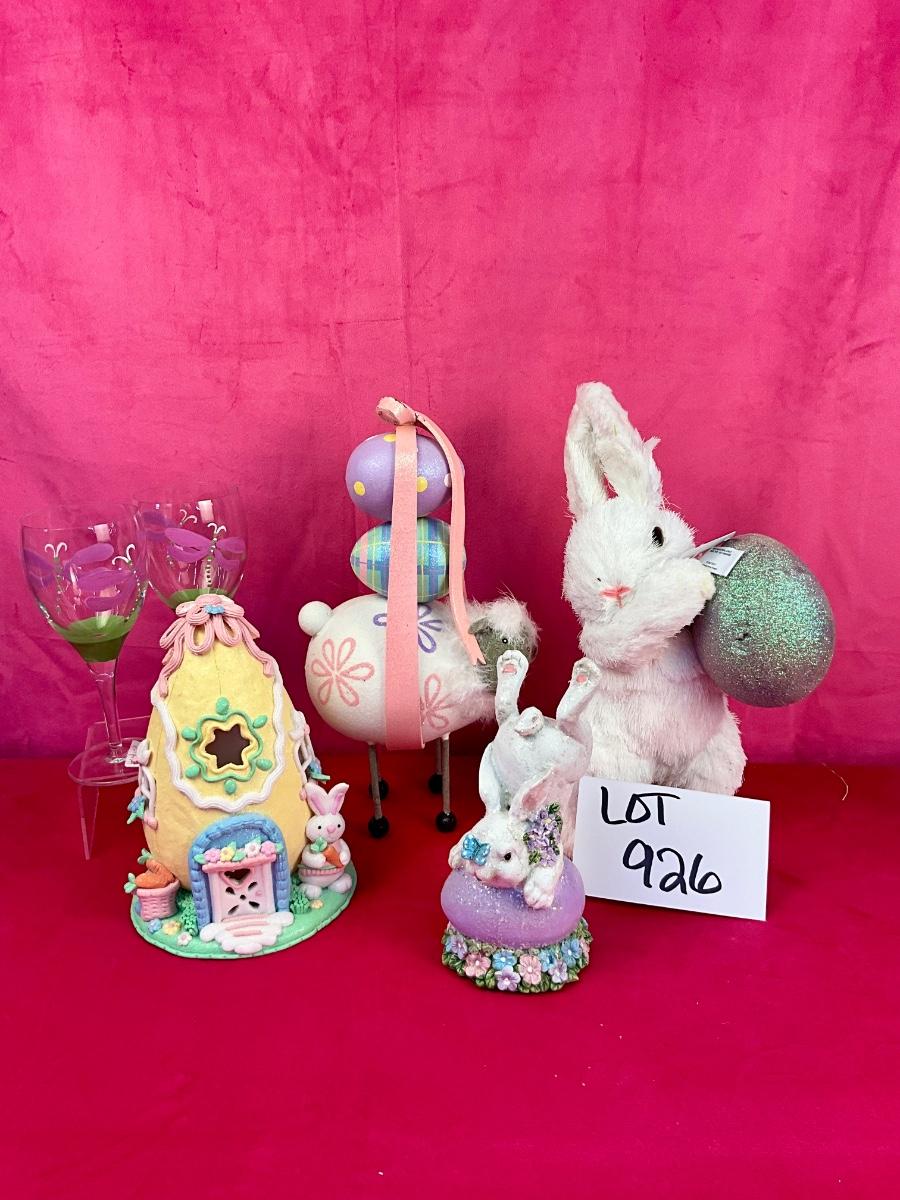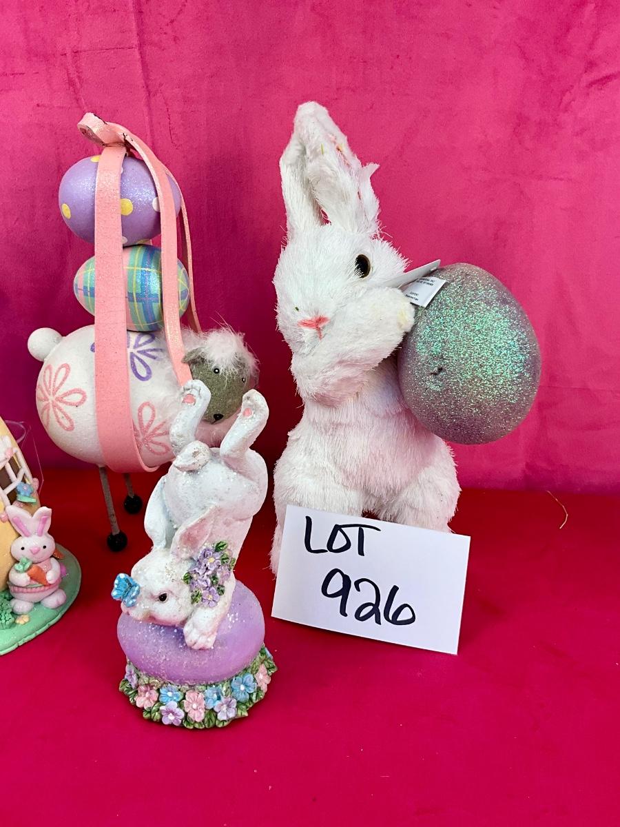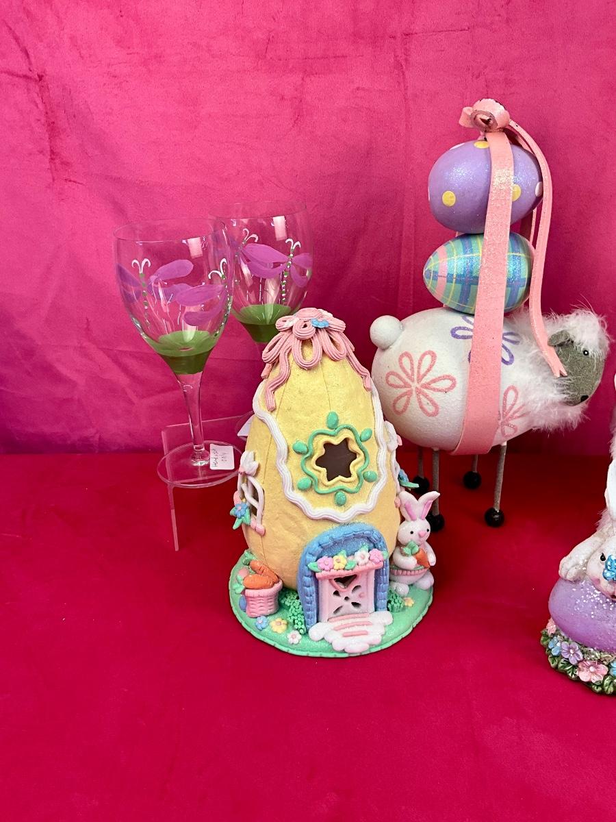 The lot contains wonderful whimsical Easter decorations. There is straw bunny with green egg, bunny in a handstand on an egg, ewe with eggs on it’s back and an egg house that lights up.