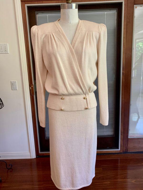 Vintage St. John, 2 pc. ivory knit wrap front gathers into ribbed band with 4 accent gold & rhinestone buttons. Wide shoulder pads, long sleeve. Matching pencil skirt.