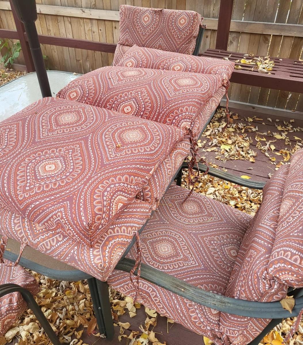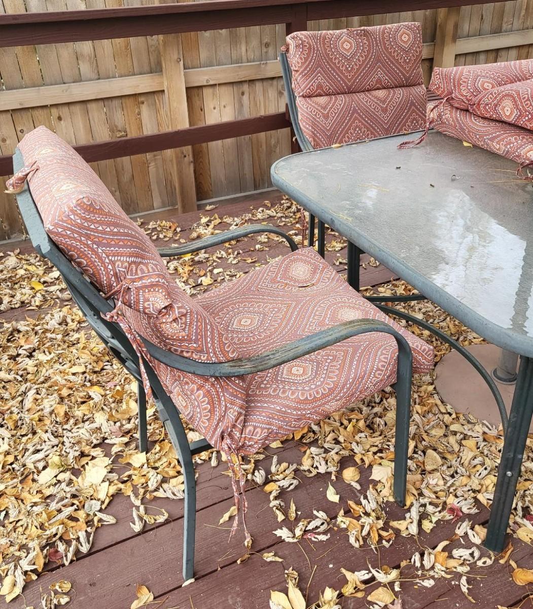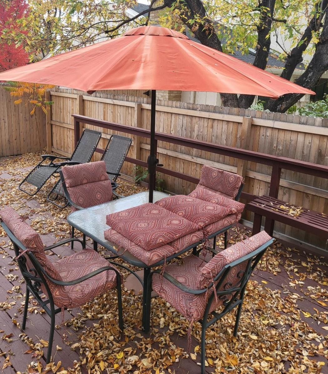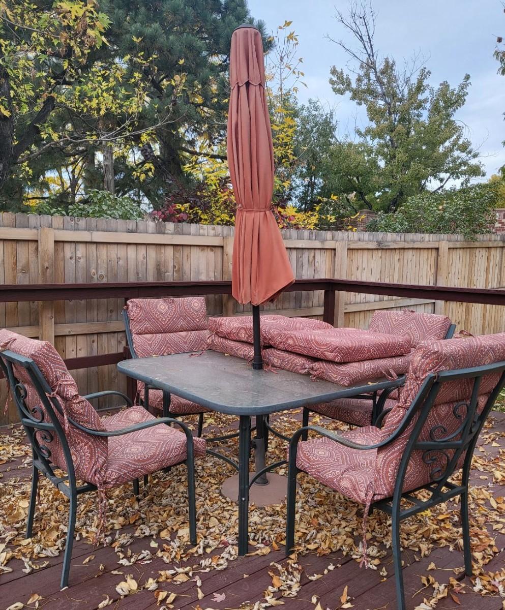 Chairs and umbrella are weathered, comes with 6 sets of chair cushions (in good condition), table has glass top.