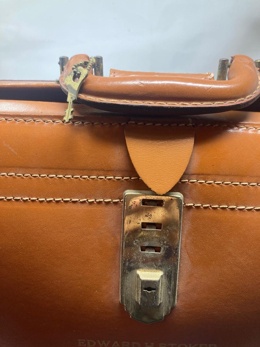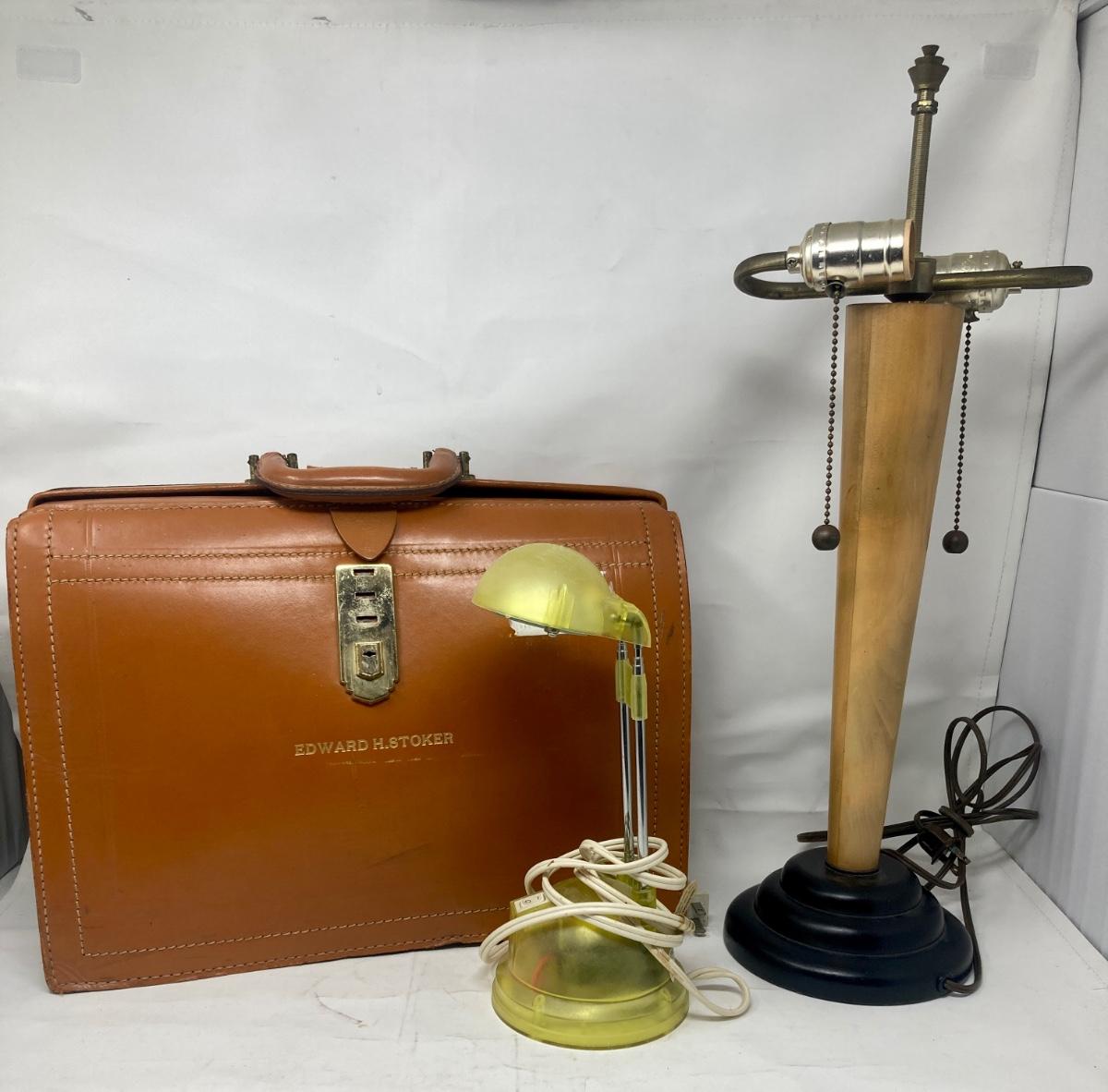 Vintage initialed attaché case locking with key, modern desk lamp and vintage lamp.