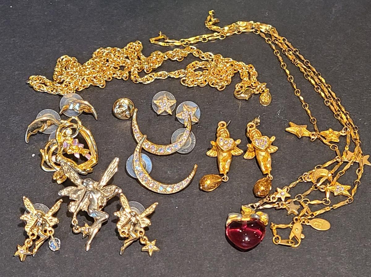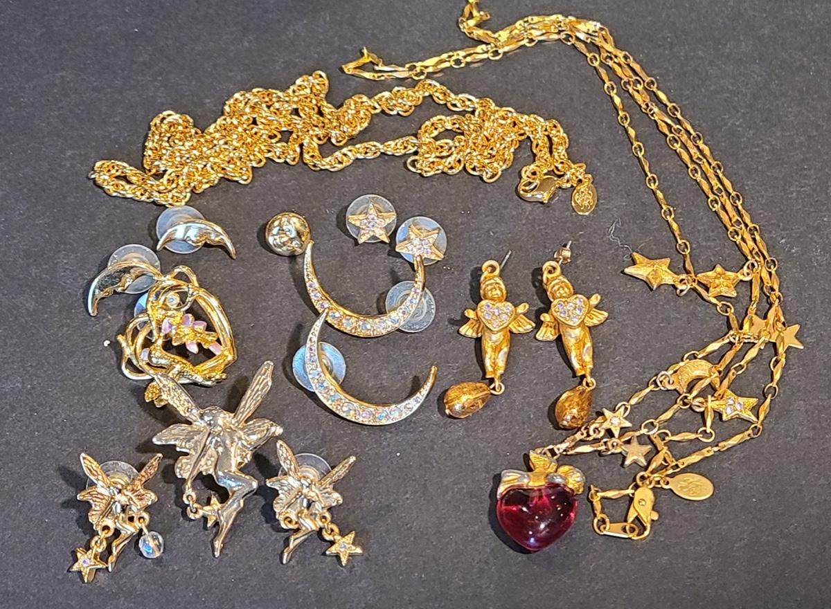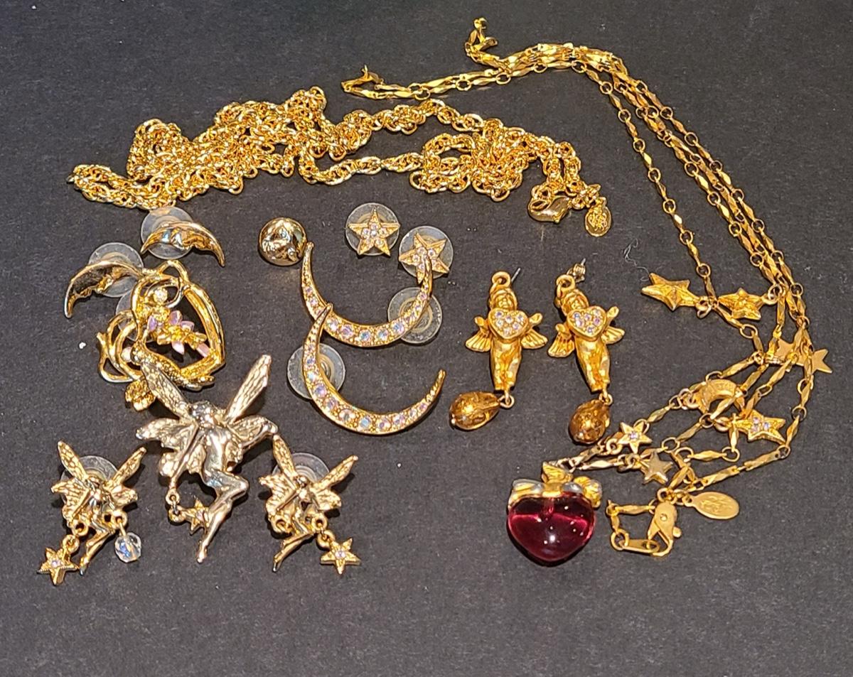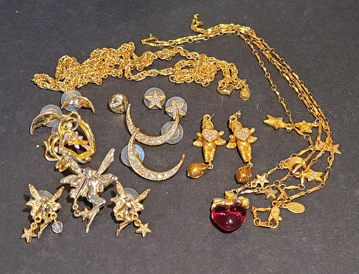 Costume jewerly, some by Kirks Folly including moon earrings, necklace and more. There is also an unmarked cute set of matching earrings and brooch of Fairies with dangles. Please see all pictures for content of the lot, condition of the lot, and measurements if taken. Pictures are the best representation of the items listed and items are untested unless indicated in description. Thank you for looking and have fun bidding!