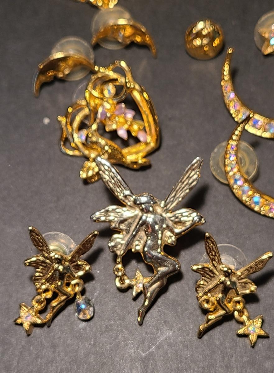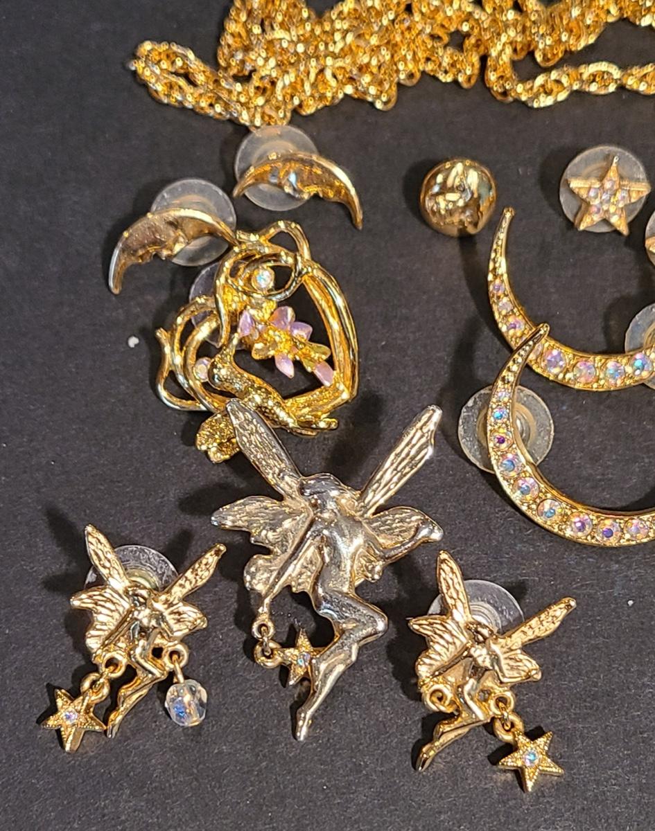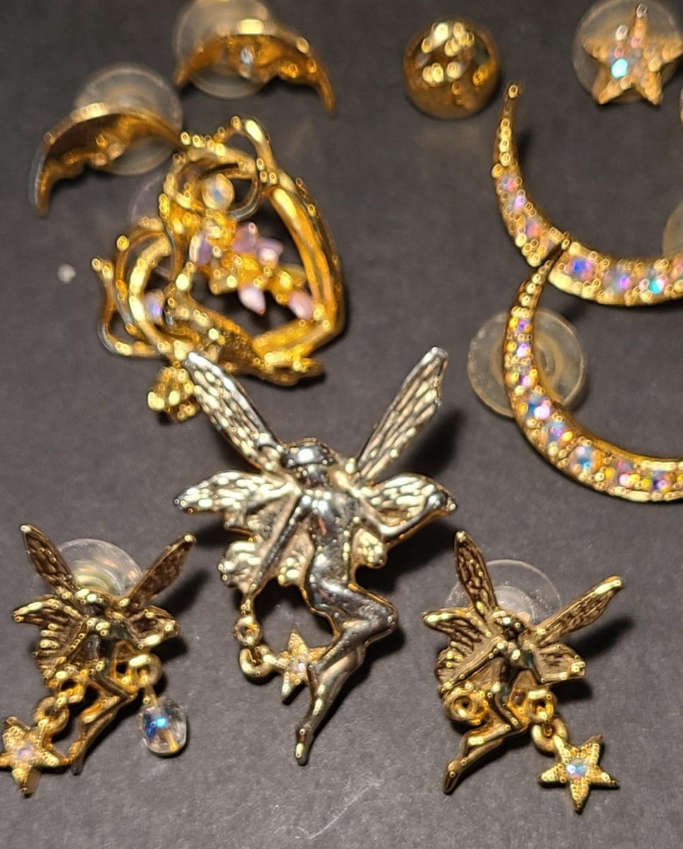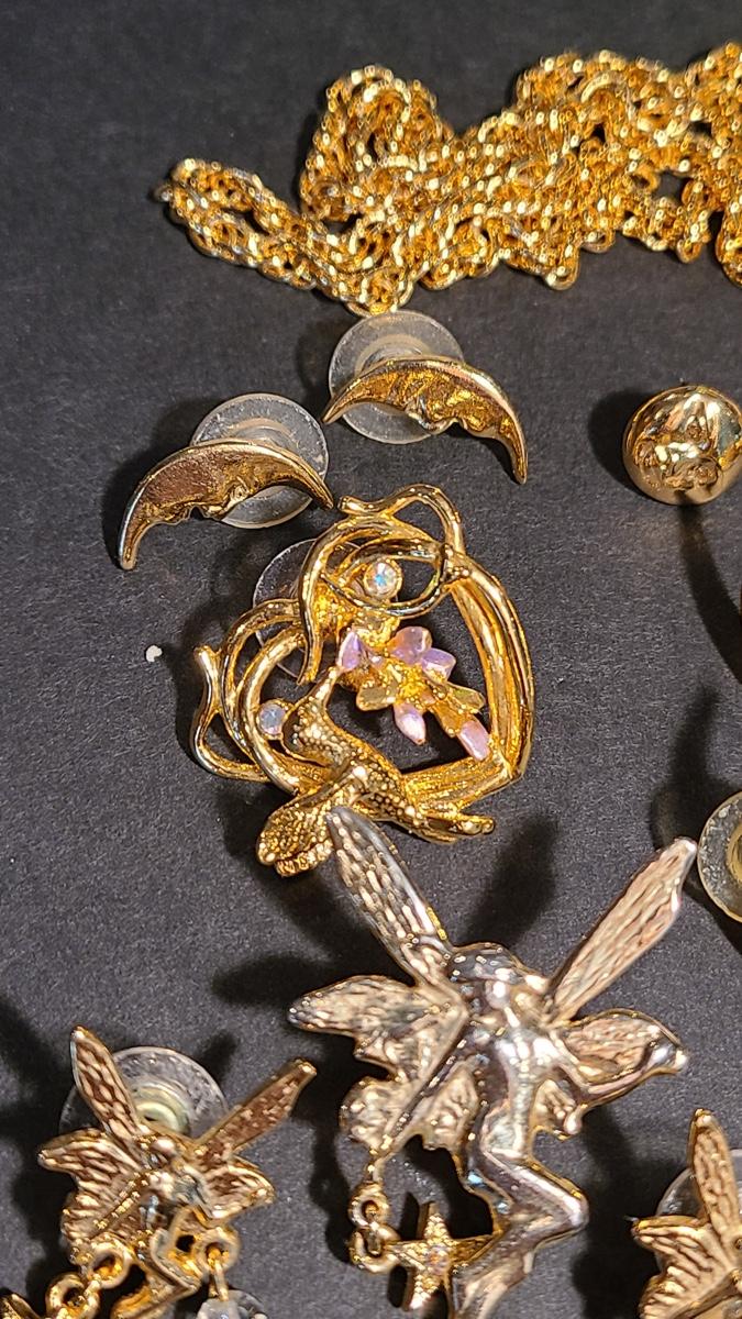 Costume jewerly, some by Kirks Folly including moon earrings, necklace and more. There is also an unmarked cute set of matching earrings and brooch of Fairies with dangles. Please see all pictures for content of the lot, condition of the lot, and measurements if taken. Pictures are the best representation of the items listed and items are untested unless indicated in description. Thank you for looking and have fun bidding!