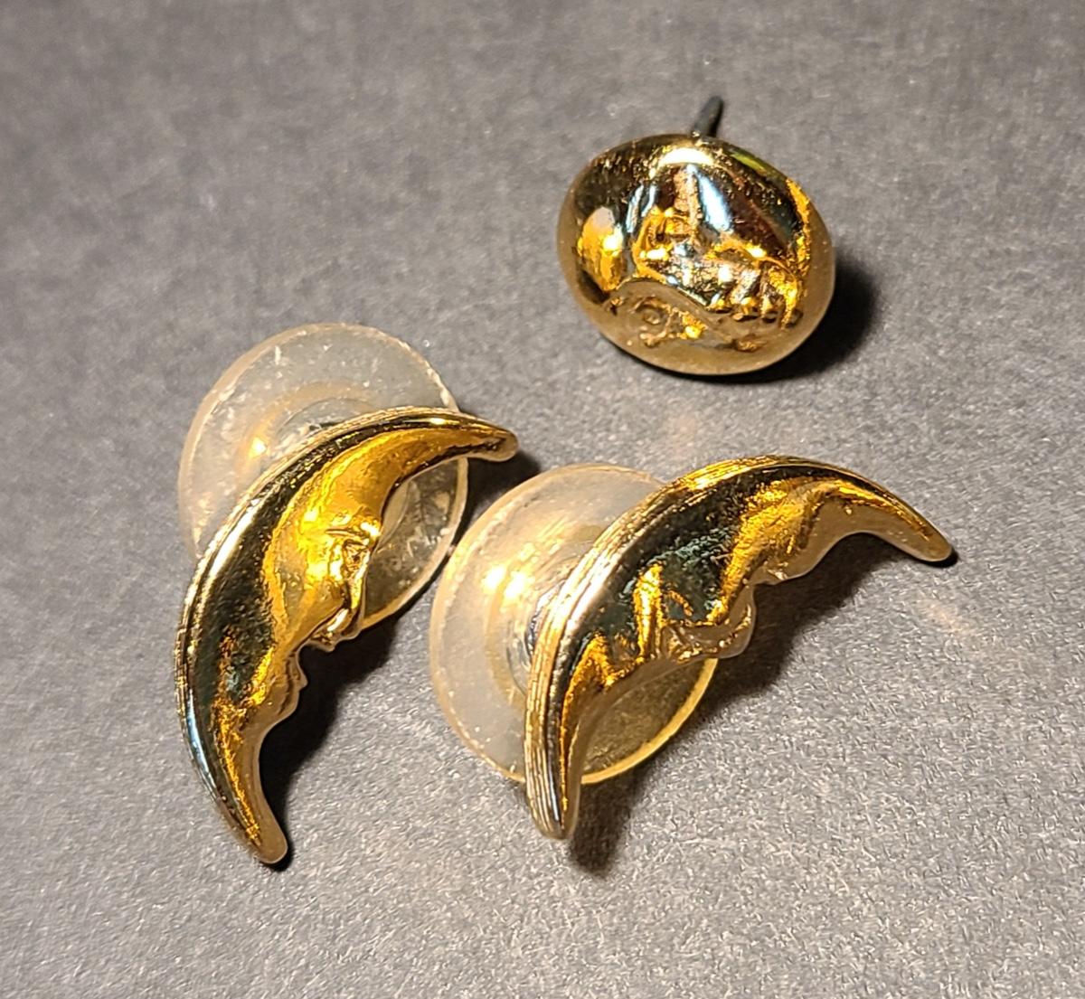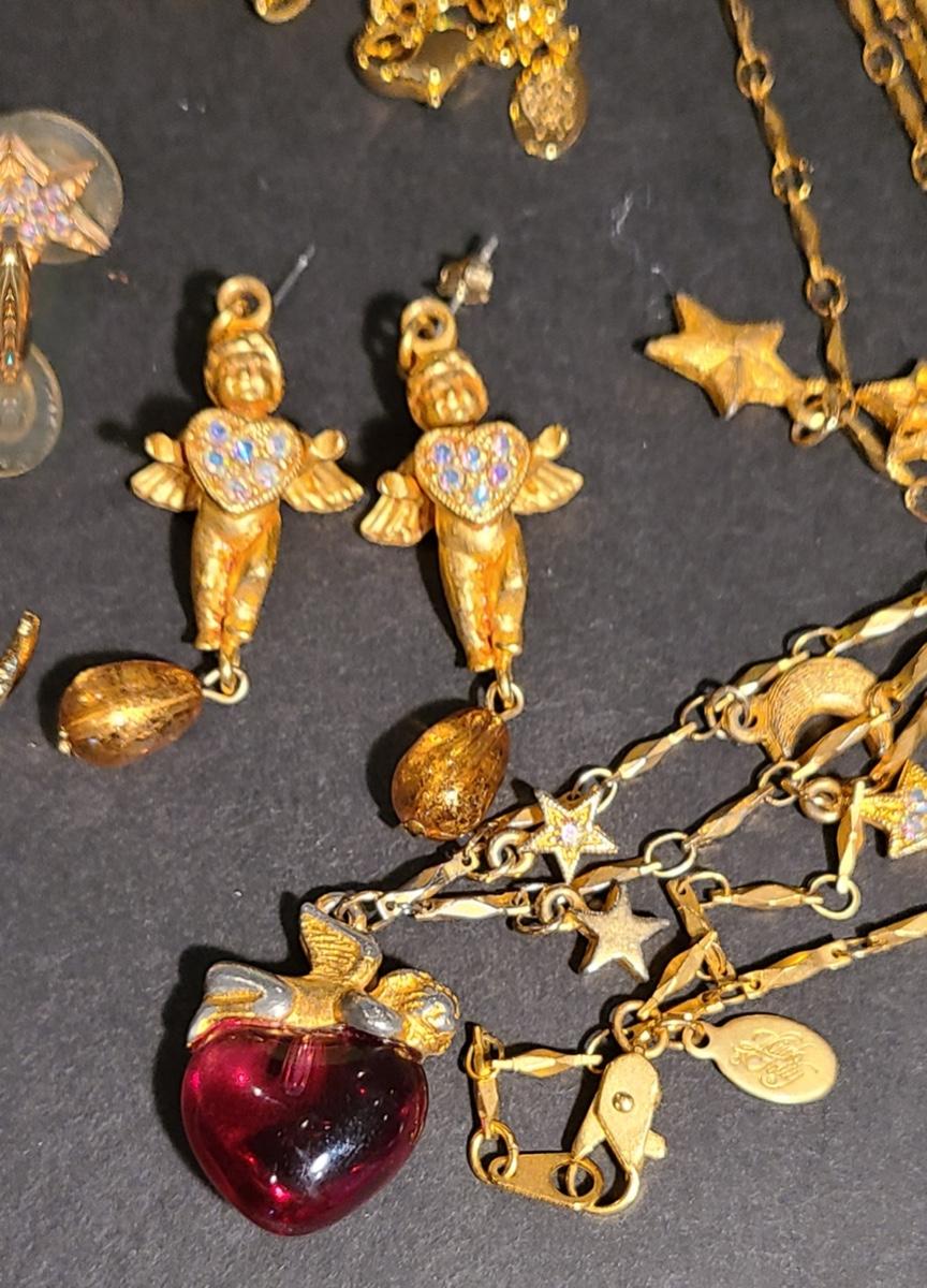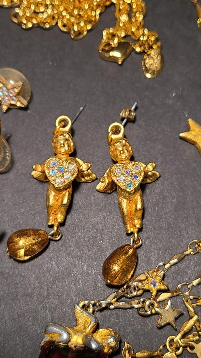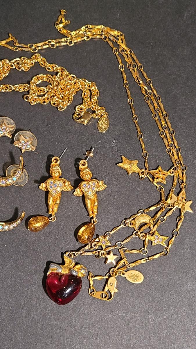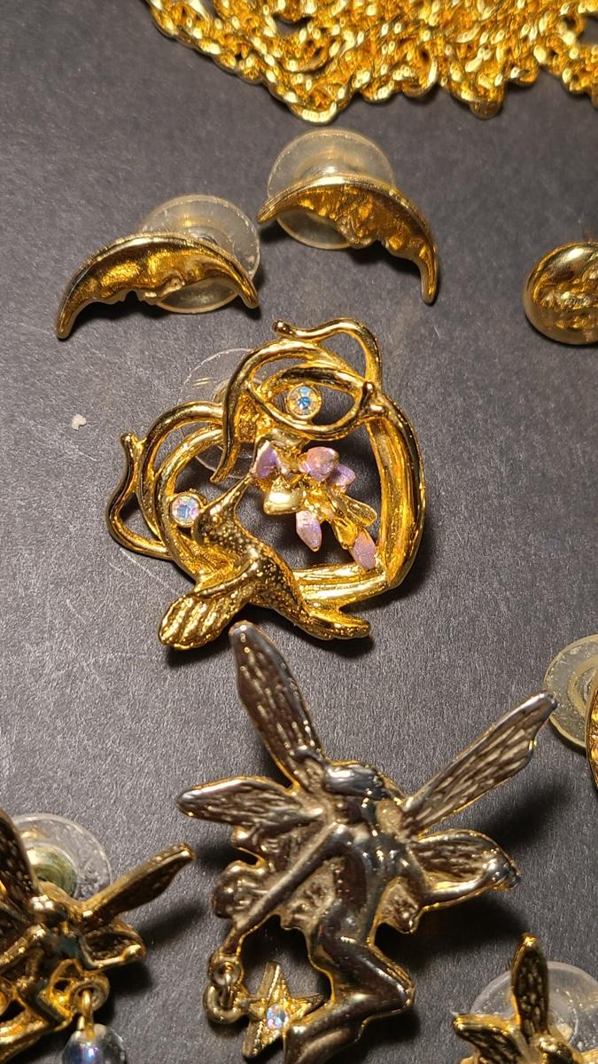 Costume jewerly, some by Kirks Folly including moon earrings, necklace and more. There is also an unmarked cute set of matching earrings and brooch of Fairies with dangles. Please see all pictures for content of the lot, condition of the lot, and measurements if taken. Pictures are the best representation of the items listed and items are untested unless indicated in description. Thank you for looking and have fun bidding!