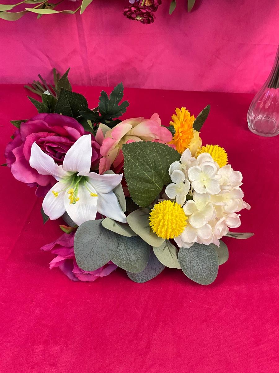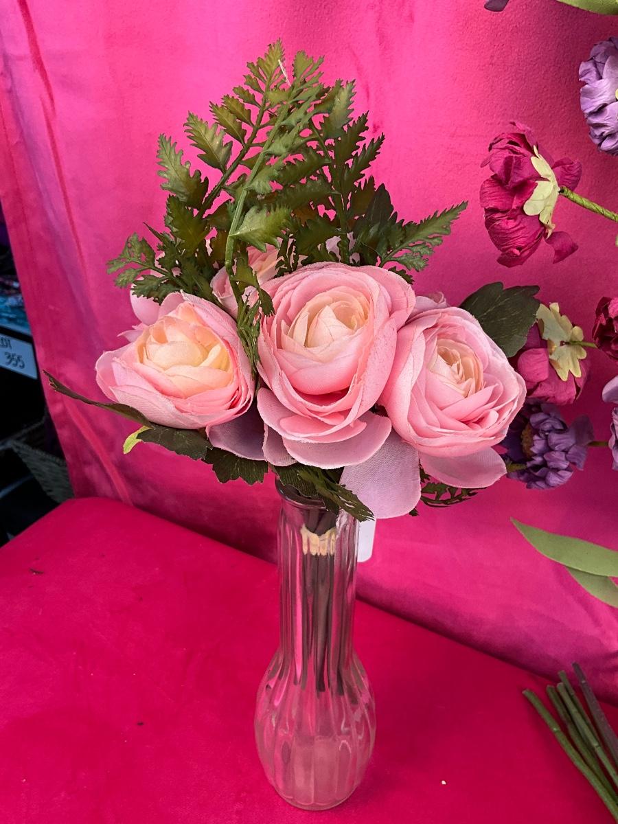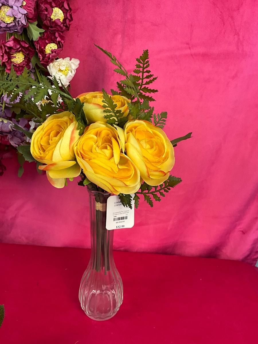The lot contains 16” Pier 1 floral wreath, 10 stems of pink roses, 10 stems of yellow roses both new with tags from Pier 1. There is a 9 stem bouquet from Pier 1 that is new with tags.