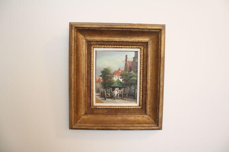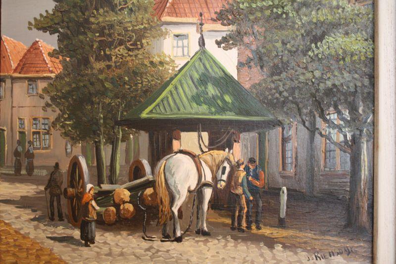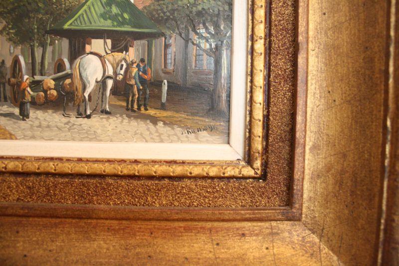 J Riemsdyk Signed Oil Painting on Hard Board - Original oil painting on hard board. Crisp bright color painting of a village scene. Measures 9.5 x 11.5 inches frame 16 x 19 inches.