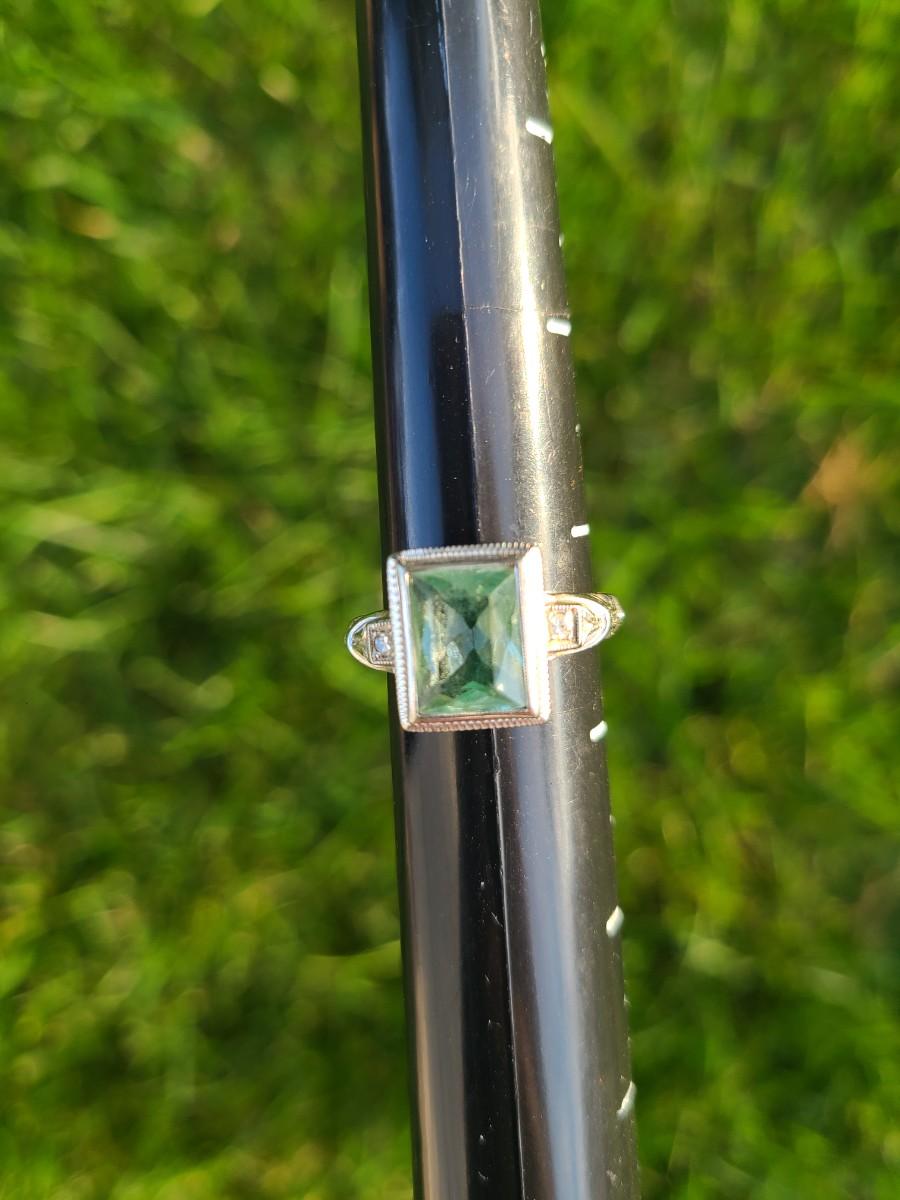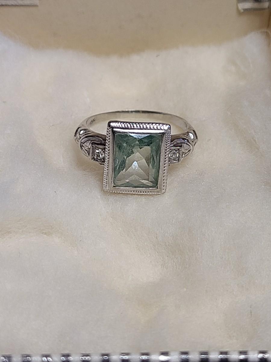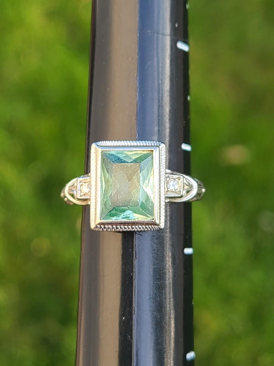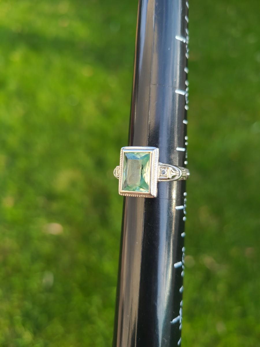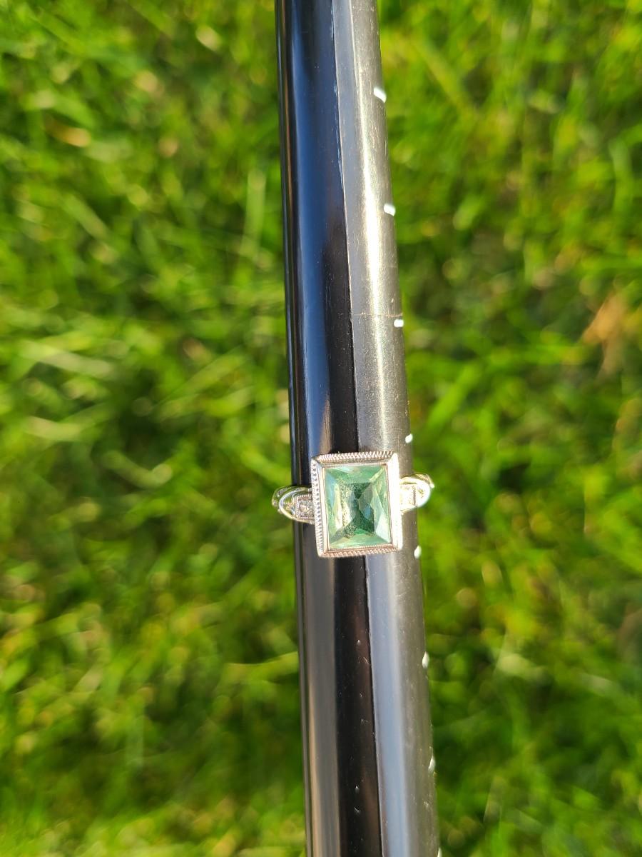 This gorgeous 18kt white gold ring has a stone setting that in some lights is a pale green, and in natural outside light shines vibrant green, and in evening light a soft blue green (The last pictures). It is surrounded on either side with diamond chips. Lovely piece! Please see all pictures of the items as that is the best representation of the condition and shows sizing if taken.