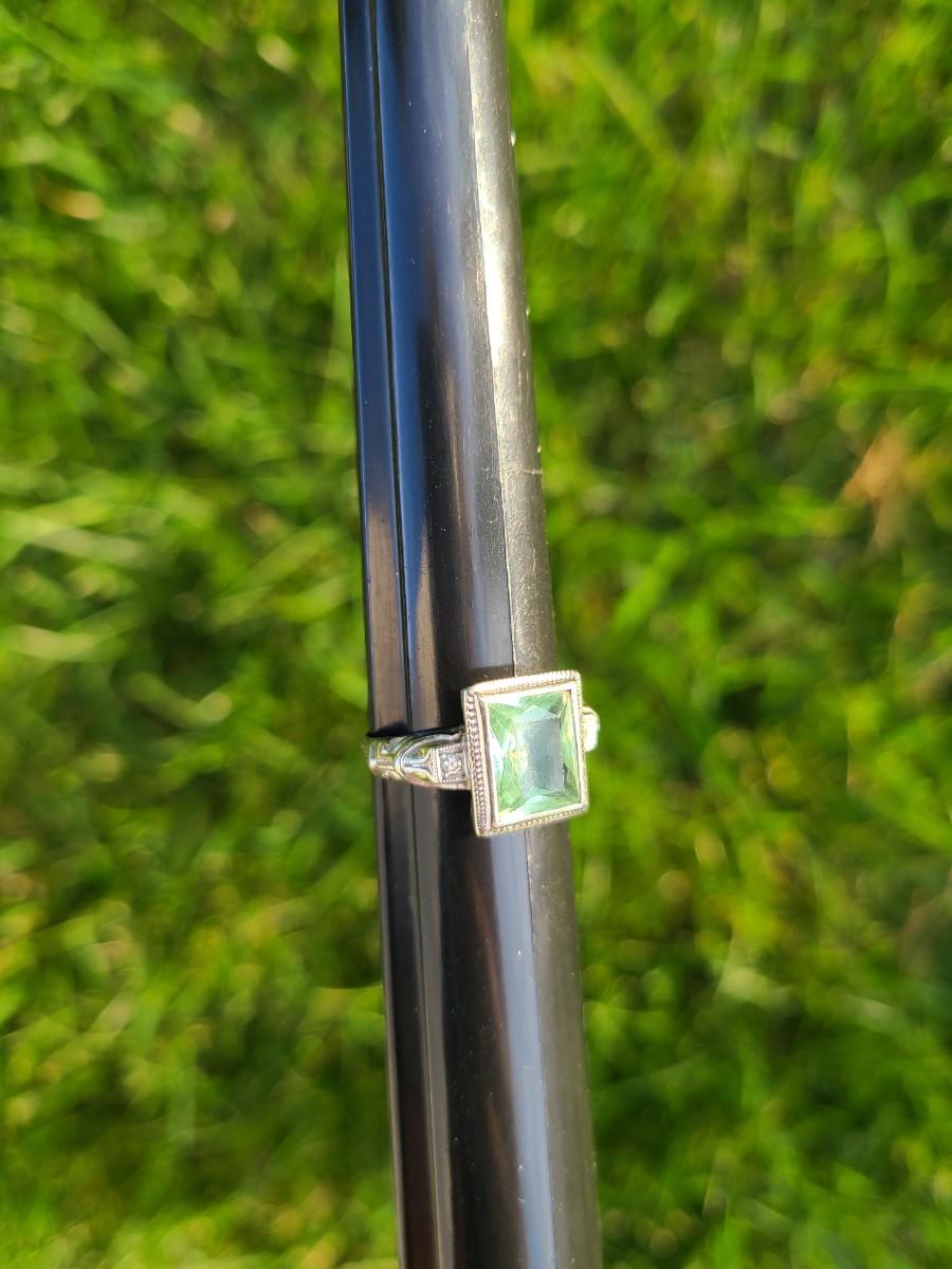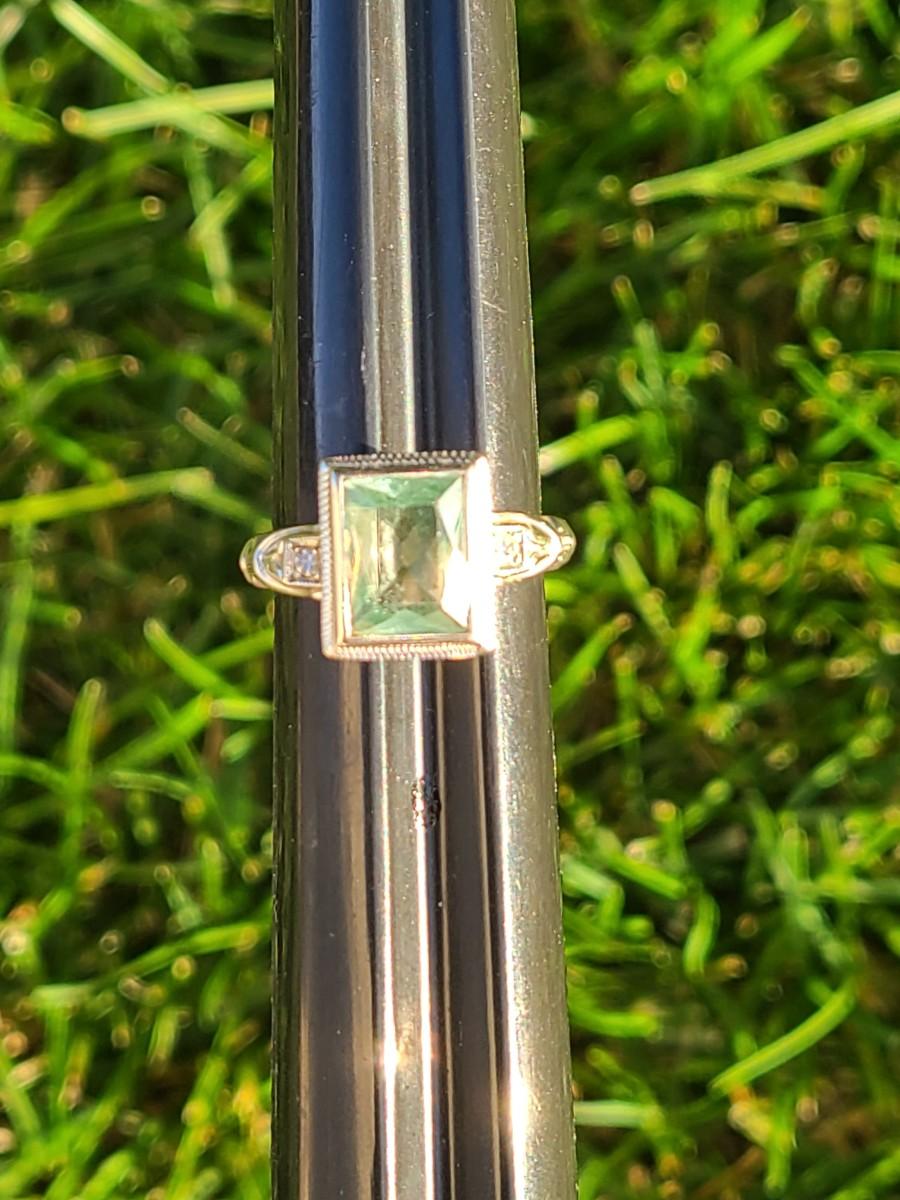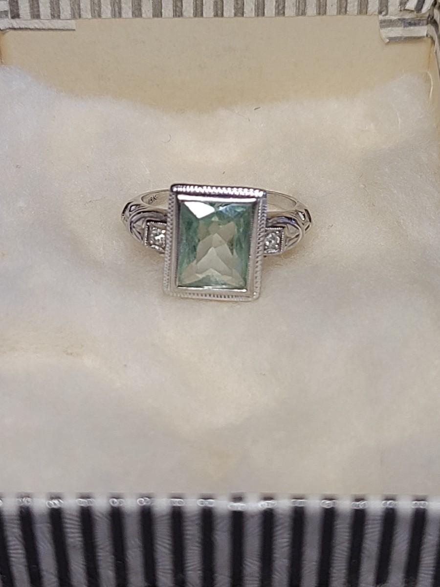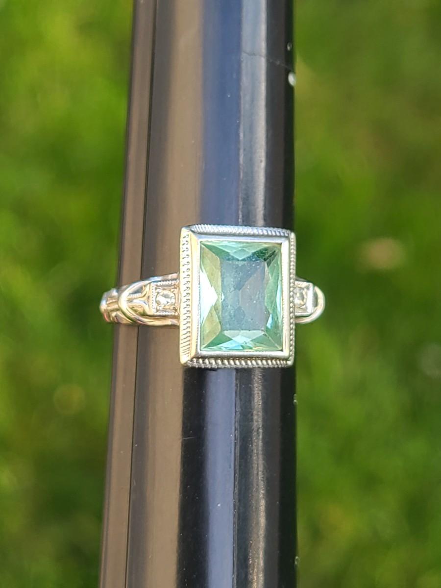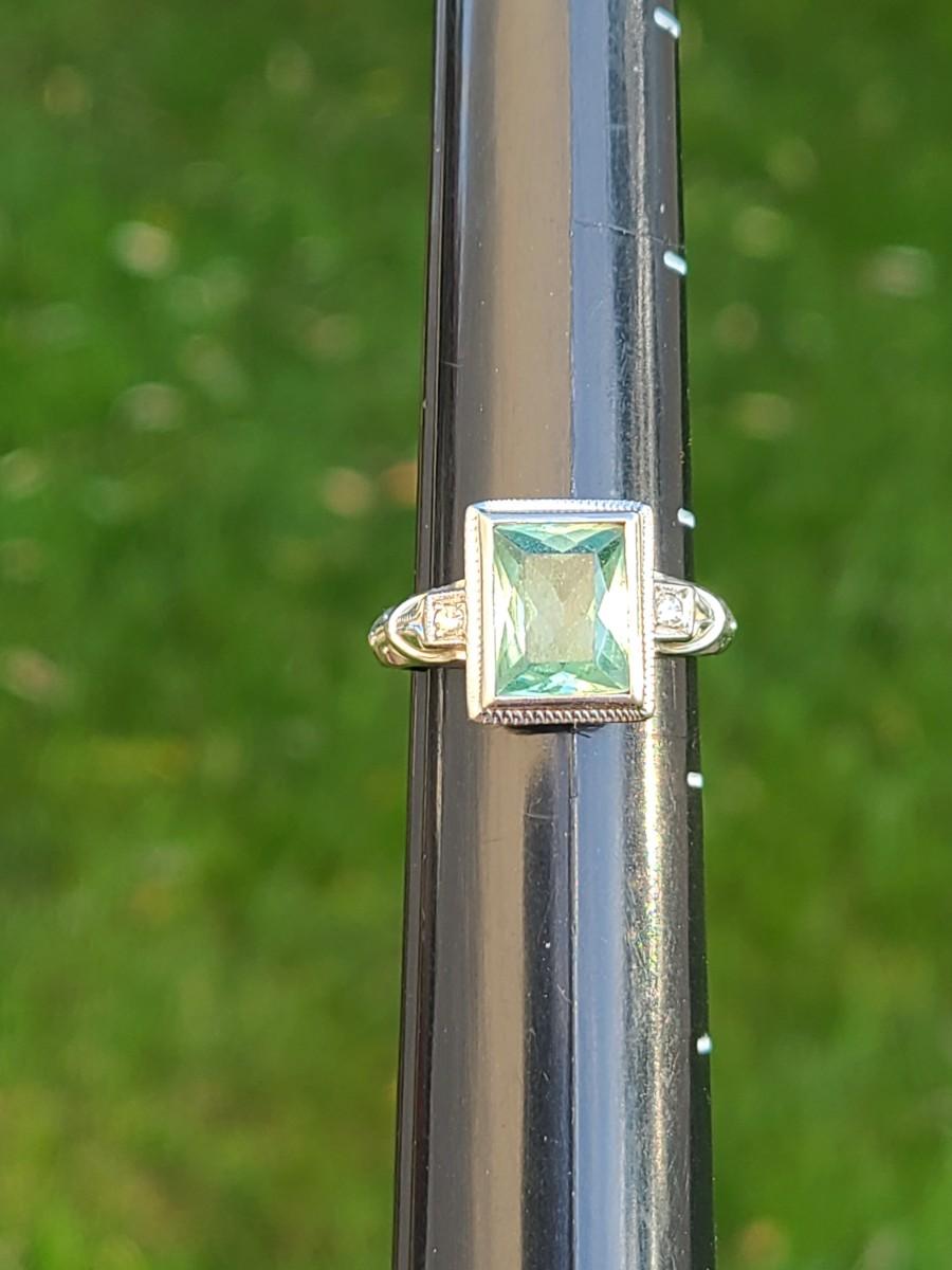 This gorgeous 18kt white gold ring has a stone setting that in some lights is a pale green, and in natural outside light shines vibrant green, and in evening light a soft blue green (The last pictures). It is surrounded on either side with diamond chips. Lovely piece! Please see all pictures of the items as that is the best representation of the condition and shows sizing if taken.