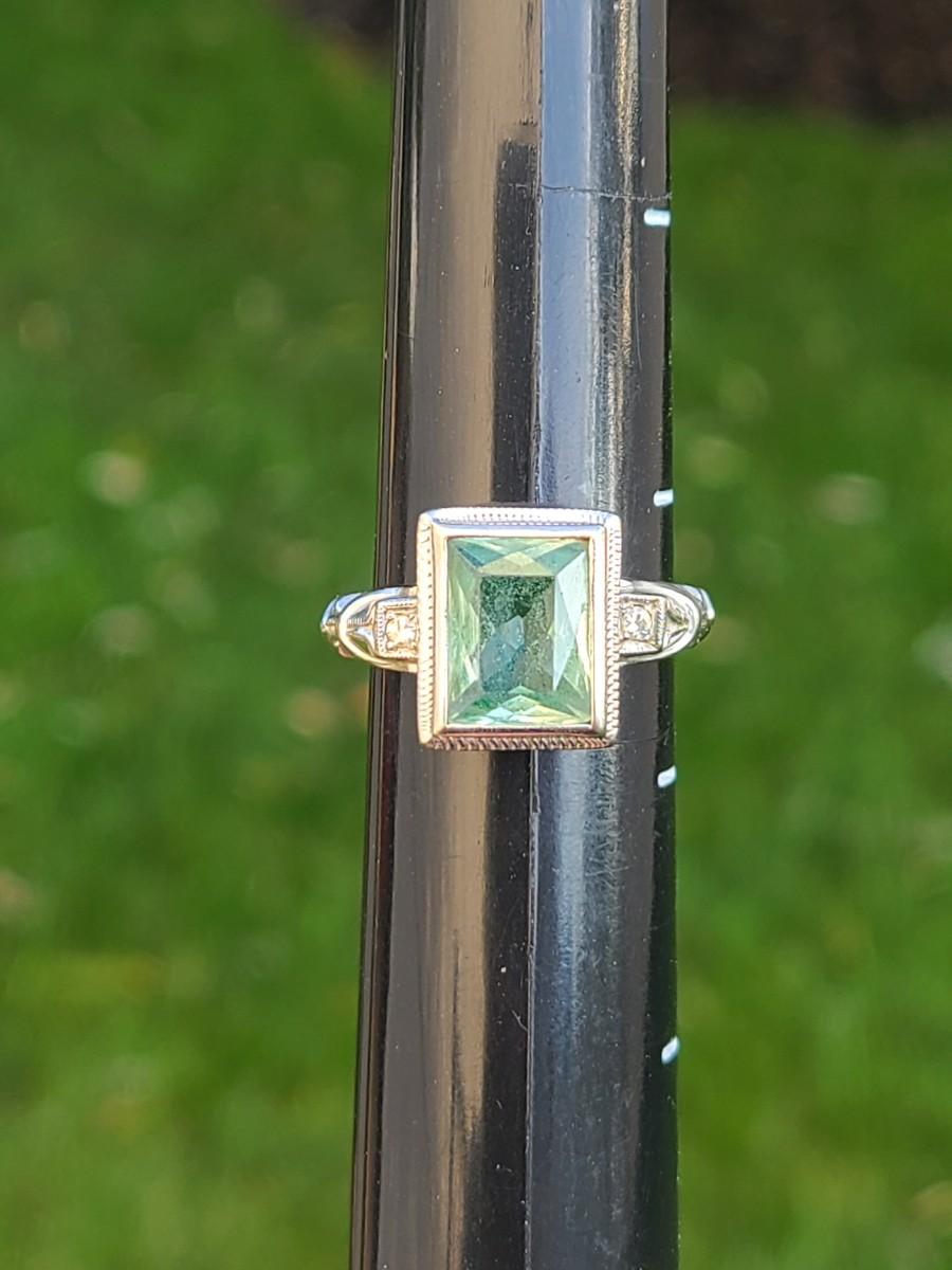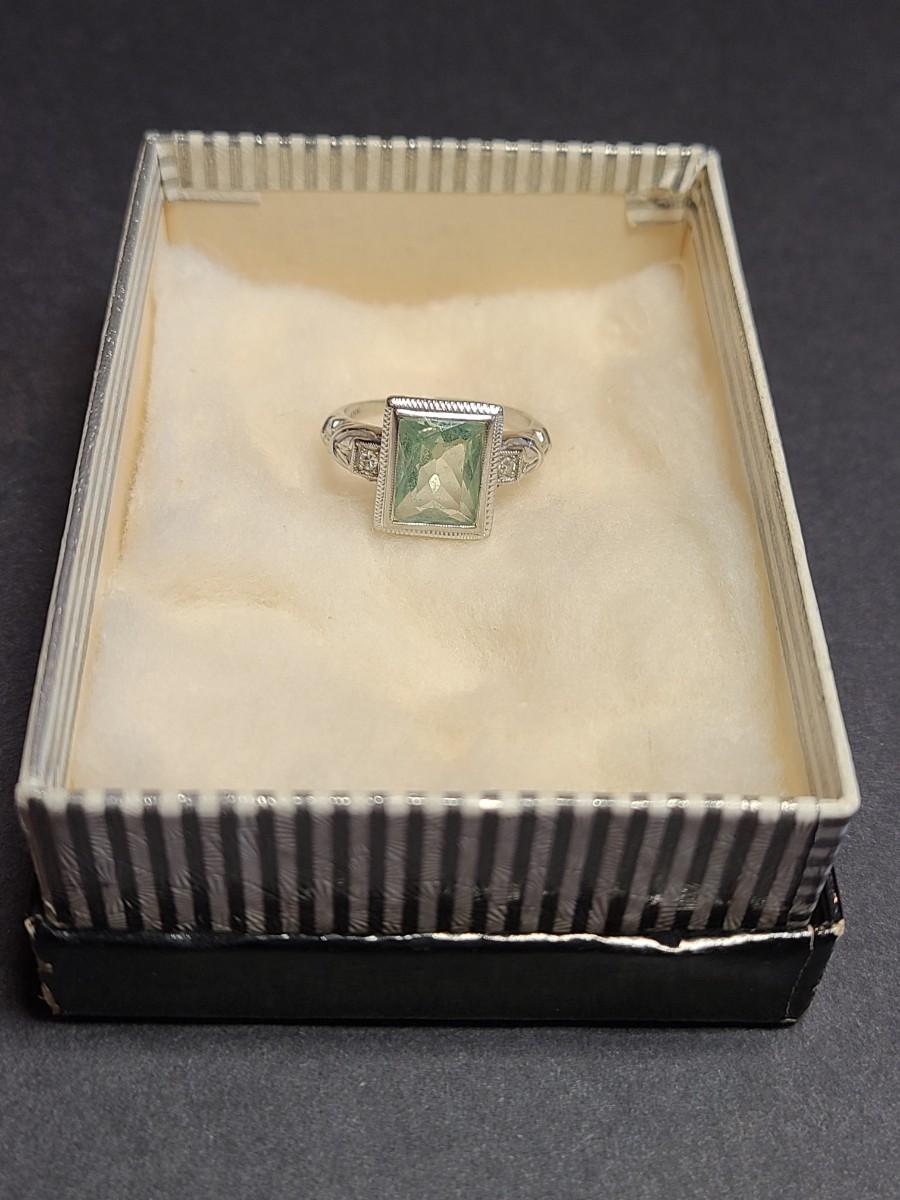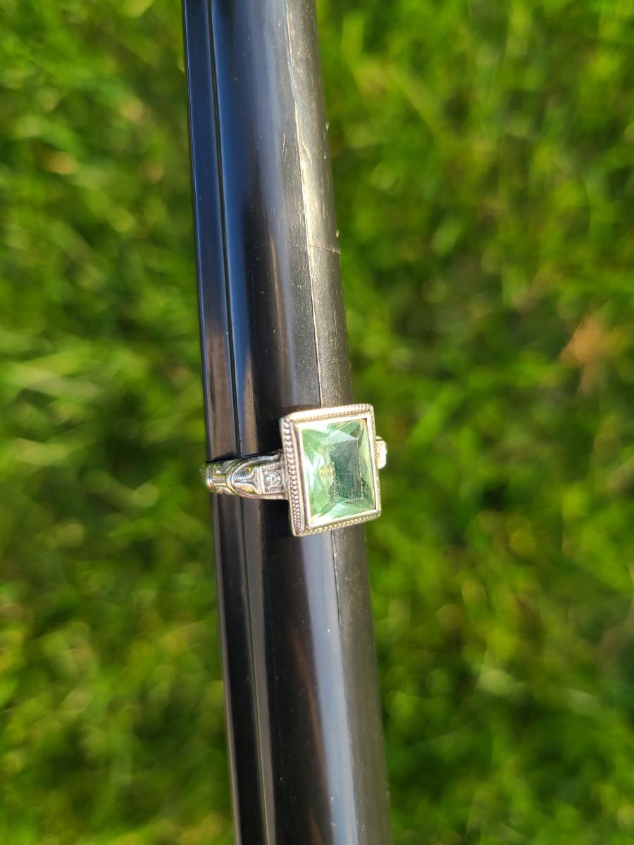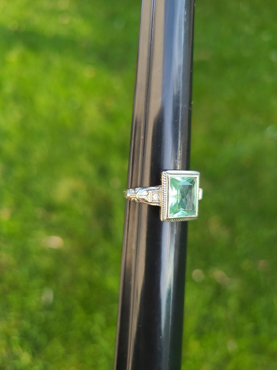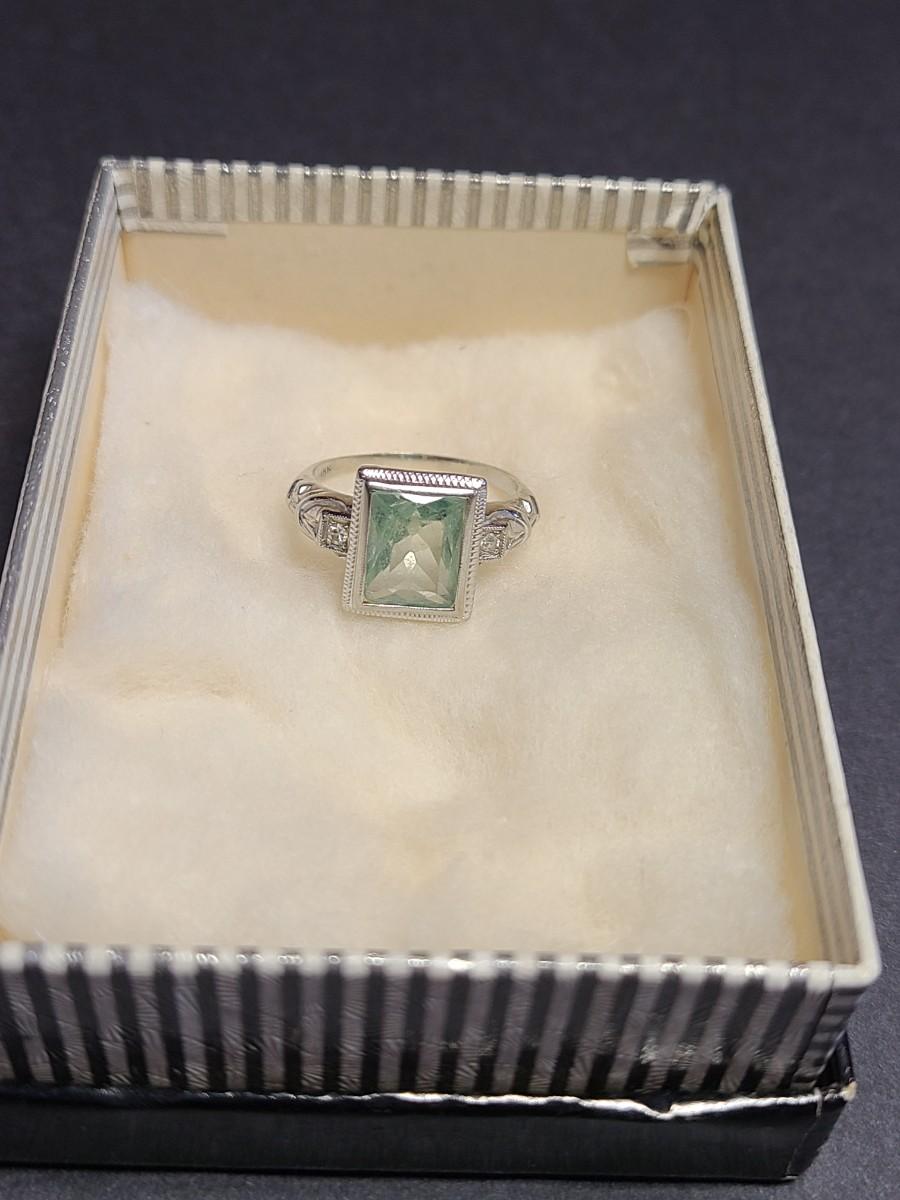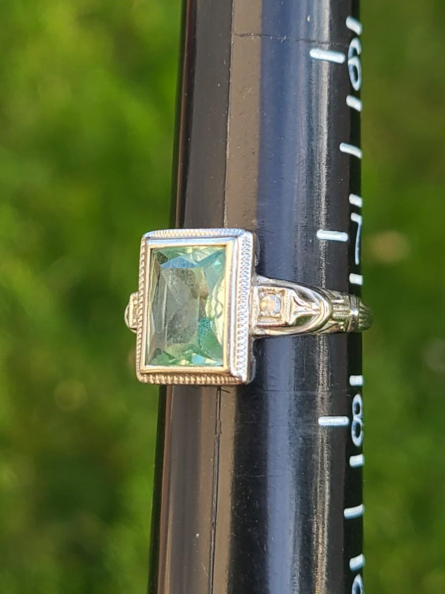 This gorgeous 18kt white gold ring has a stone setting that in some lights is a pale green, and in natural outside light shines vibrant green, and in evening light a soft blue green (The last pictures). It is surrounded on either side with diamond chips. Lovely piece! Please see all pictures of the items as that is the best representation of the condition and shows sizing if taken.
