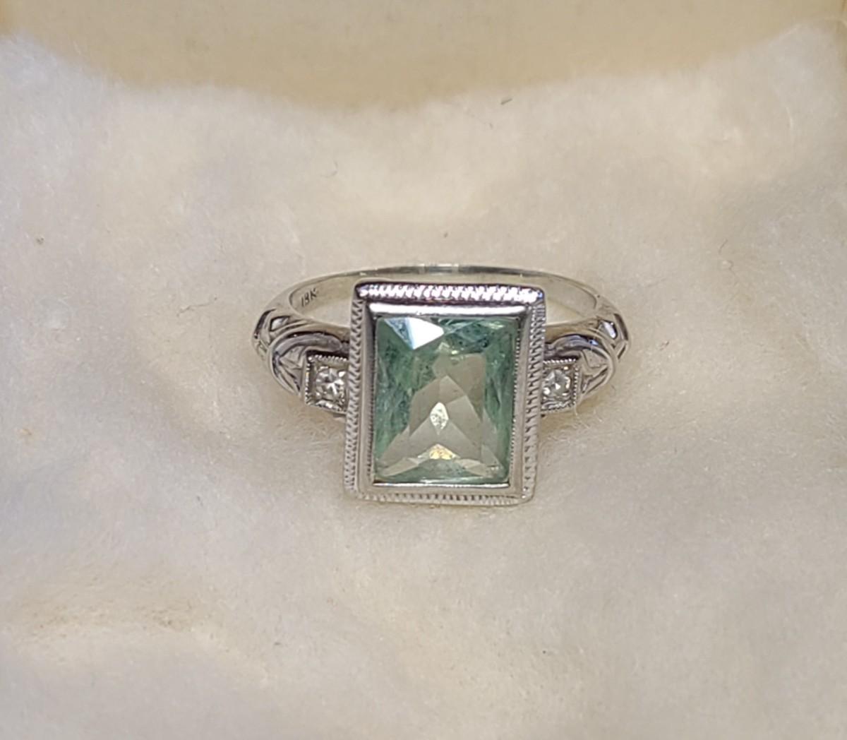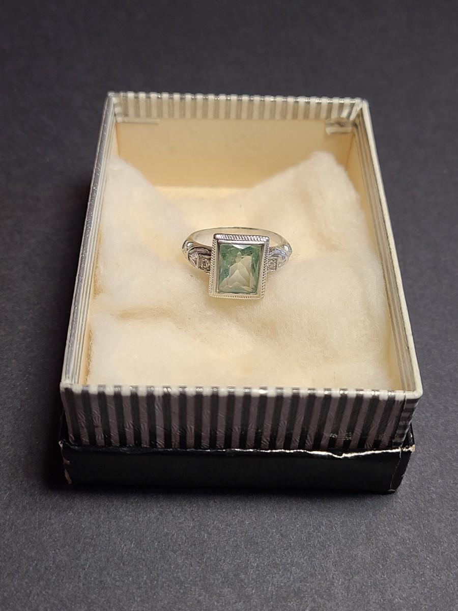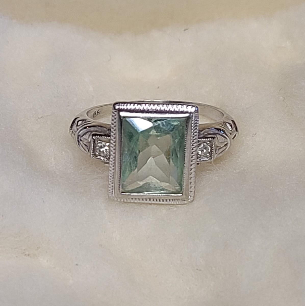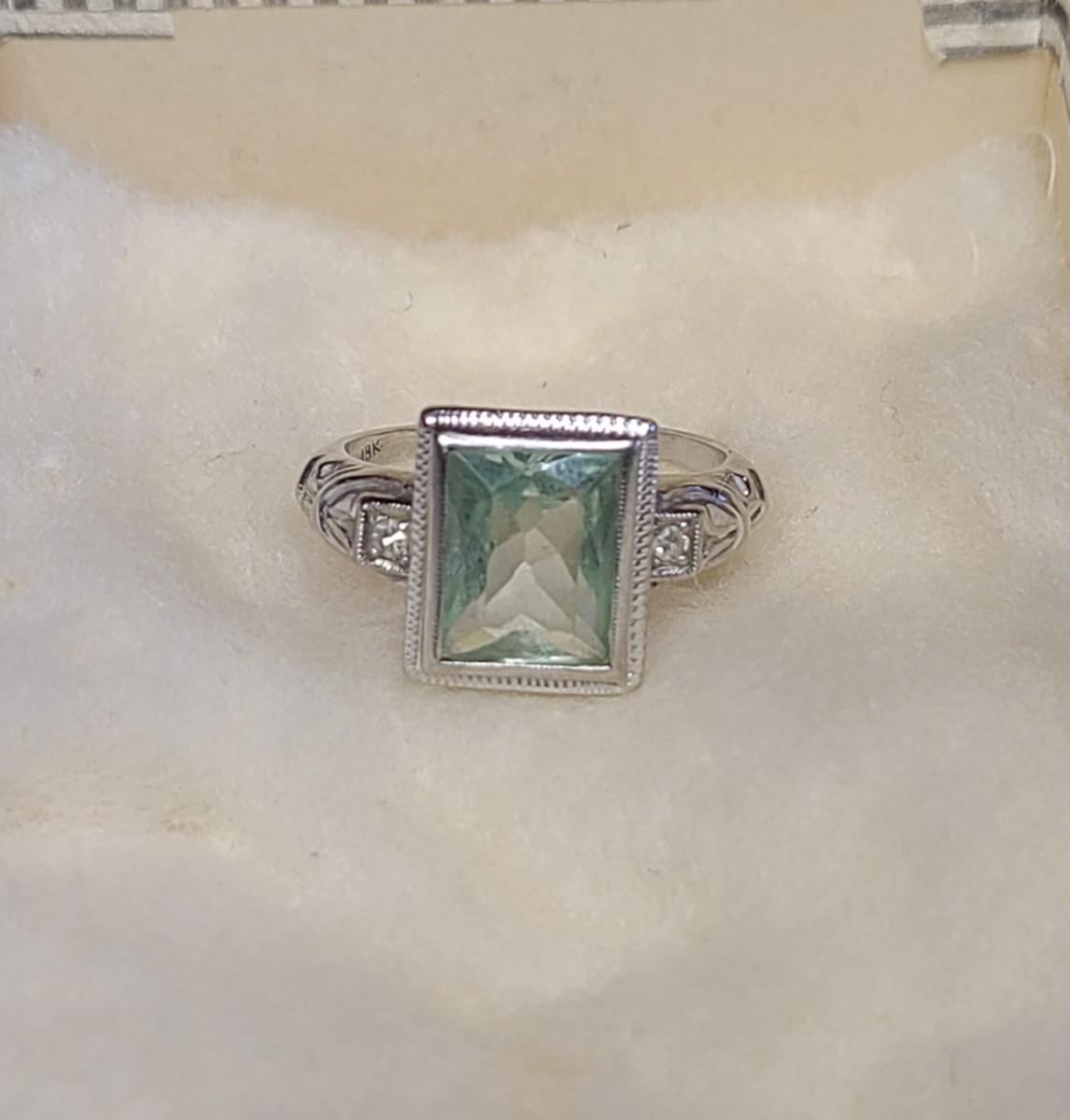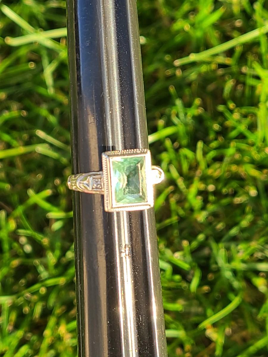 This gorgeous 18kt white gold ring has a stone setting that in some lights is a pale green, and in natural outside light shines vibrant green, and in evening light a soft blue green (The last pictures). It is surrounded on either side with diamond chips. Lovely piece! Please see all pictures of the items as that is the best representation of the condition and shows sizing if taken.