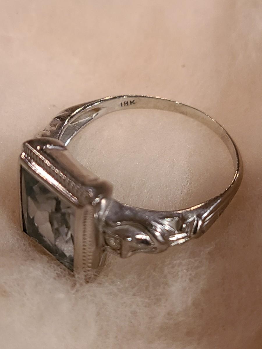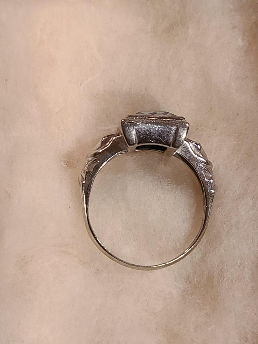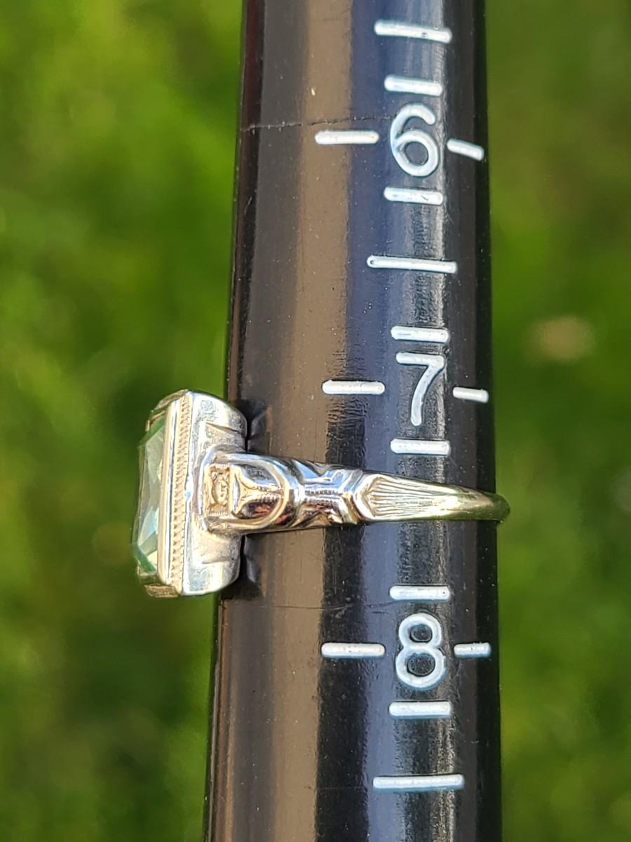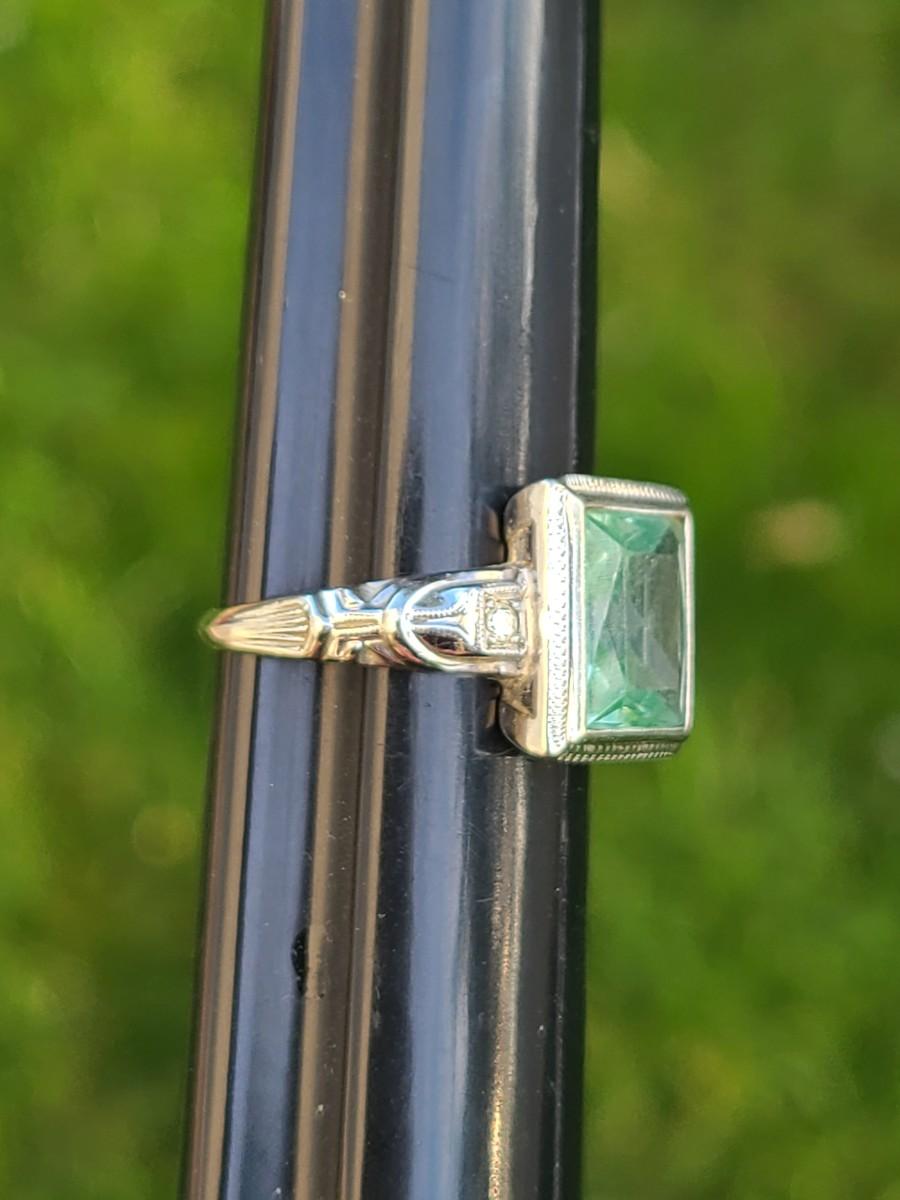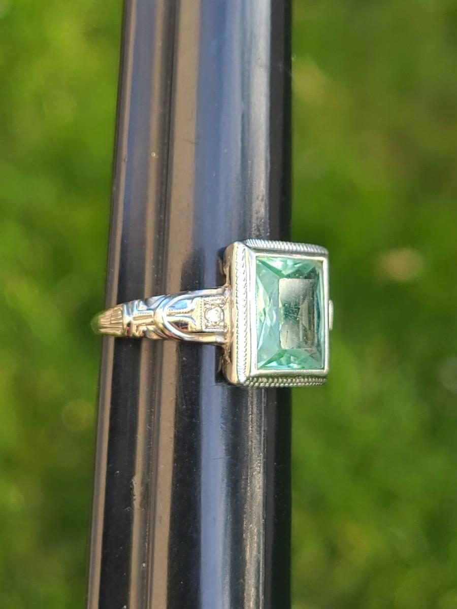 This gorgeous 18kt white gold ring has a stone setting that in some lights is a pale green, and in natural outside light shines vibrant green, and in evening light a soft blue green (The last pictures). It is surrounded on either side with diamond chips. Lovely piece! Please see all pictures of the items as that is the best representation of the condition and shows sizing if taken.