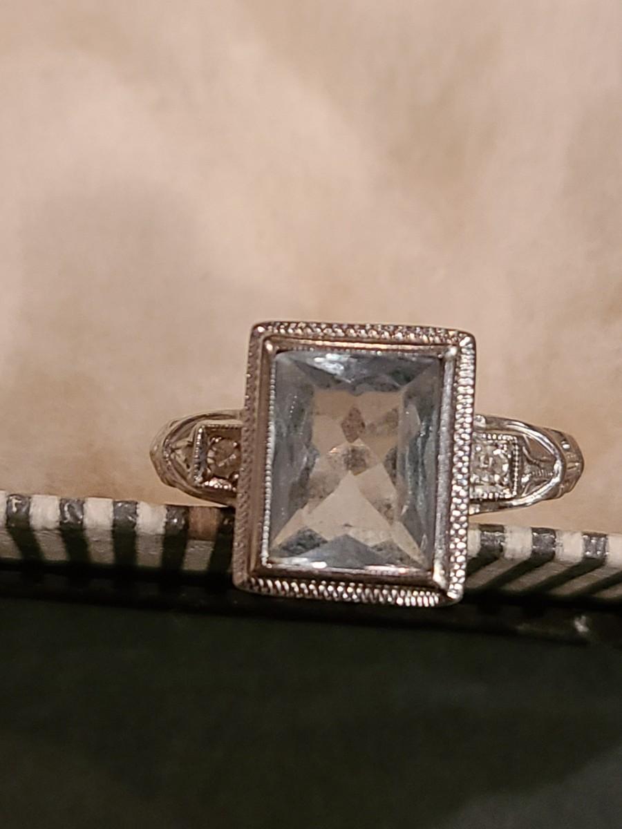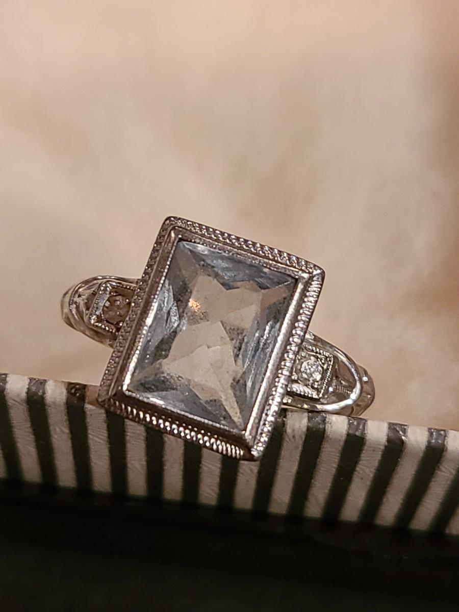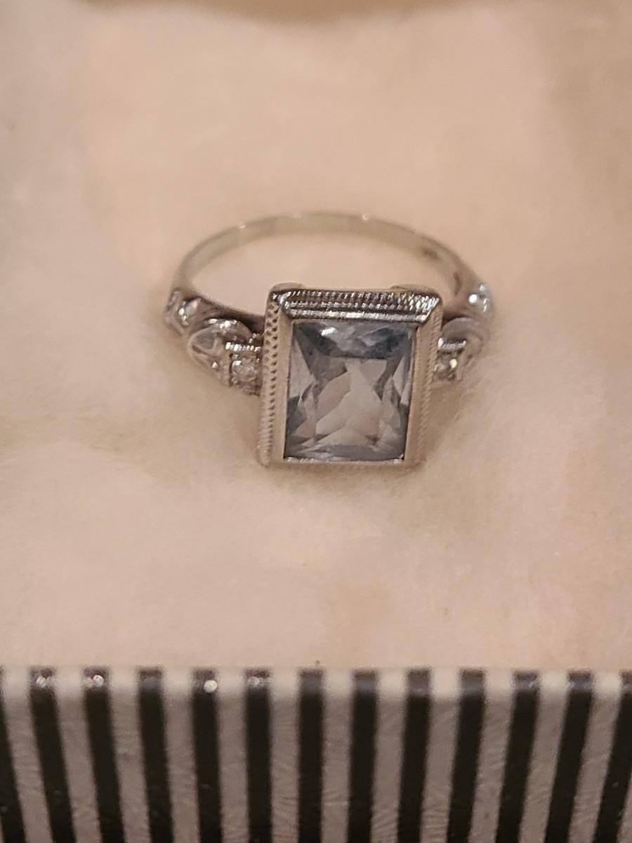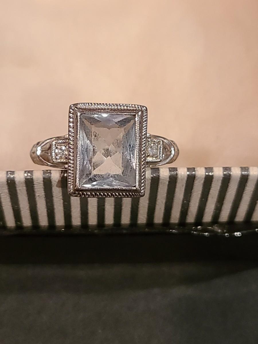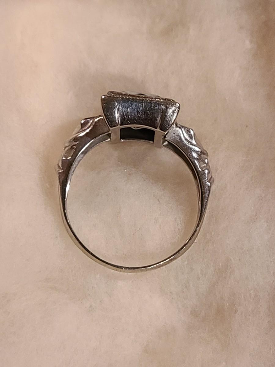 This gorgeous 18kt white gold ring has a stone setting that in some lights is a pale green, and in natural outside light shines vibrant green, and in evening light a soft blue green (The last pictures). It is surrounded on either side with diamond chips. Lovely piece! Please see all pictures of the items as that is the best representation of the condition and shows sizing if taken.