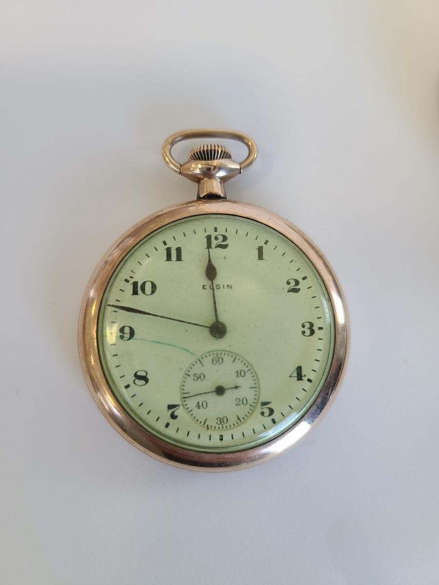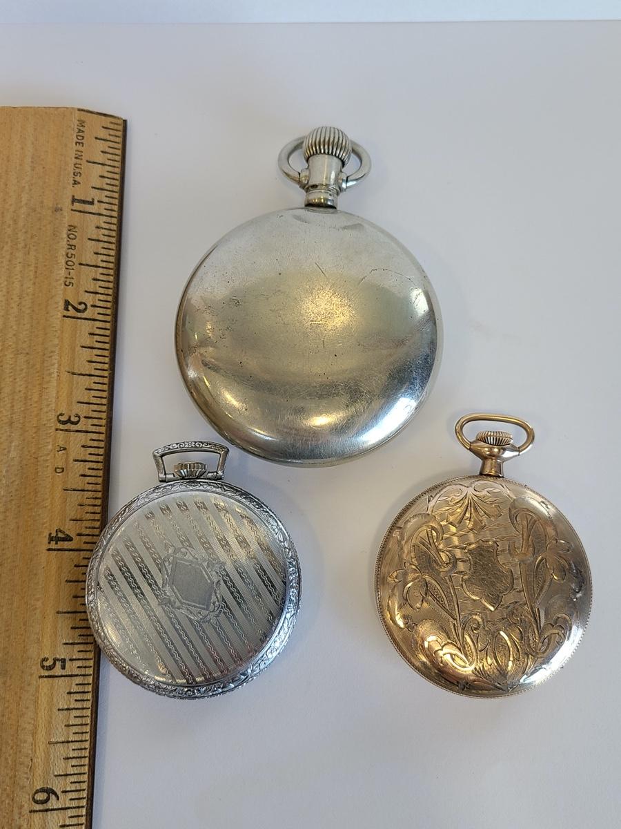 Green Glass Elgin ticks but hands do not turn, large heavy Elgin we could not get back open and will most likely need a watch key, smaller silver Elgin hands move but does not tick. We do not know the full capability of these watches so we mention what we do know. The others do not or may need a key to function. Great for cases and parts also. Please see all pictures as they are the best representation of the items. The pictures show condition, measurements if taken, and what is included in the lot. Due to the large amount that we photograph and the time frame, we are not always able to take measurements. All items unless noted, are pre-owned and have been used. If you purchased furniture, you must bring help. We do not allow one person to carry large furniture out on their own. Bring help, tools and a truck for the safety of our client’s homes, and your personal safety. Bring packing supplies such as boxes and packing. Company policy. Thank you.