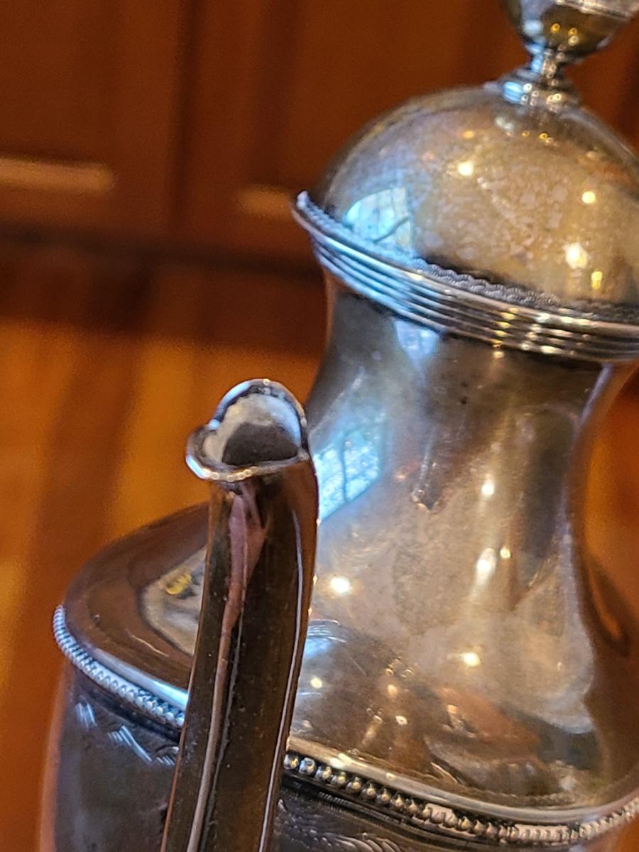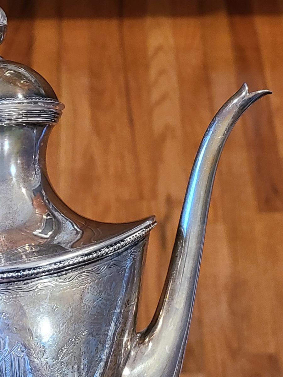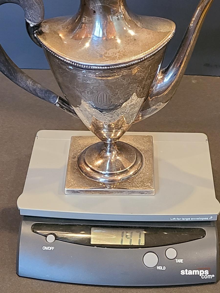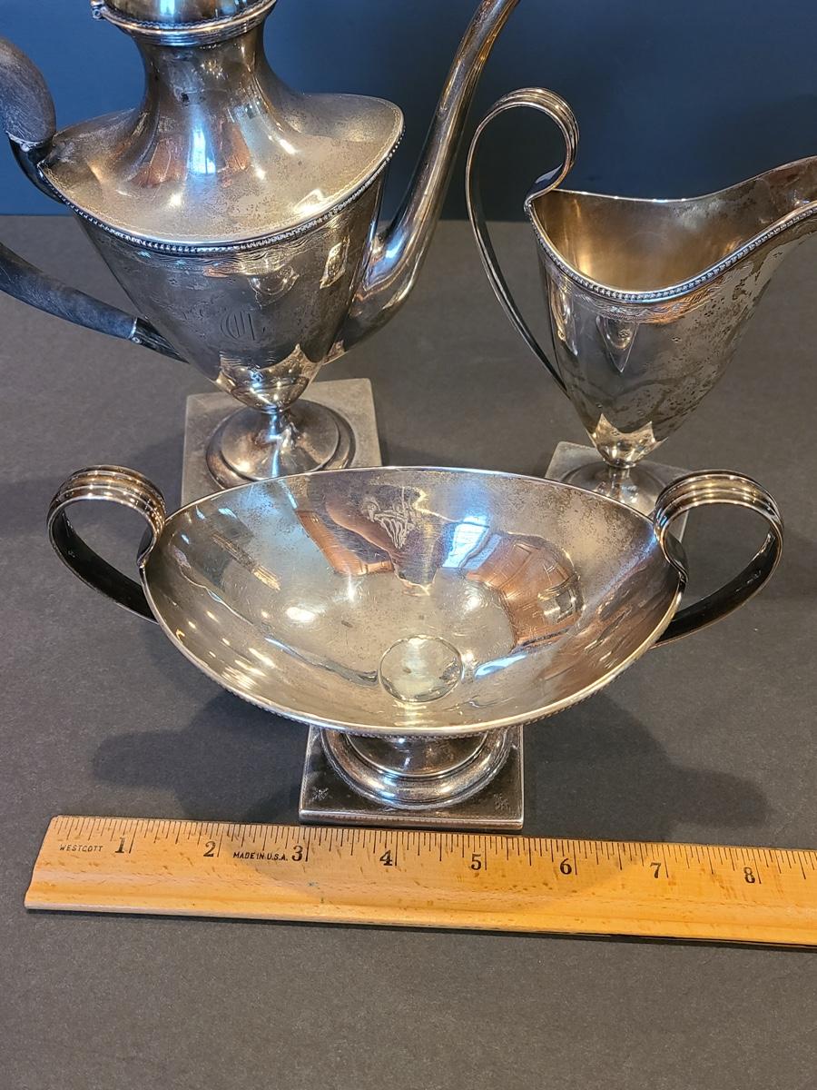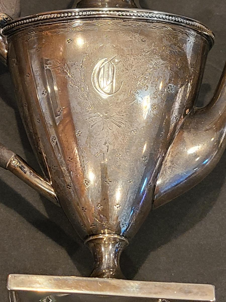 This antique/vintage set is gorgeous! It is hard to find sets like these still together. On one side of each piece is a wreath and on the other a "C", to some it also looks like a "D", but the client confirmed it is a C, but you could use either way. This set is older and sits just a little "cockeyed". These are solid sterling pieces, minus the handle and wood cap on the teapot. These are worth more than scrap due to their collectibility and age. These would look stunning polished! Please see all pictures as they are the best representation of the items, and show the condition and measurements if taken. You will need to bring your own packaging supplies.