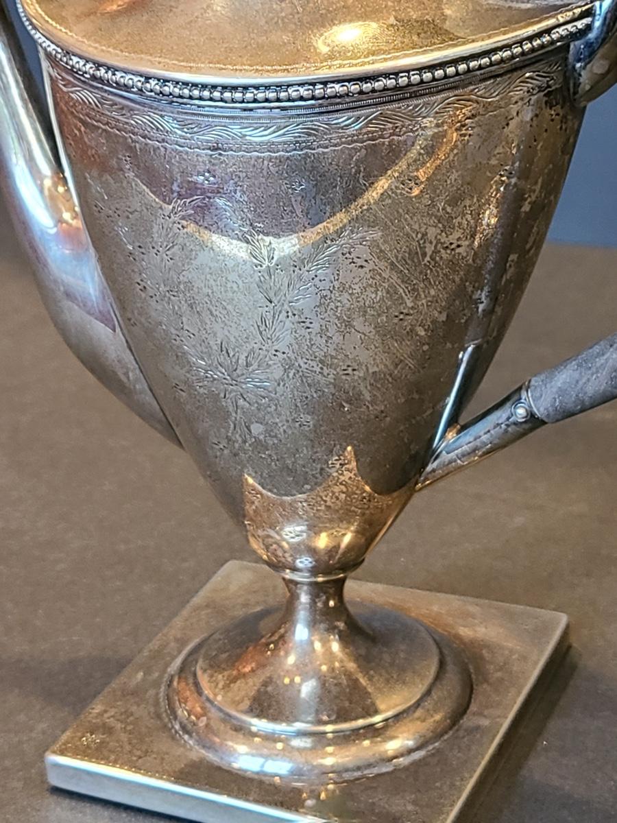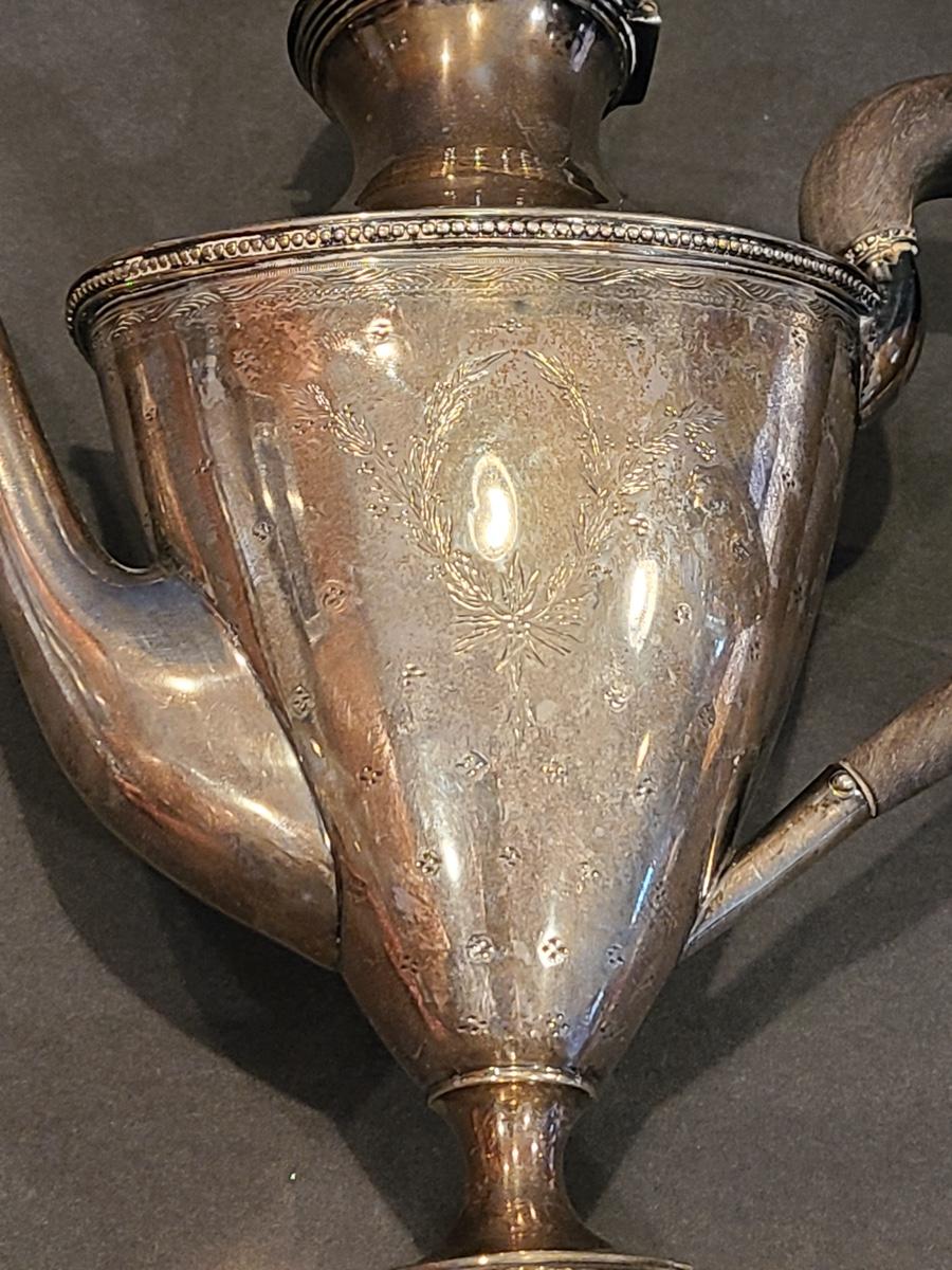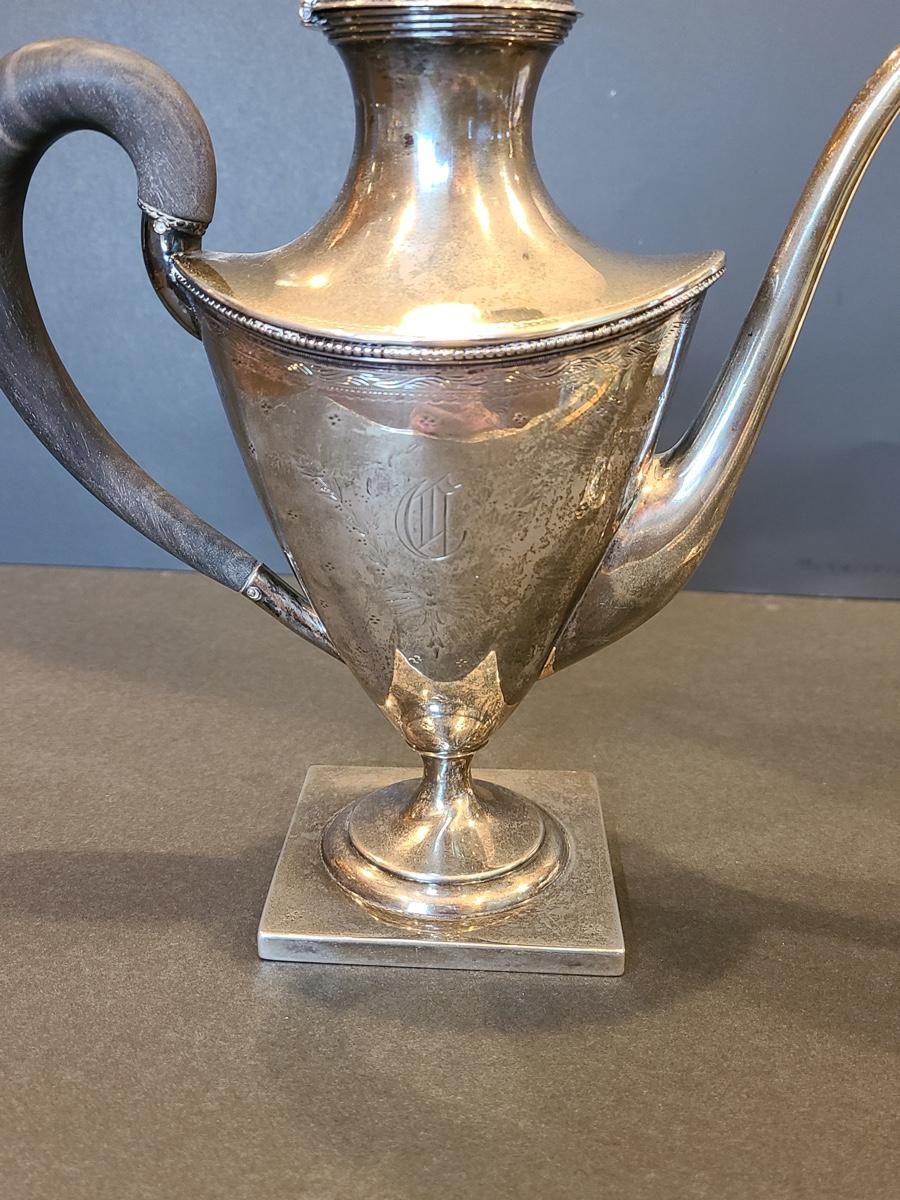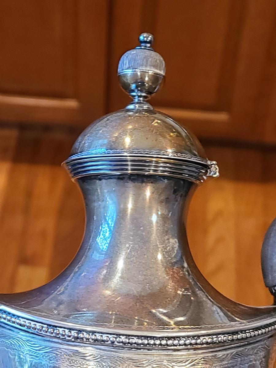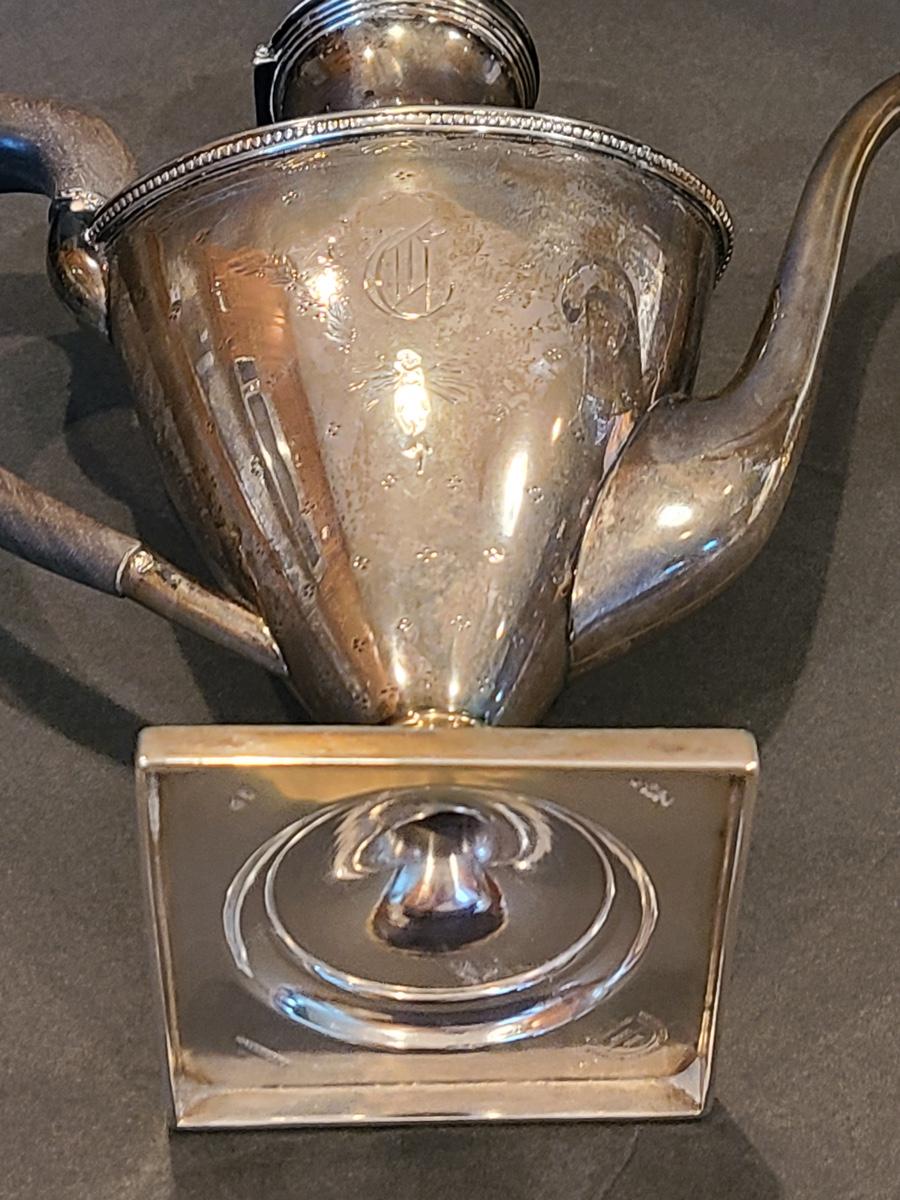 This antique/vintage set is gorgeous! It is hard to find sets like these still together. On one side of each piece is a wreath and on the other a "C", to some it also looks like a "D", but the client confirmed it is a C, but you could use either way. This set is older and sits just a little "cockeyed". These are solid sterling pieces, minus the handle and wood cap on the teapot. These are worth more than scrap due to their collectibility and age. These would look stunning polished! Please see all pictures as they are the best representation of the items, and show the condition and measurements if taken. You will need to bring your own packaging supplies.