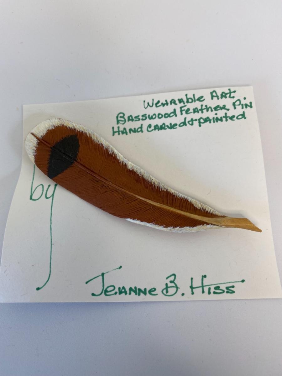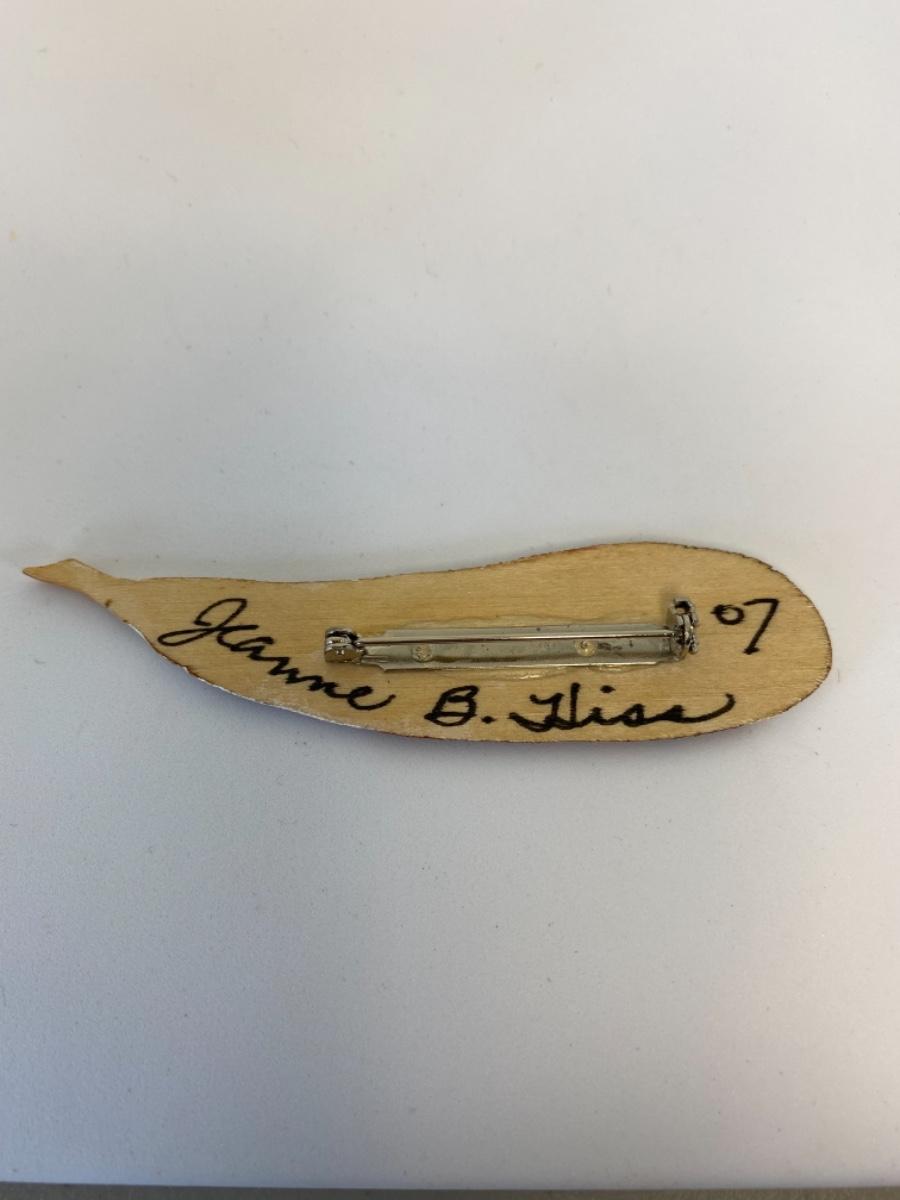 Jeanne B. Hiss Wearable Art Pin. Hand carved and painted. Signed on back of pin. 3 1/2” long.
