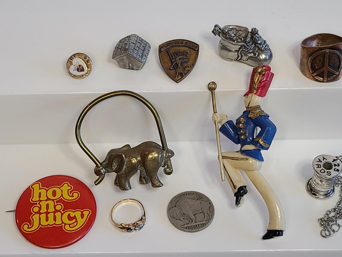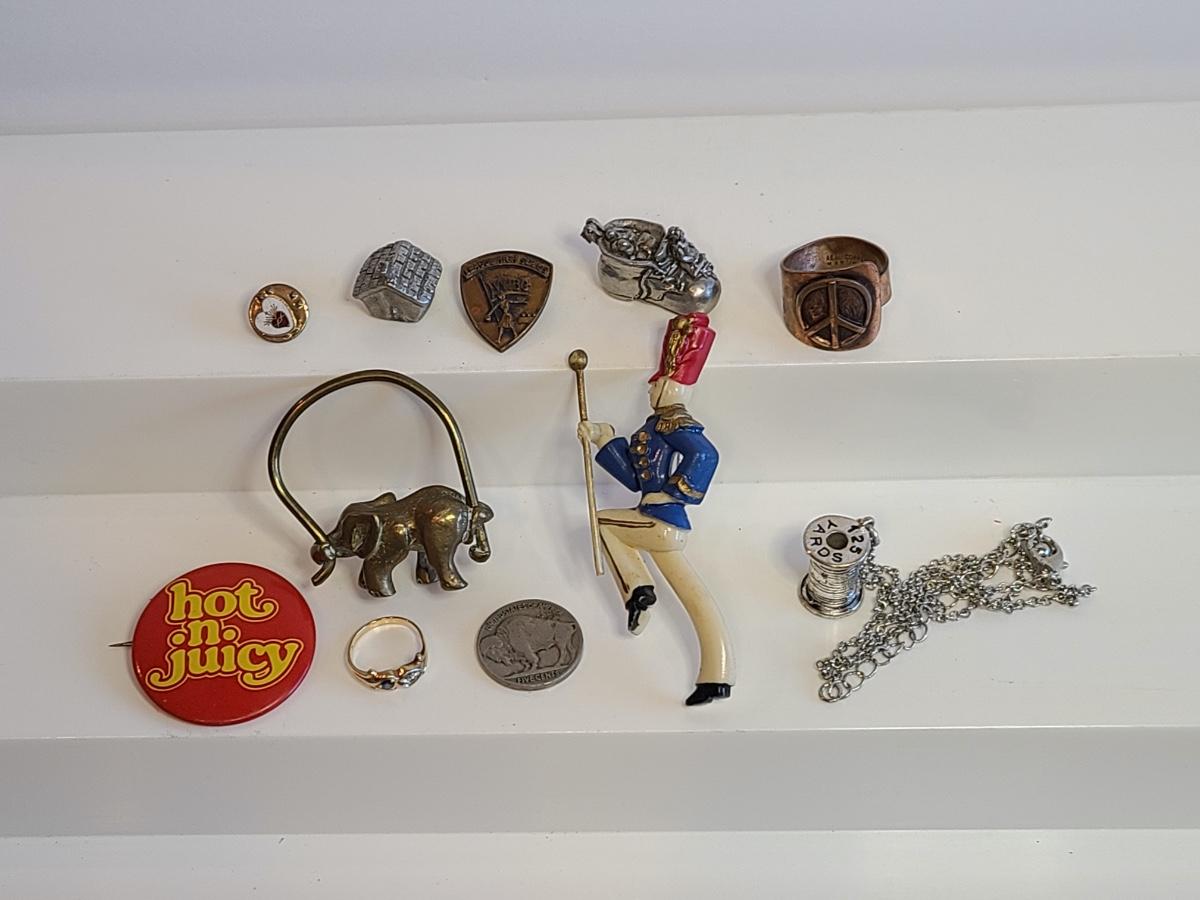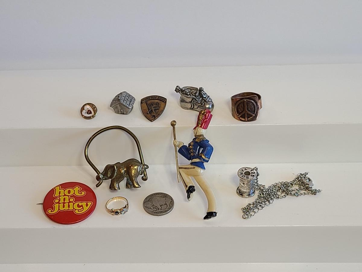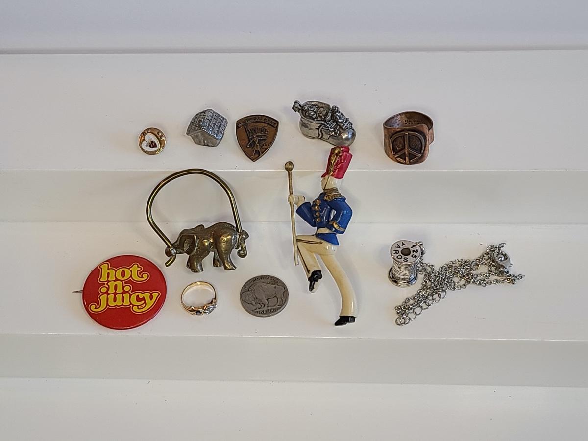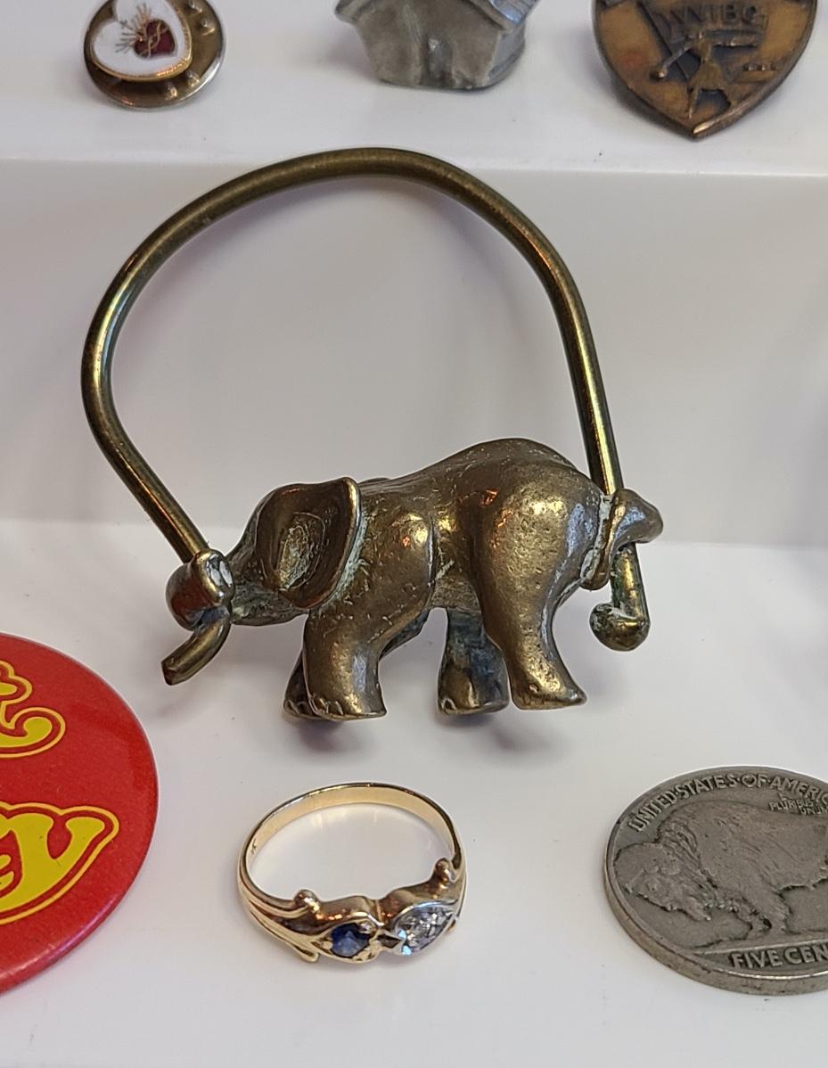Lot J12: Brass Elephant France Lock, 14k Baby Ring, Buffalo Nickel & More