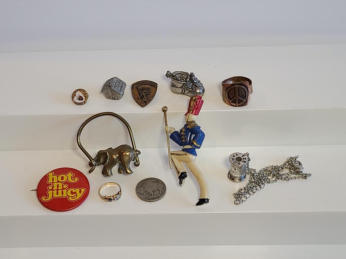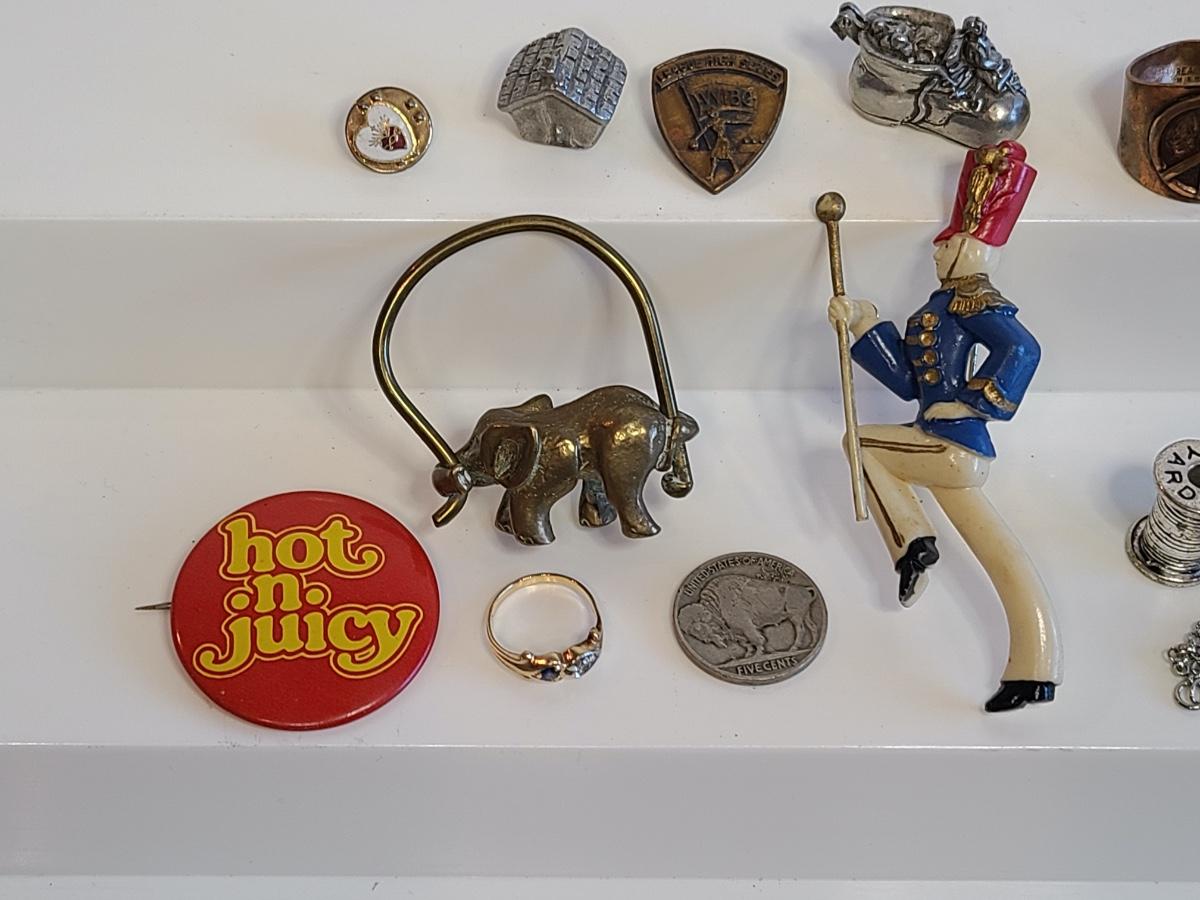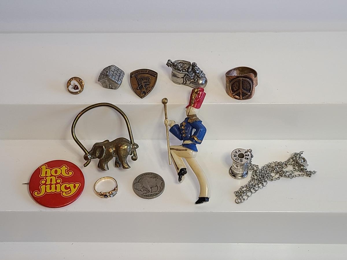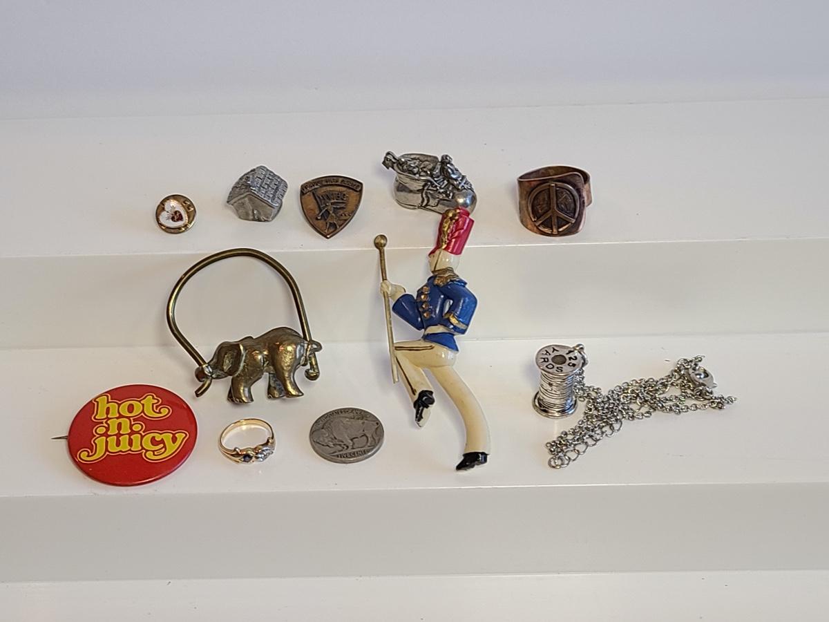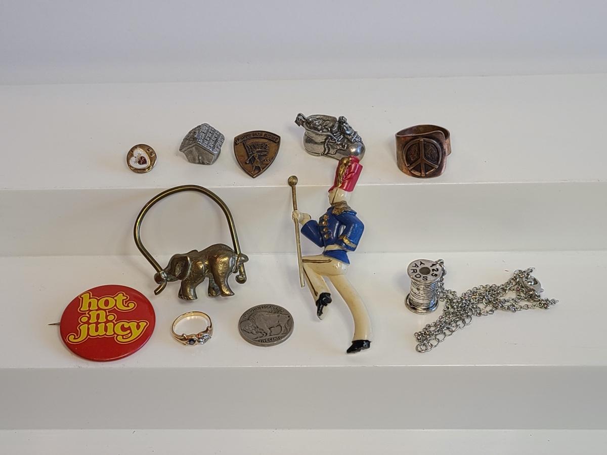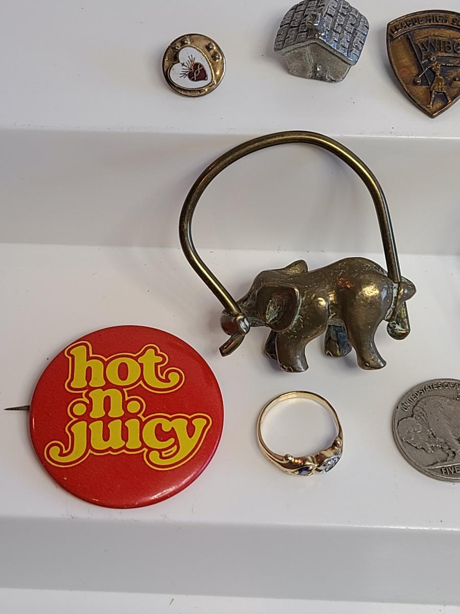 Lot J12: Brass Elephant France Lock, 14k Baby Ring, Buffalo Nickel & More